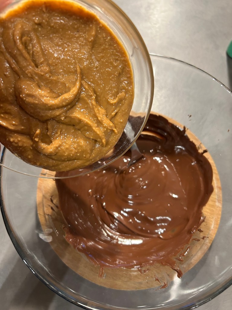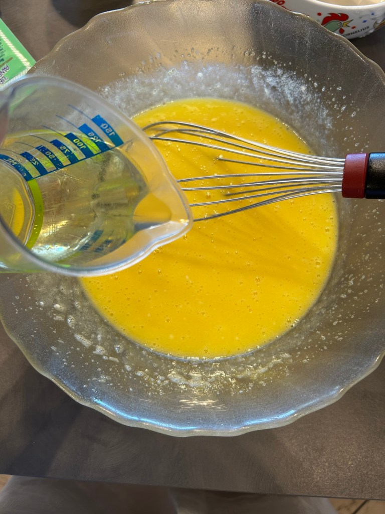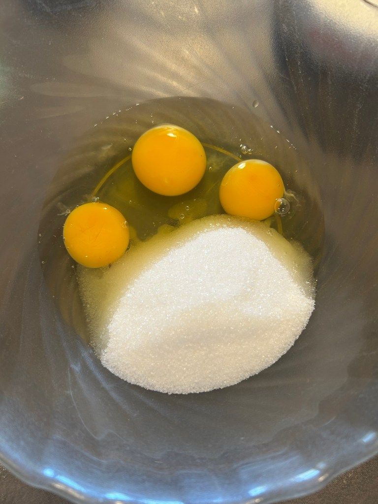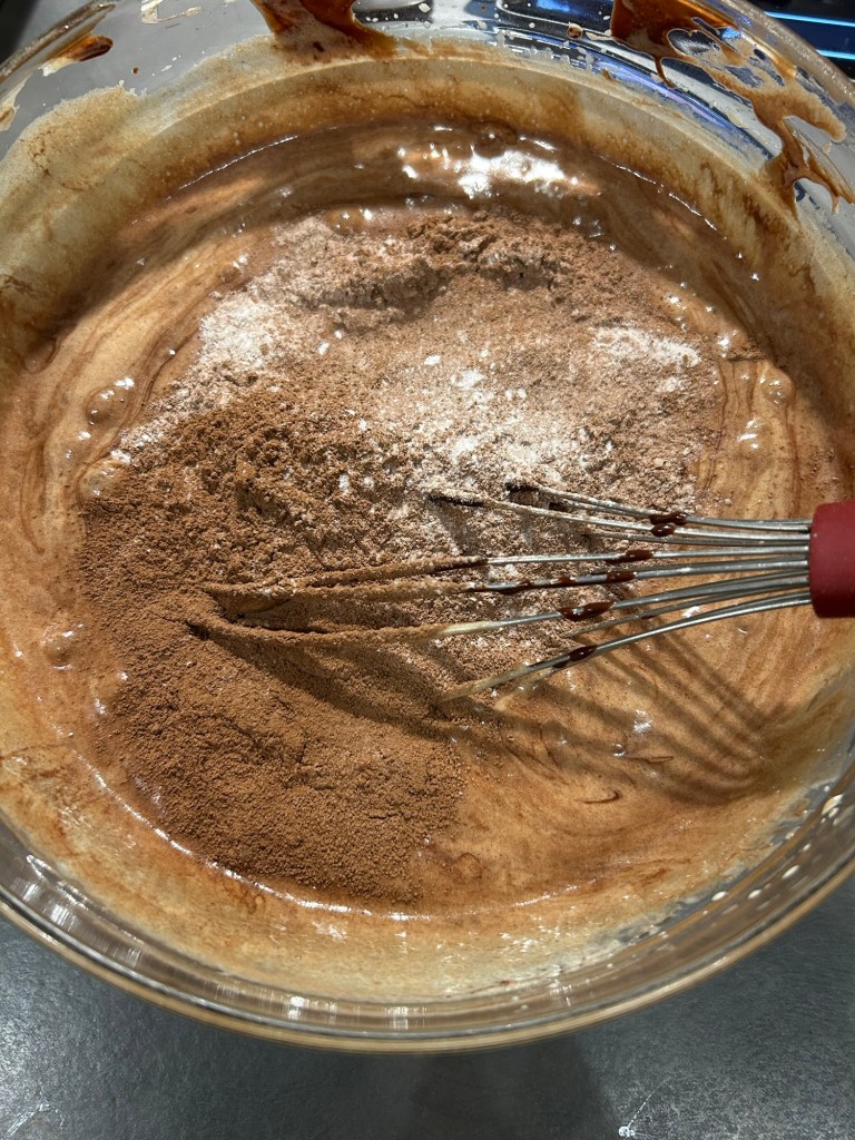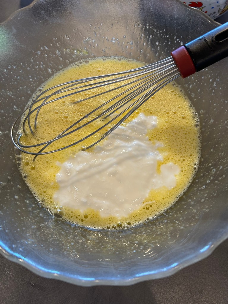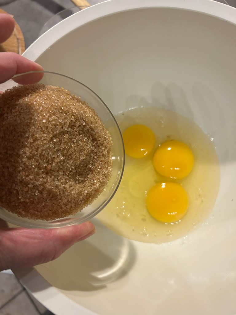 Aggiungo il cioccolato fuso alle uova e mescolo con la frusta a mano