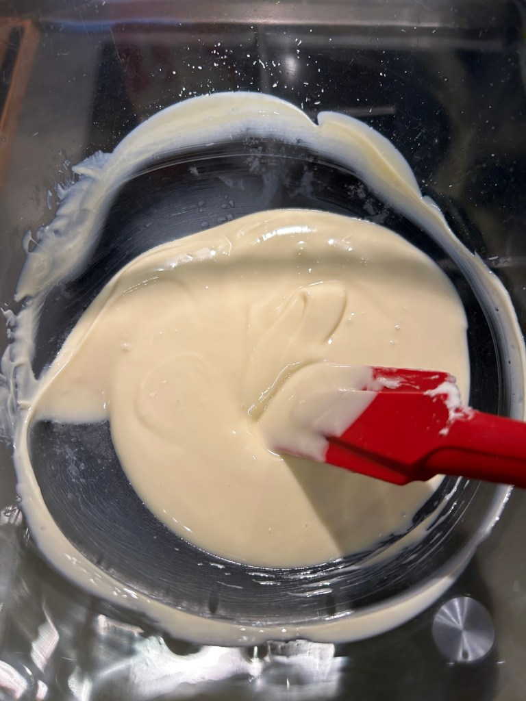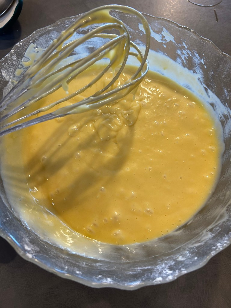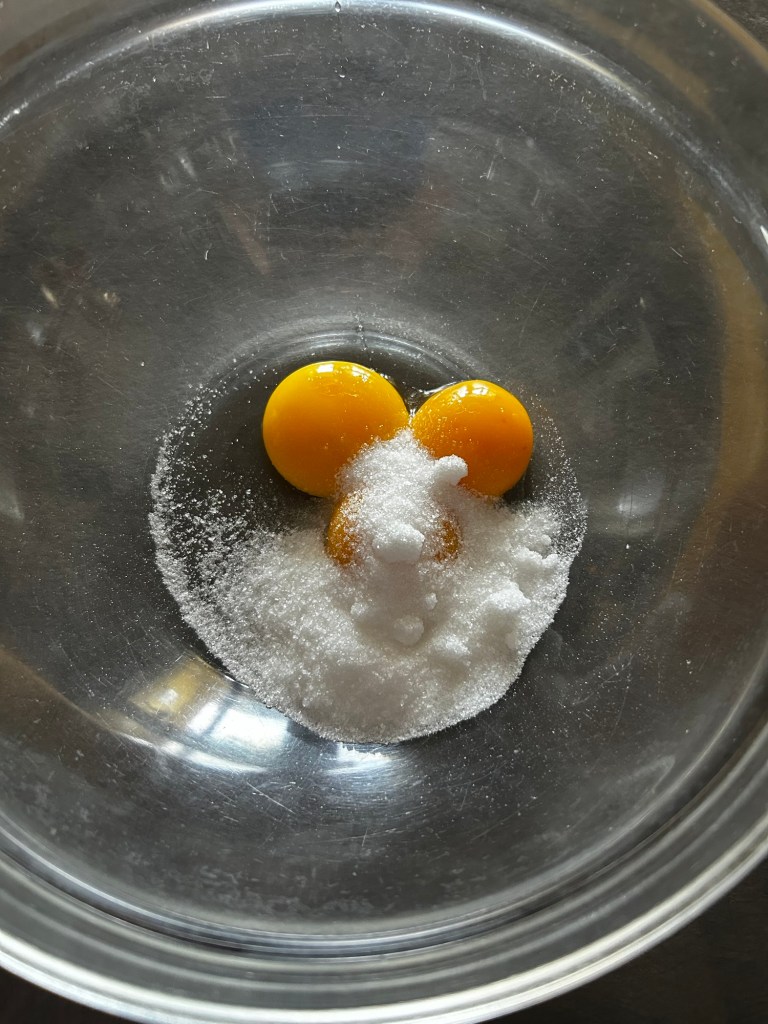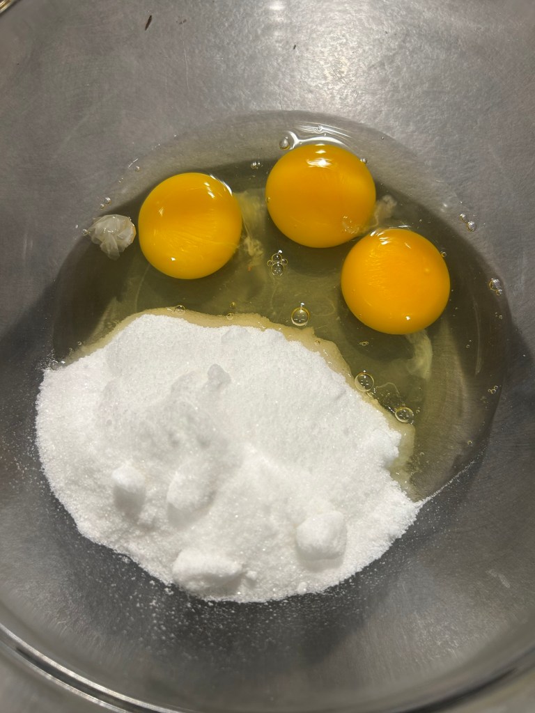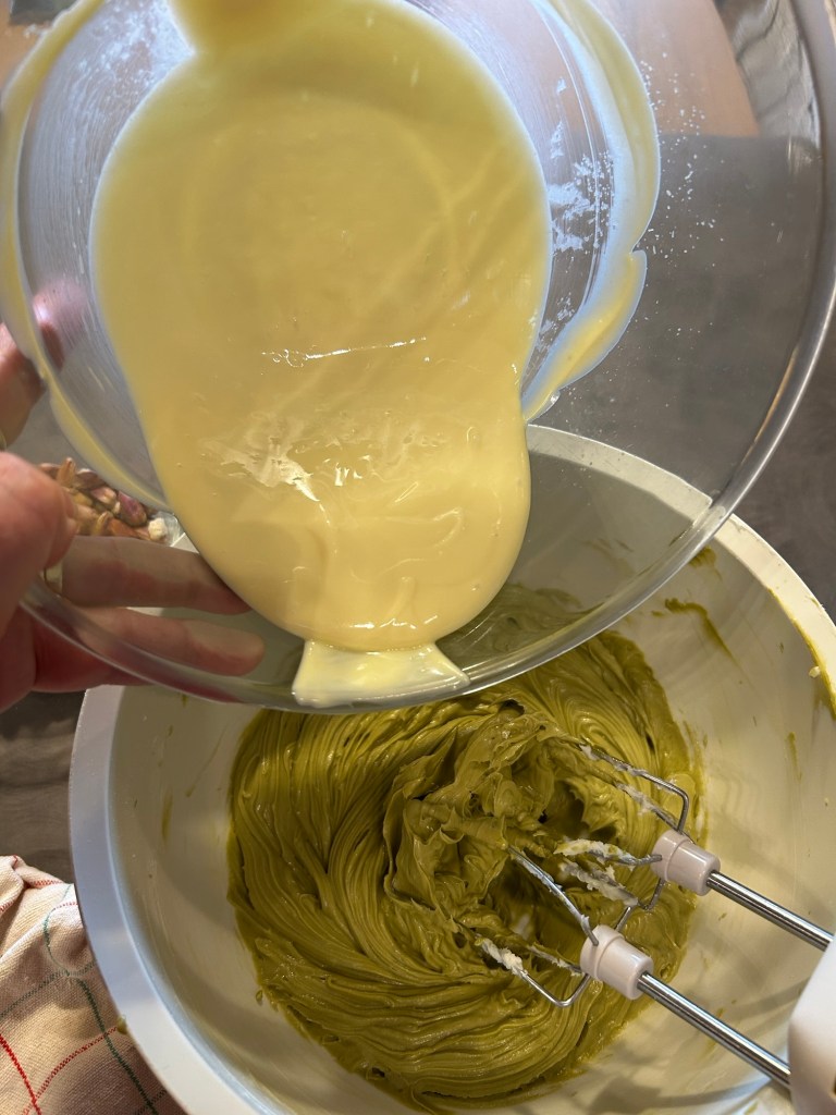 Aggiungo il cioccolato fuso alle uova e mescolo con la frusta a mano
