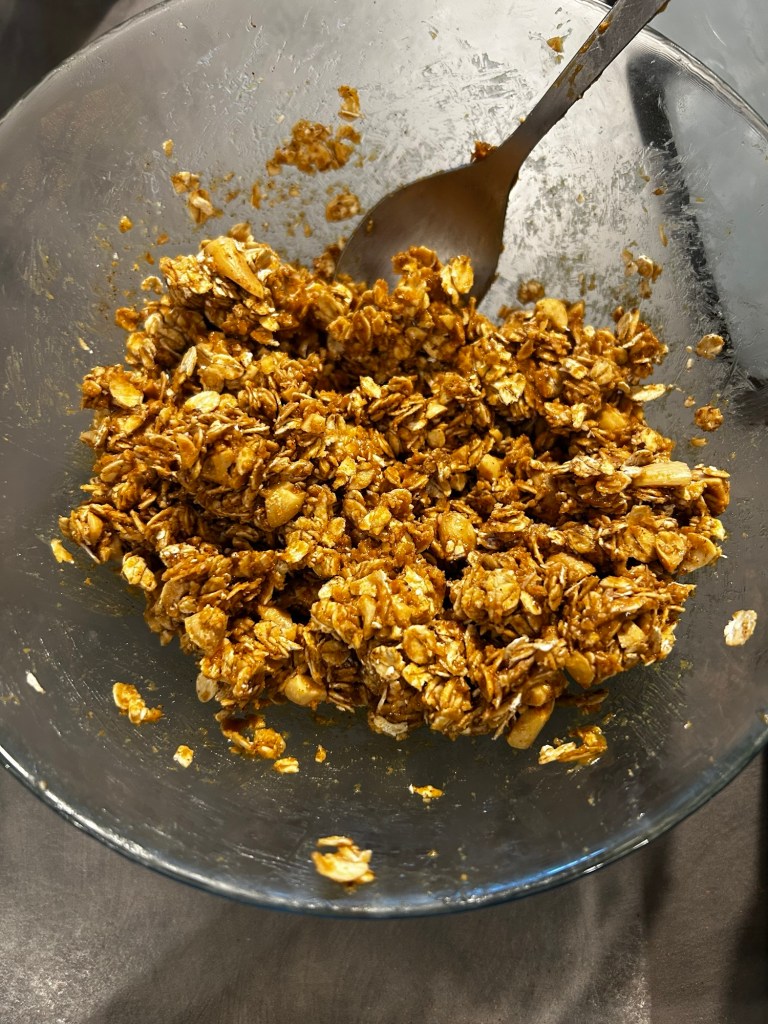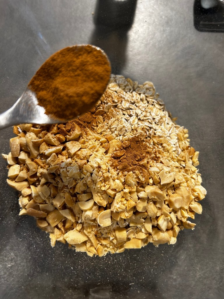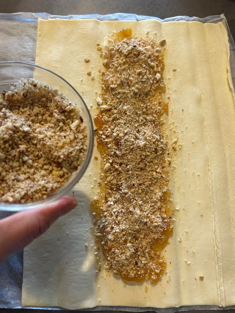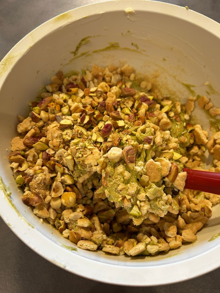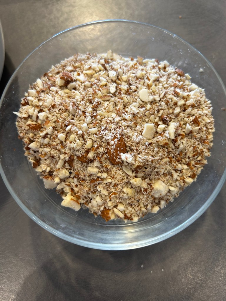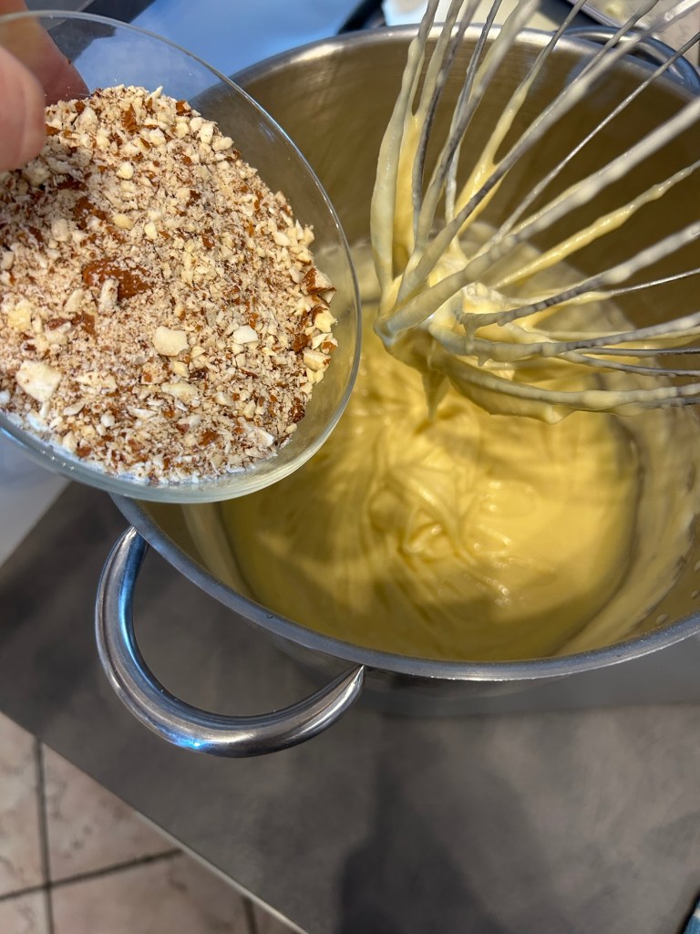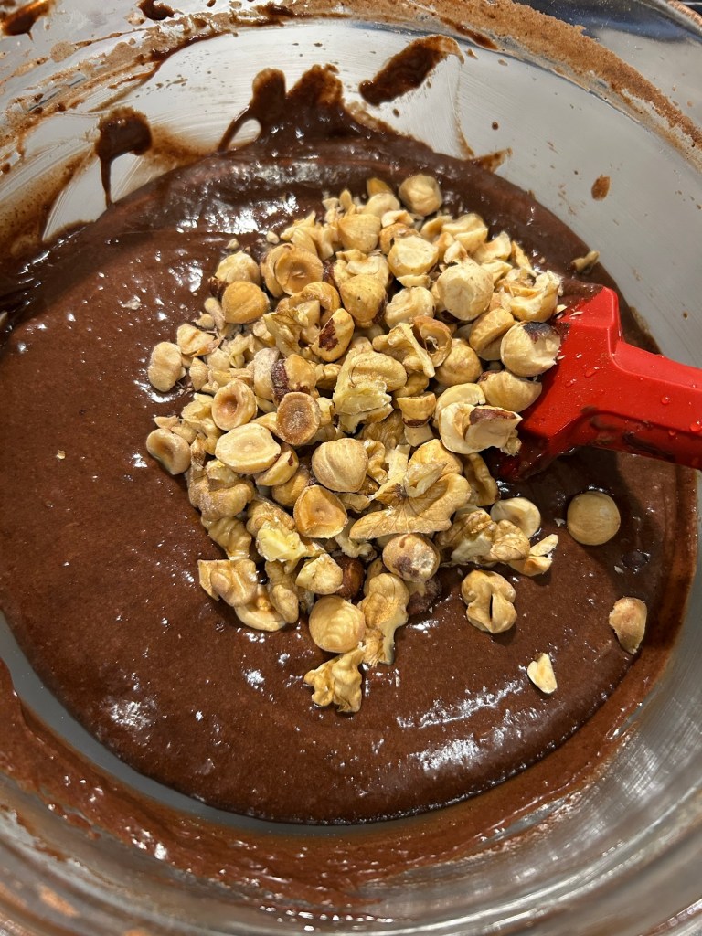 Aggiungo le nocciole intere o spezzettate leggermente, io ho messo anche qualche noce