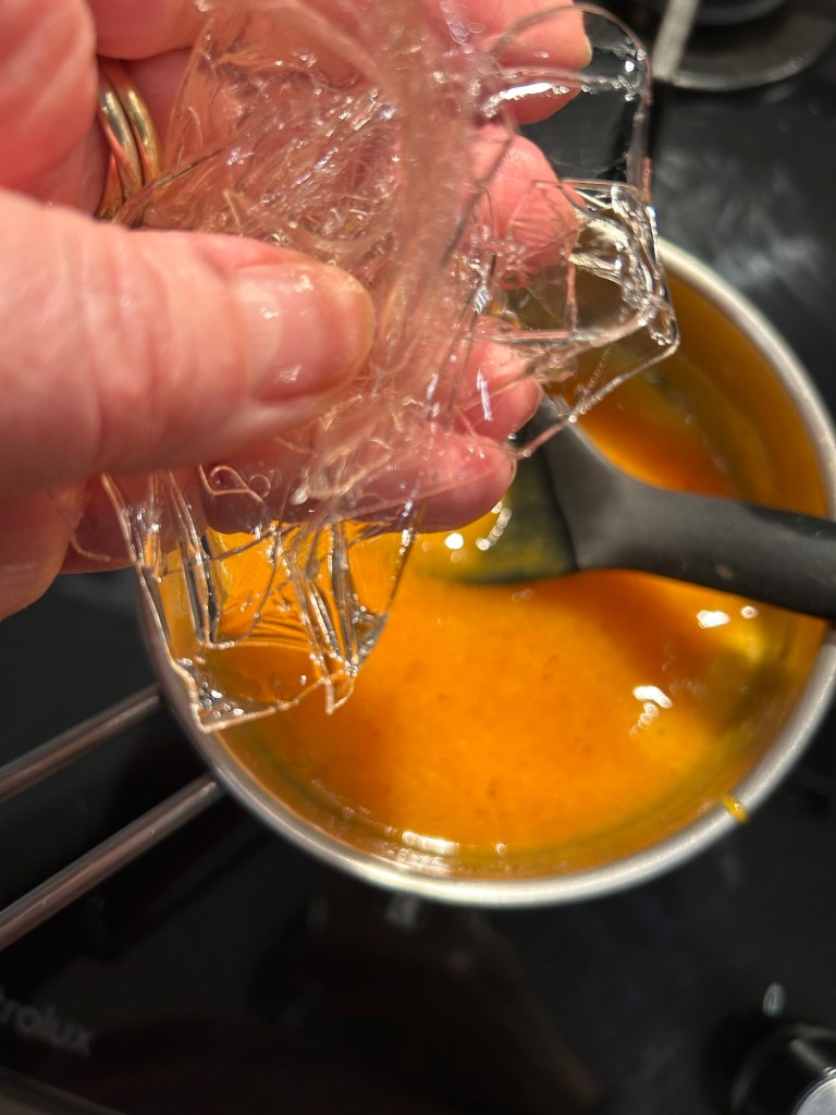 In un pentolino metto 2 cucchiai di acqua la scaldo e aggiungo la gelatina mescolando