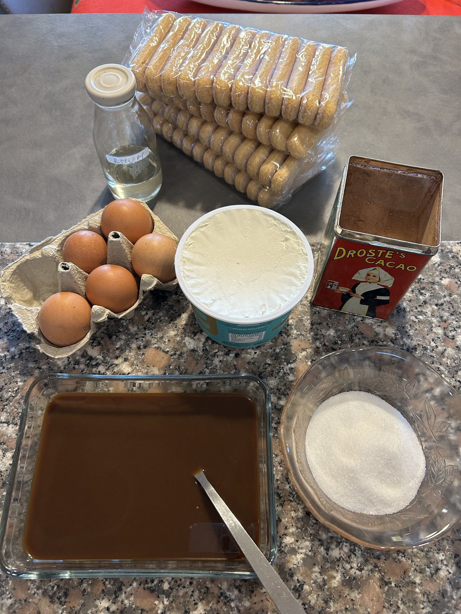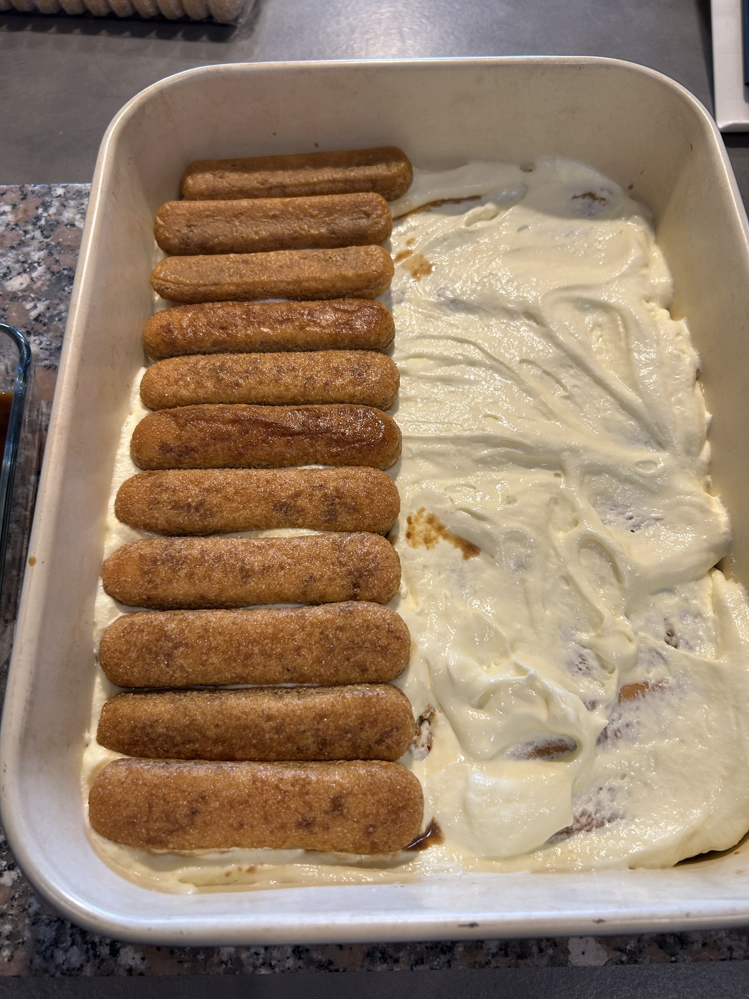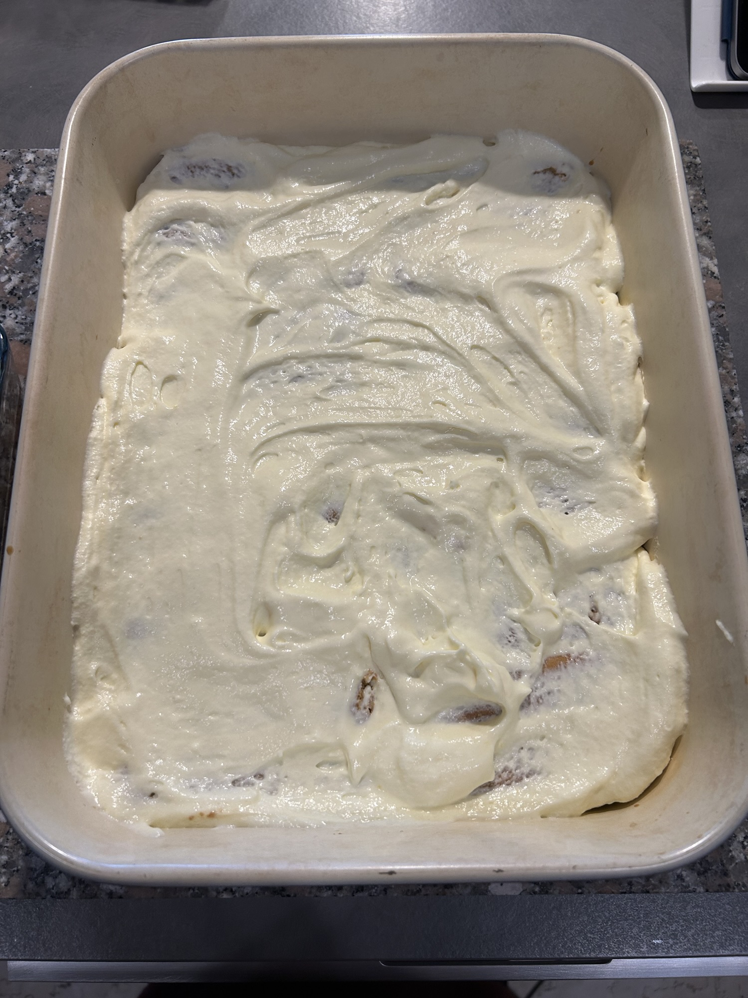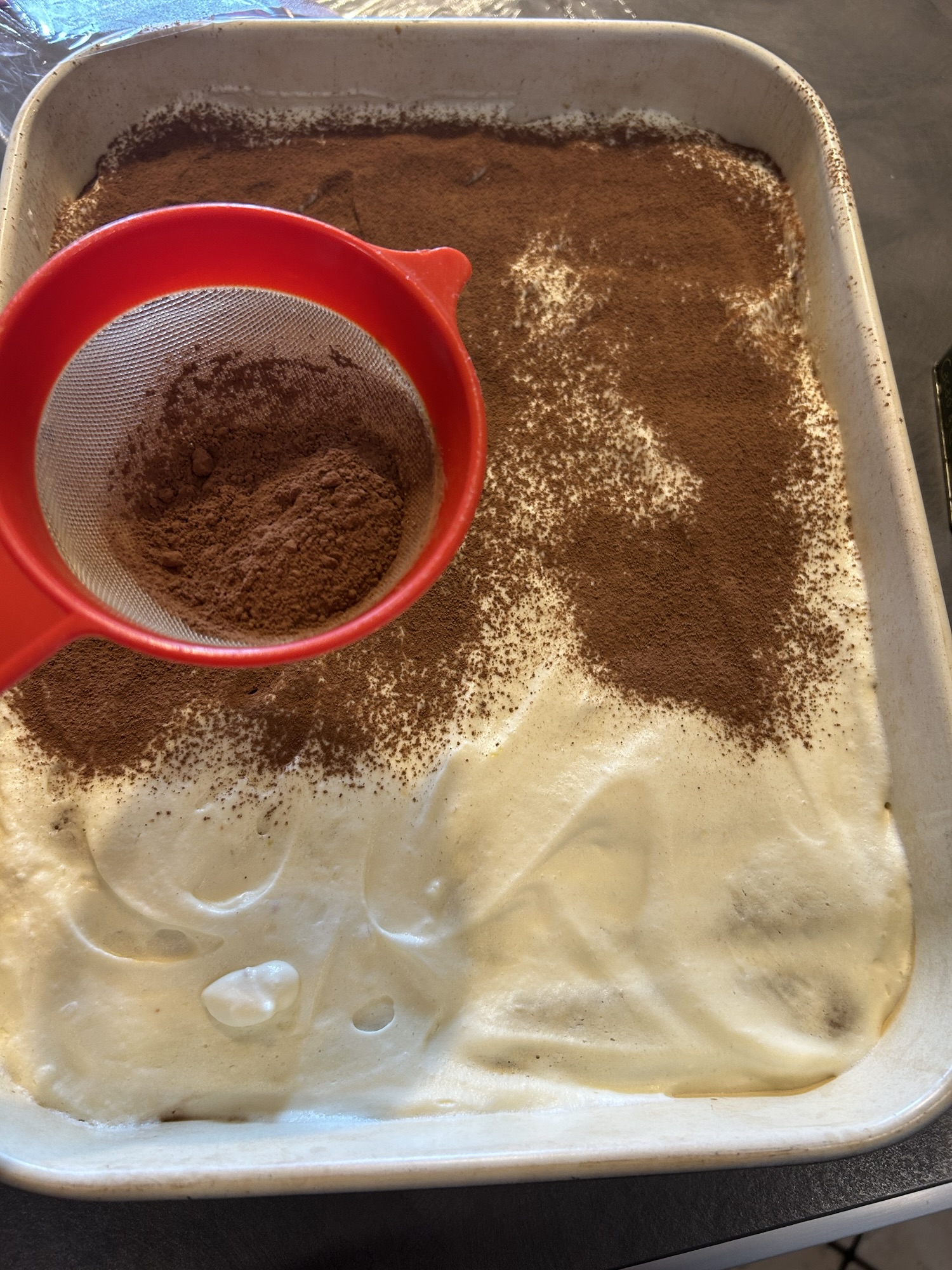 Aggiungo poi il resto mescolando delicatamente dal basso verso l’alto e ottengo una crema soffice e lisciaMetto un po’ di crema sul fondo e dopo aver inzuppato velocemente i savoiardi nel caffè faccio il primo stratoVerso metà della cremaMetto un altro strato di savoiardi inzuppatiRicopro con la crema rimasta, ricopro con pellicola o stagnola e metto per alcune ore in frigorifero, io lo faccio anche il giorno primaAl momento di servire cospargo con cacao amaro, non fatelo prima perché il cacao altrimenti si bagna, si possono preparare anche monoporzioni