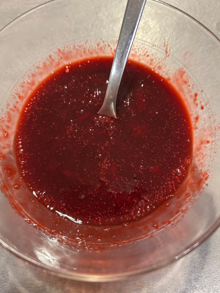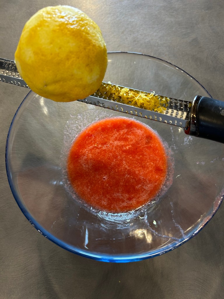 Le frullo con il mixer ad immersione riducendole in purea, le passo in un colino per eliminare i semini delle fragole e aggiungo la buccia del limone grattugiata