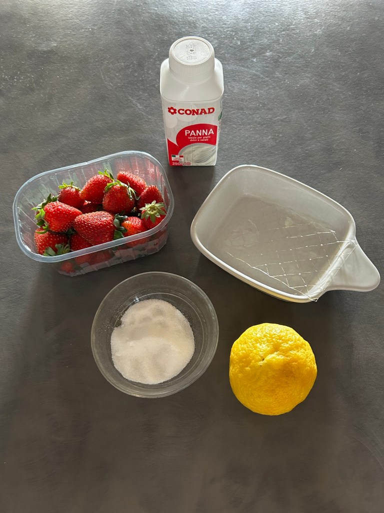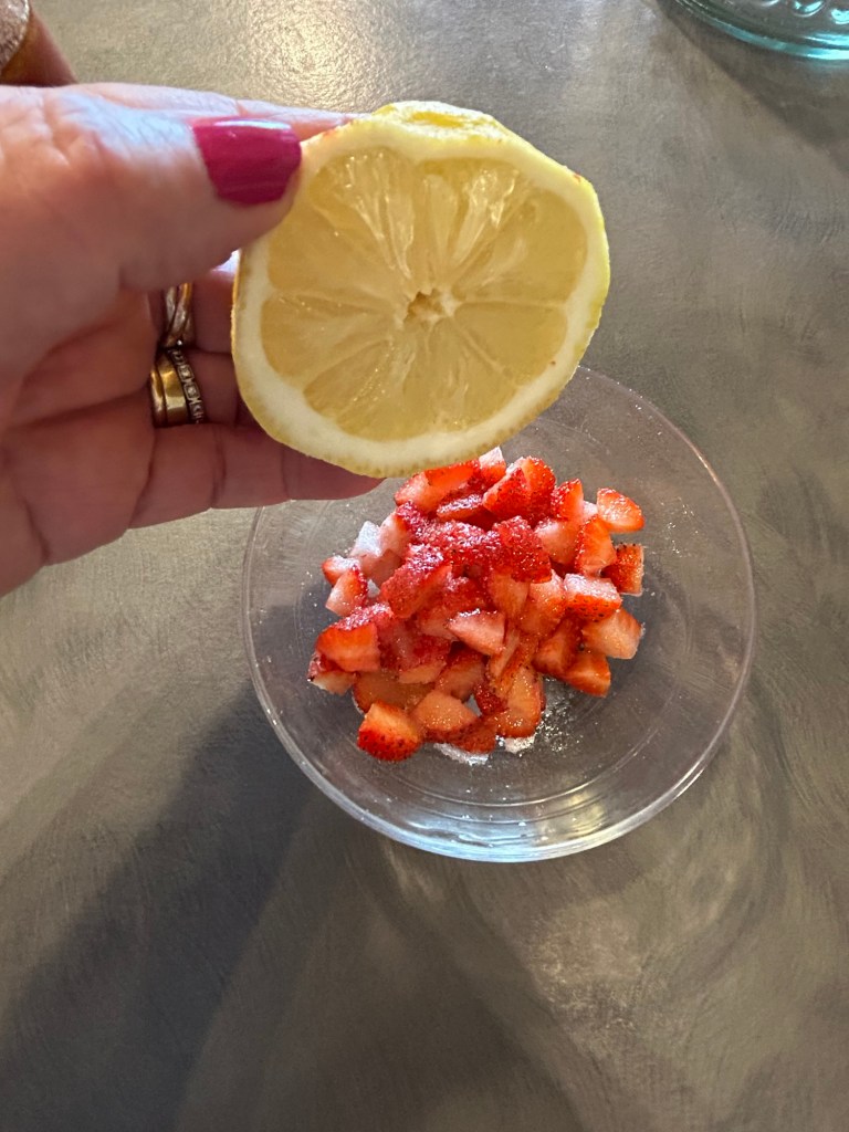 Al momento di servirle ho distribuito delle fragole che ho tagliato a cubetti con un cucchiaio di zucchero e qualche goccia di limone