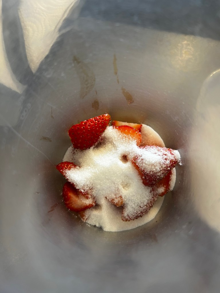 Taglio le fragole e le metto nel bicchiere con lo zucchero