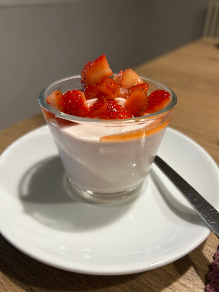 Buona fresca, con fragole dolci e saporite un ottimo fine pasto, io ho preparato 5 bicchierini, se volete delle porzioni più grandi raddoppiate la dose