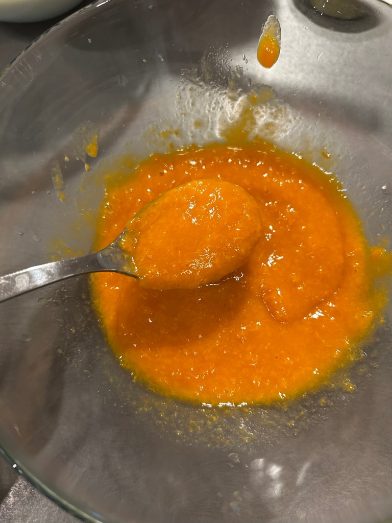In un pentolino metto 3/4 cucchiai di polpa di cachi presa dai 250 gr per la mousse, aggiungo lo zucchero e porto sul fuoco dolce mescolando e scaldandola bene