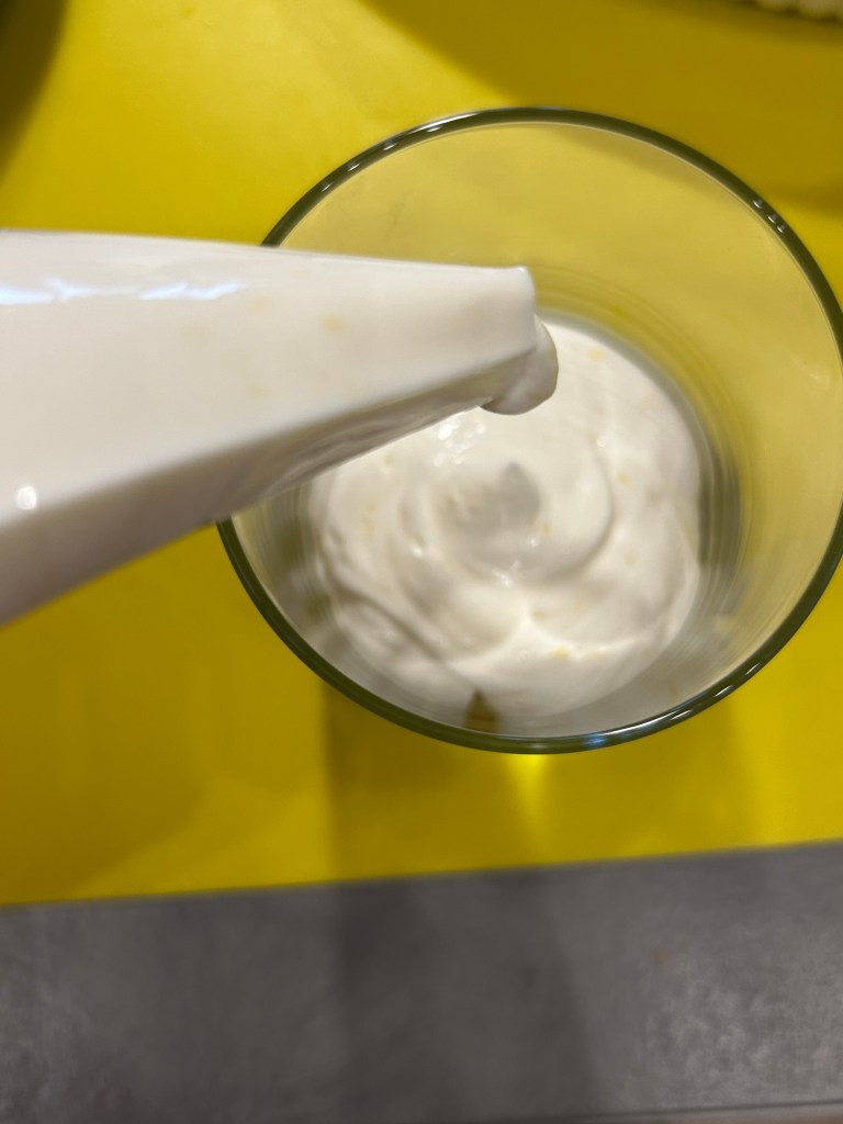 Termino con un ciuffetto di crema, copro con pellicola e metto in frigorifero per alcune ore oppure tutta la notte, al momento di servire decoro con un ciuffetto di menta
