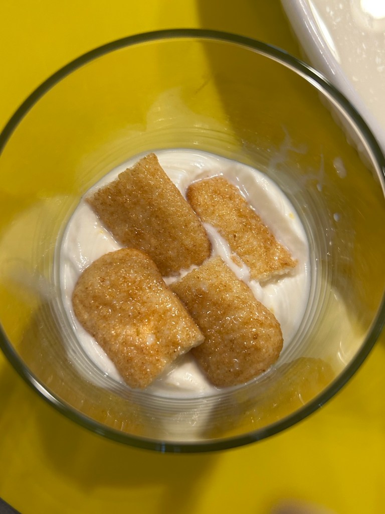 In una ciotola verso il latte, il limoncello e lo sciroppo e mescolo adesso inzuppo velocemente 2 pavesini e li metto sul fondo del bicchiere