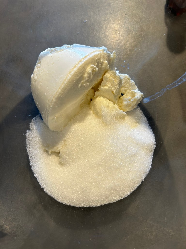 In una ciotola più grande monto le uova con lo zucchero con le fruste elettricheDeve risultare un composto gonfio e spumoso, aggiungo la ricotta e continuo a montareVerso il brandy, se non vi piace potete sostituirlo con del succo di arancio e continuo a montareLa crema deve essere liscia ed omogenea