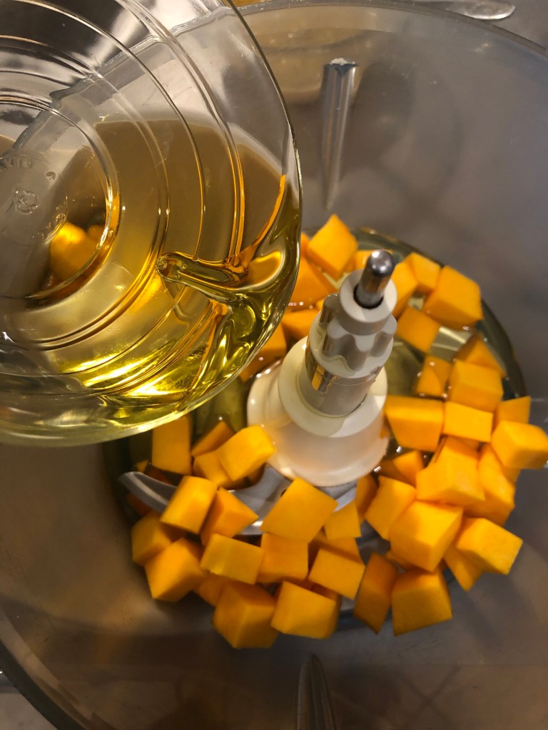 Tolgo la buccia alla zucca, elimino i semi e i filamenti e la taglio a fette di circa 1 cm