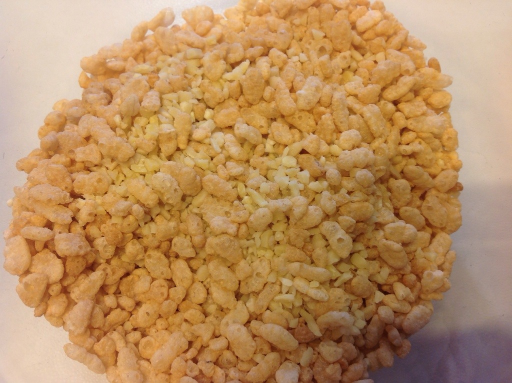 Mescolare il riso soffiato con la granella mettere su carta forno e scaldateli per un minuto in microonde o a 100 gradi nel forno per qualche minuto
