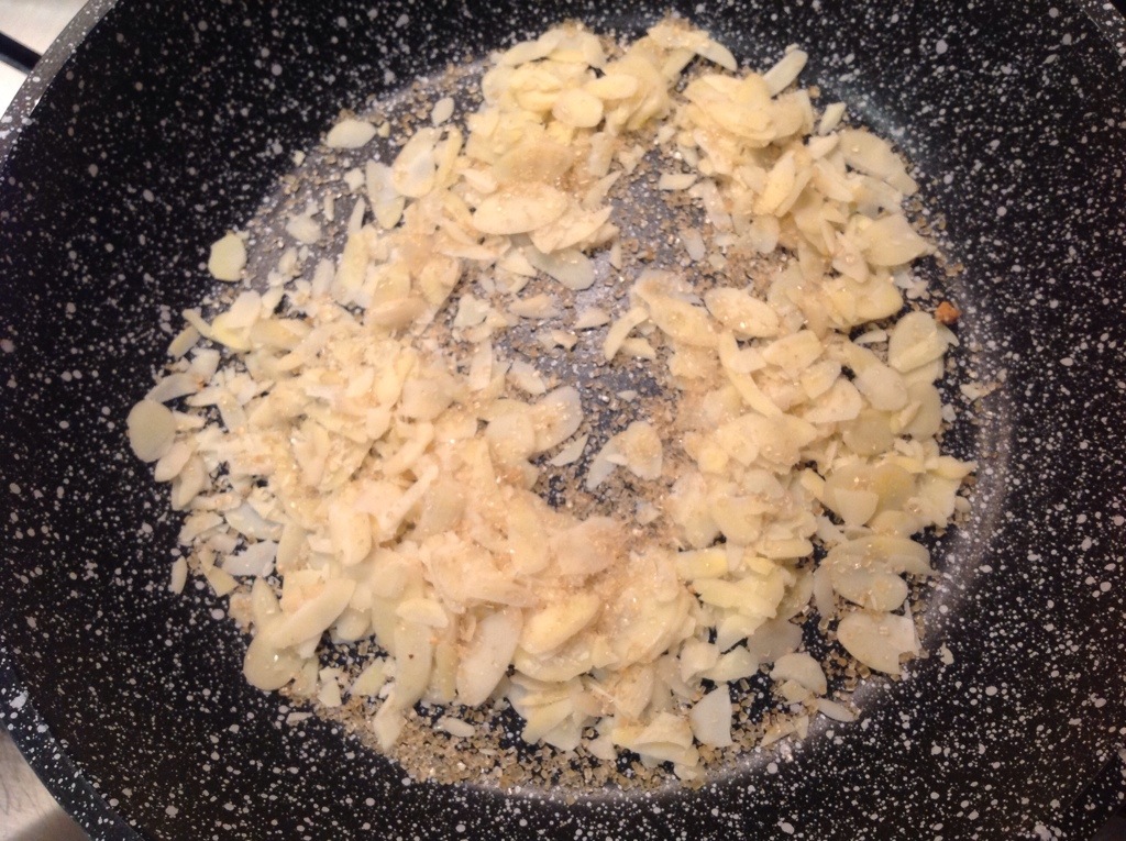 In un pentolino faccio tostare le scaglie di mandorle con un cucchiaio di zucchero di canna