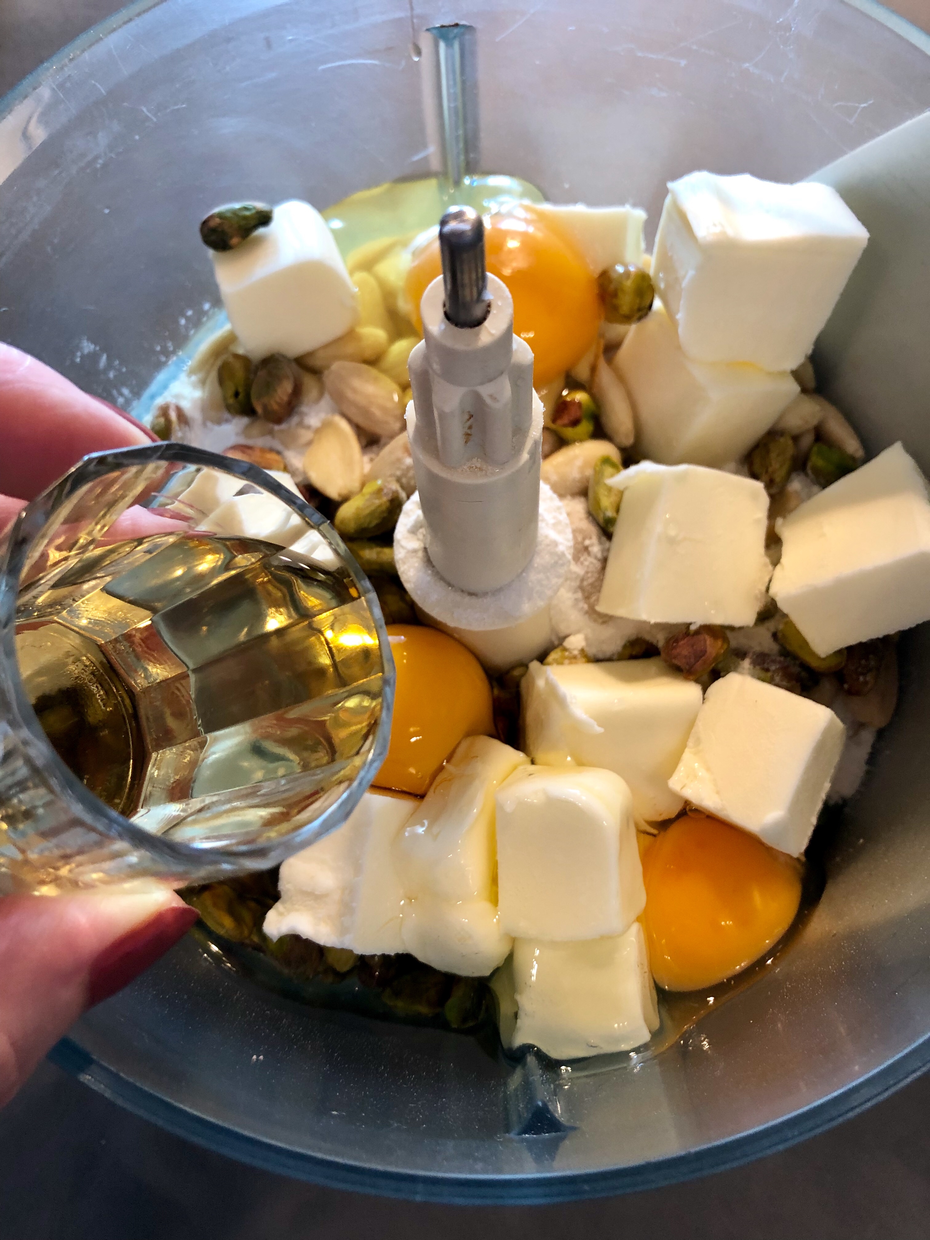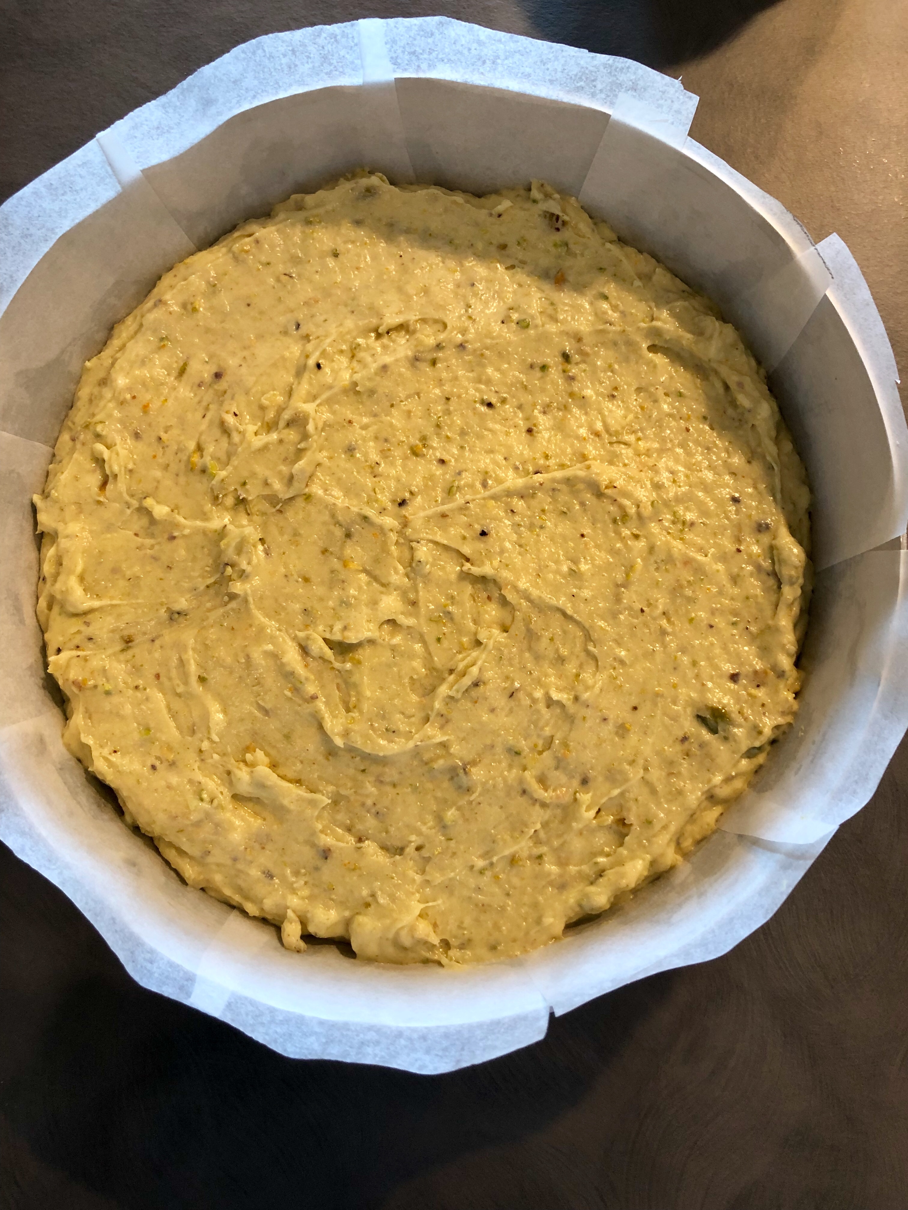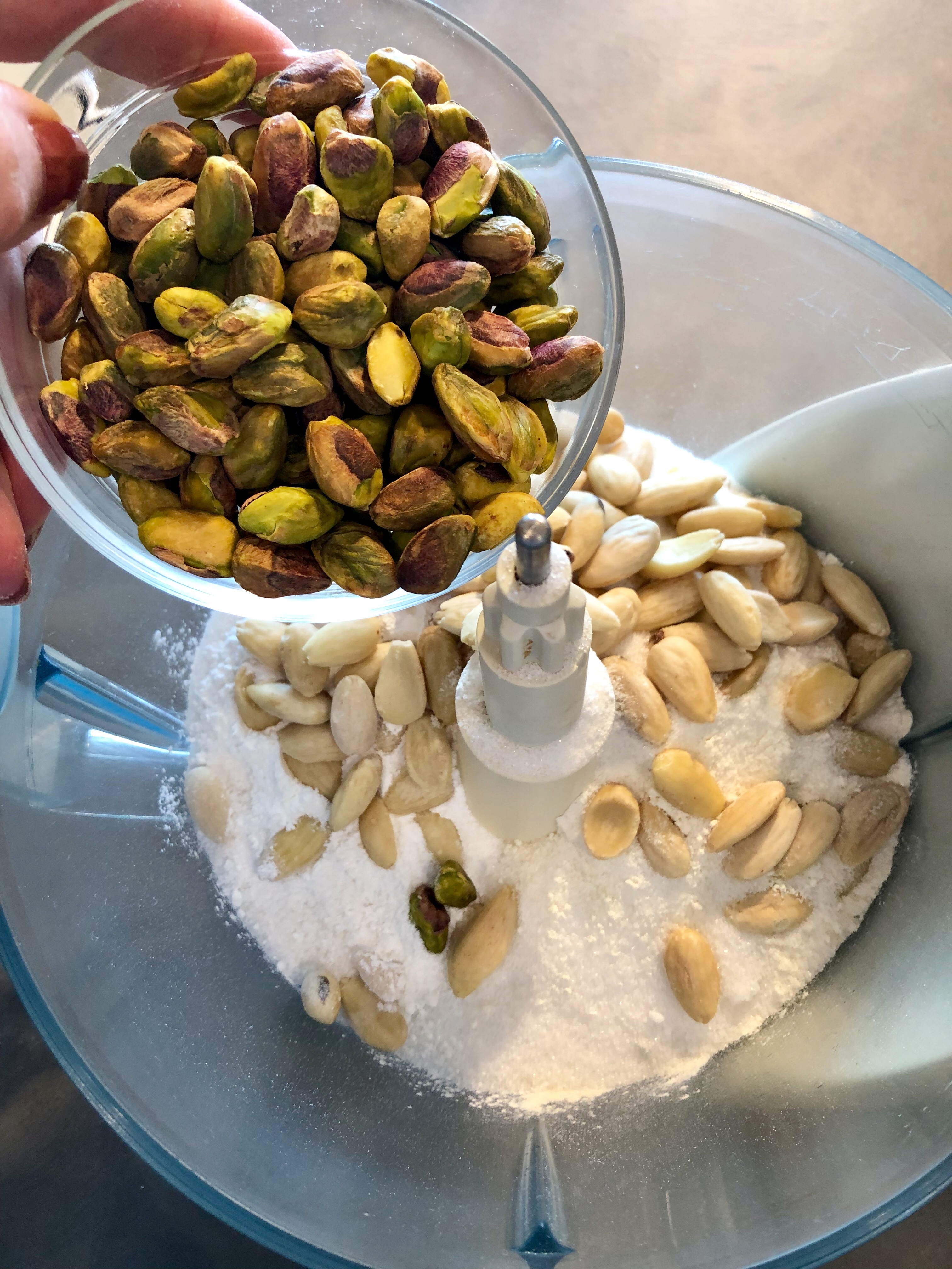 Trito grossolanamente i pistacchi che ho tenuto da parte e li distribuisco sulla superficie