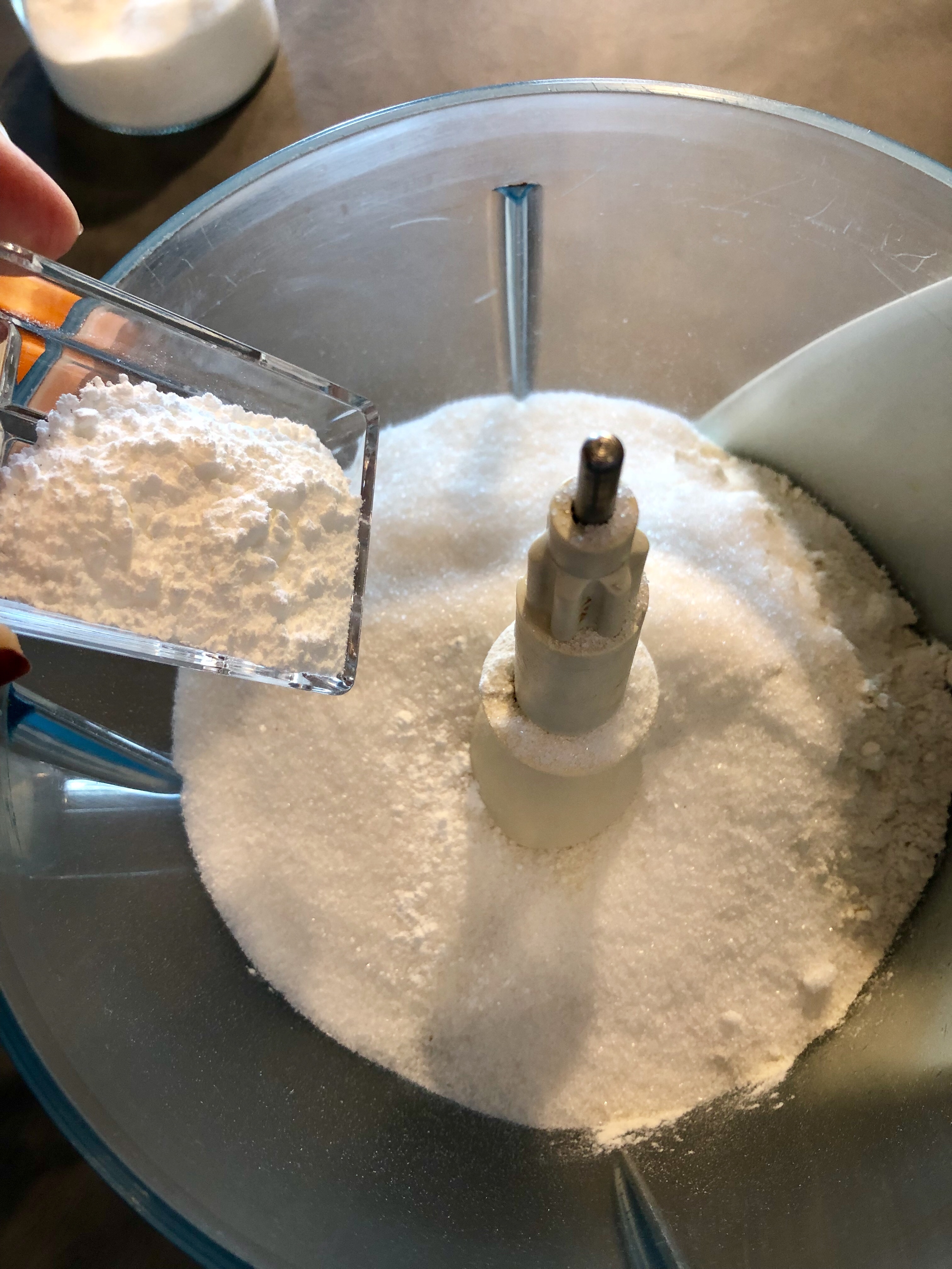 Nel mixer inserisco la farina, lo zucchero, il lievito e un pizzico di sale