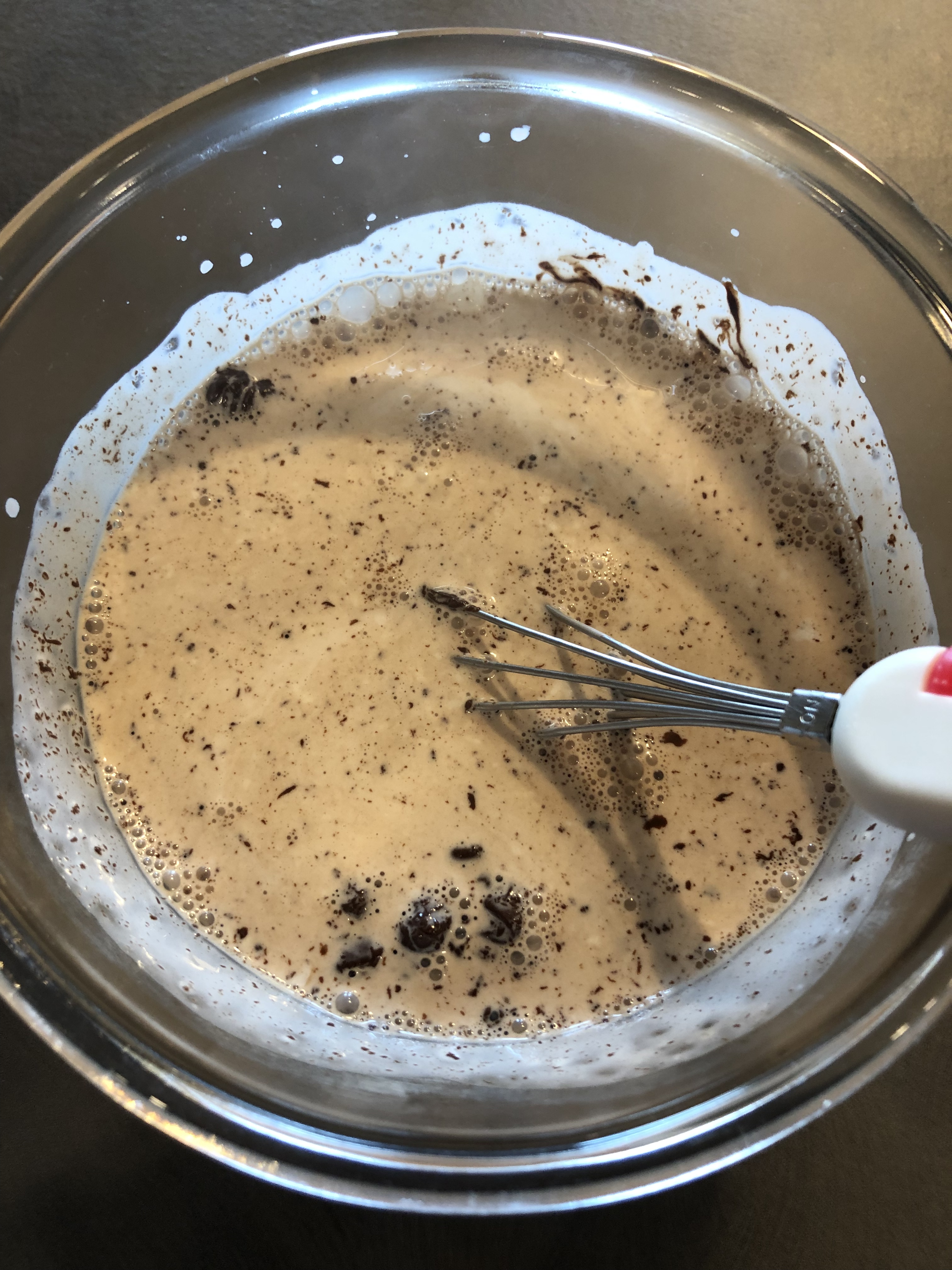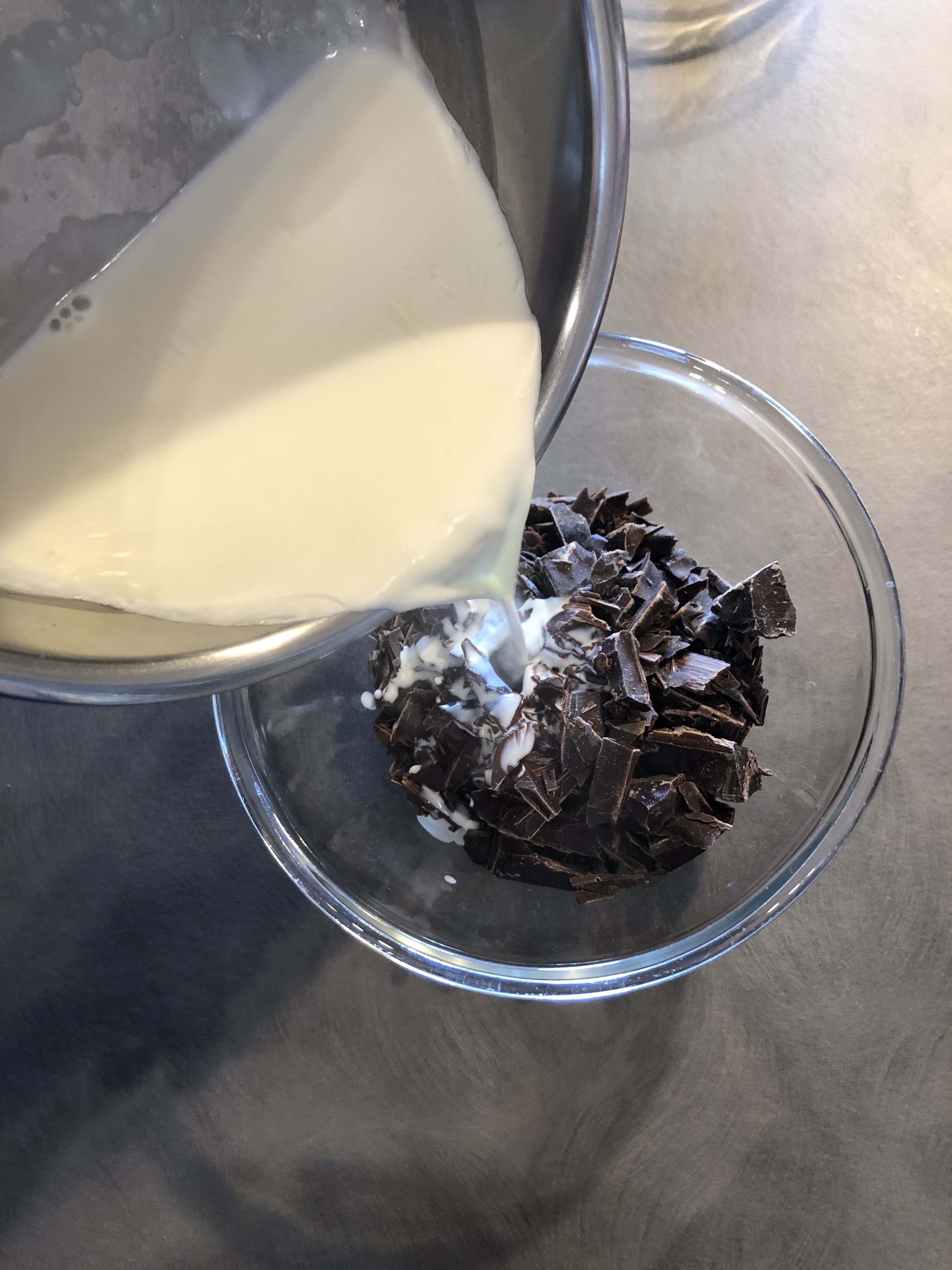 Preparo la glassa, trito il cioccolato e lo metto in una ciotola, aggiungo la panna che ho scaldato fino a sfiorare il bollore