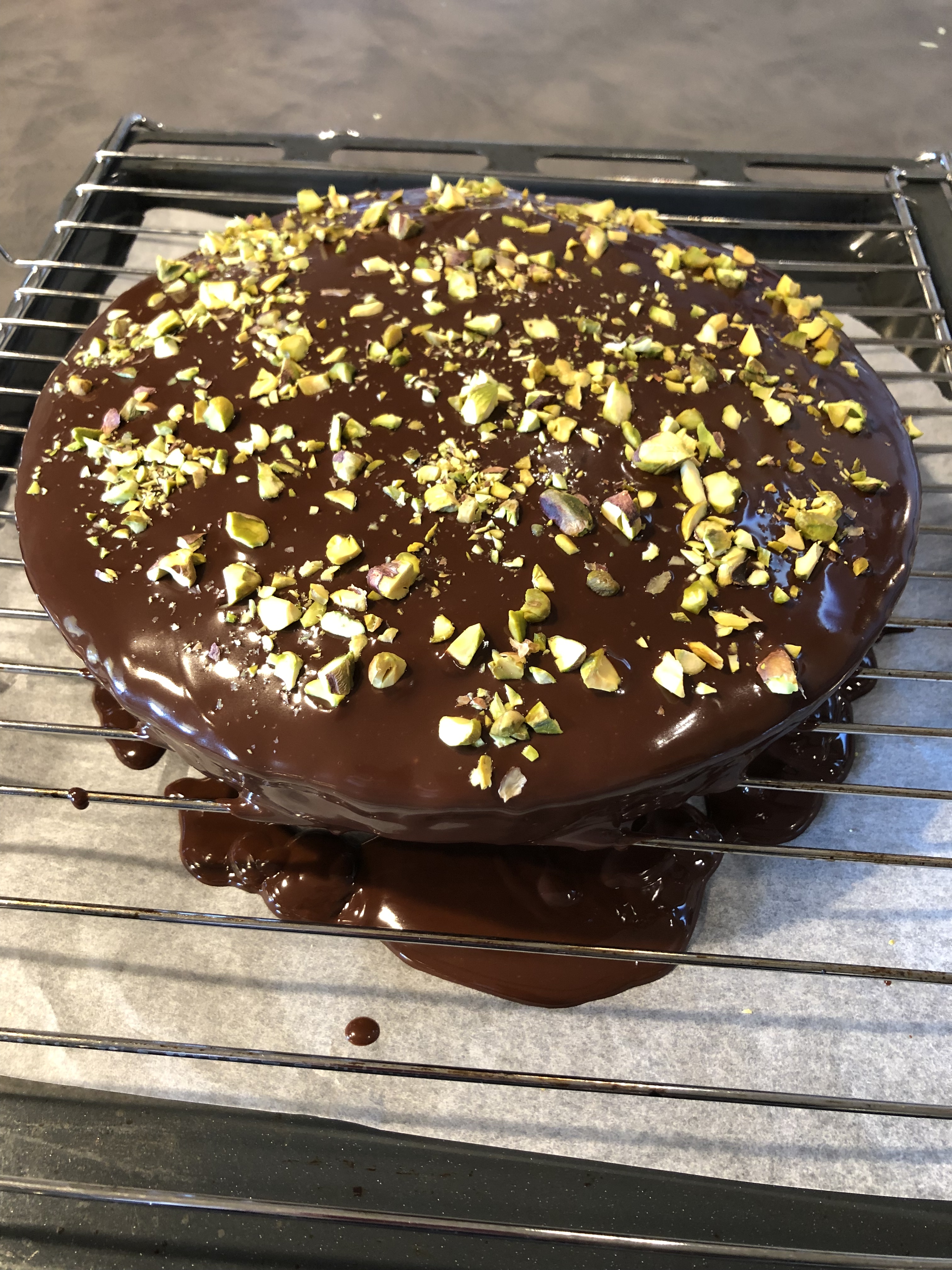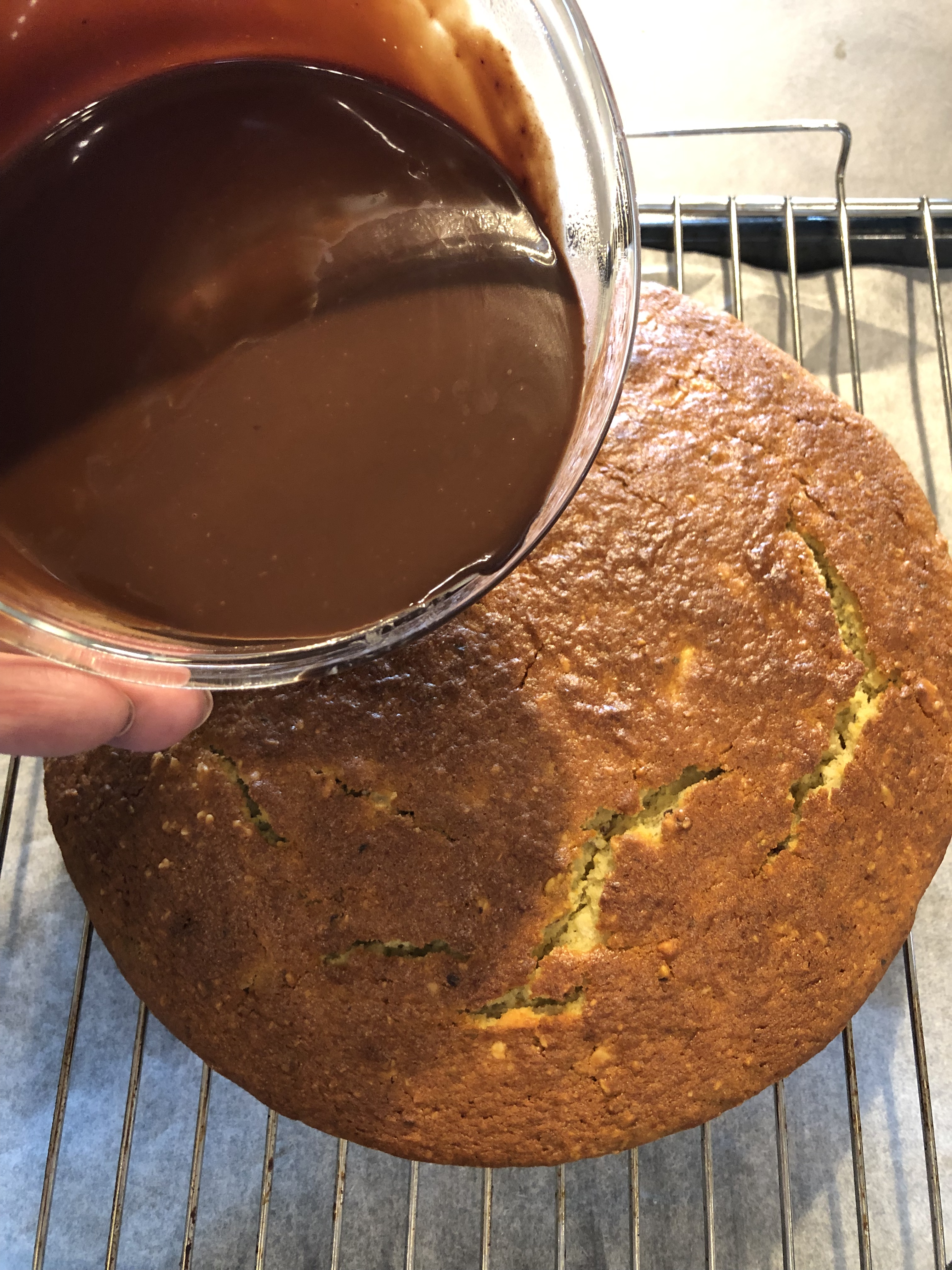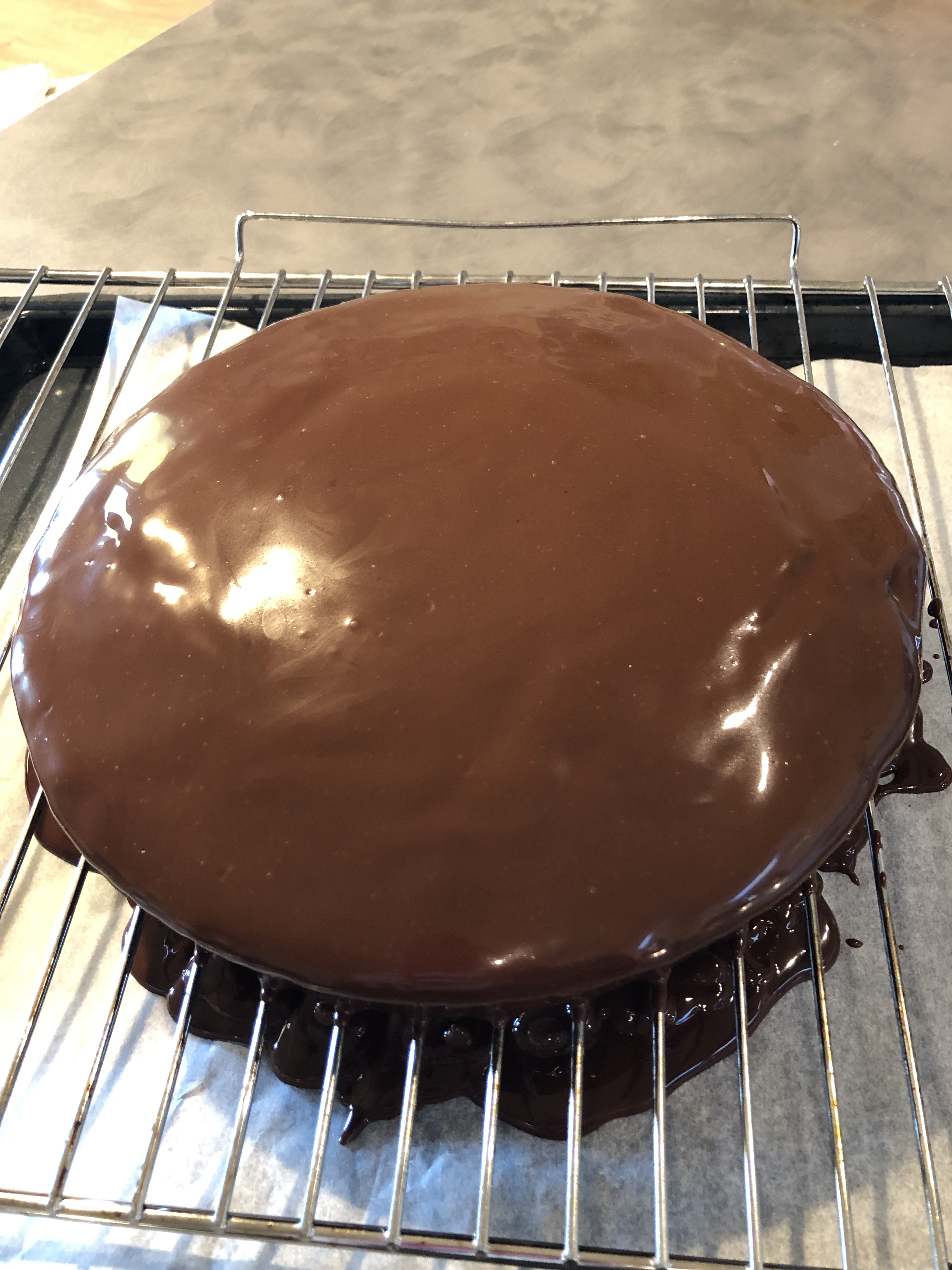 Dispongo la torta su una grata del forno con sotto un foglio di carta forno e verso la glassa dal centro su tutta la superficie