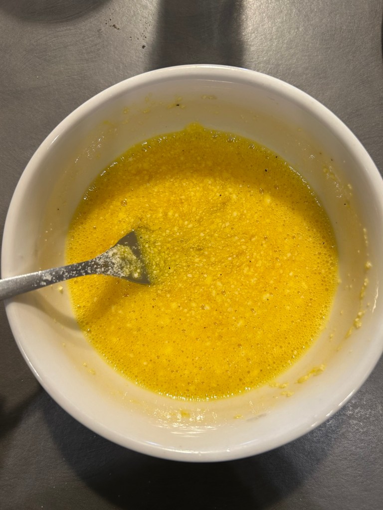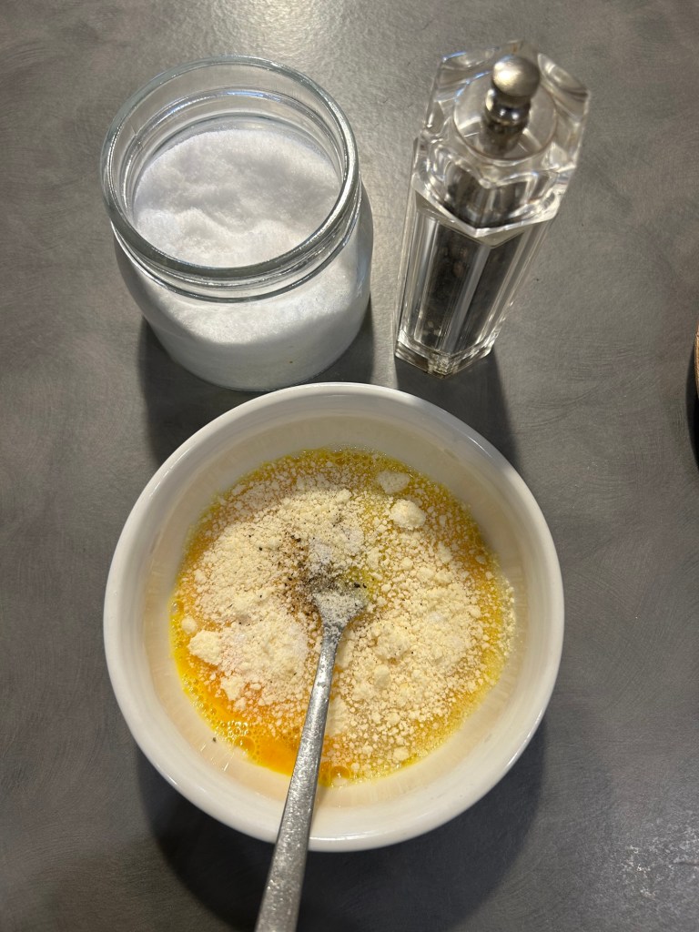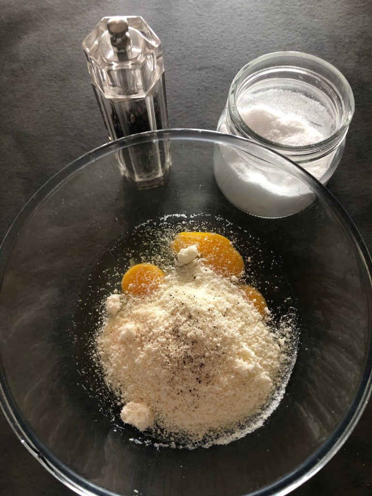 In una ciotola rompo le uova, aggiungo il formaggio, un pizzico di sale e pepe