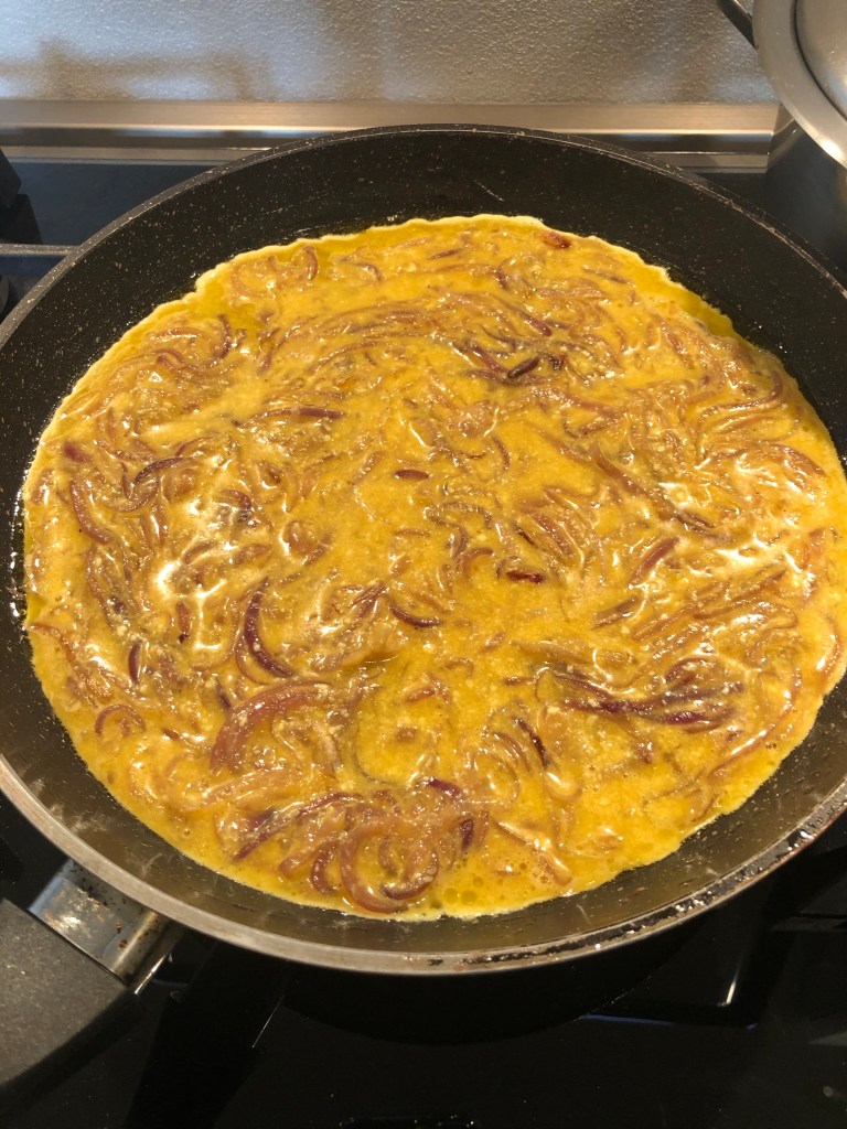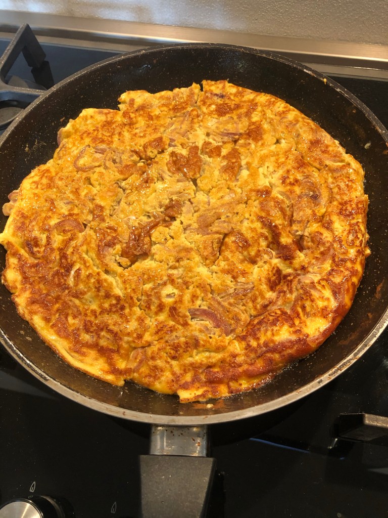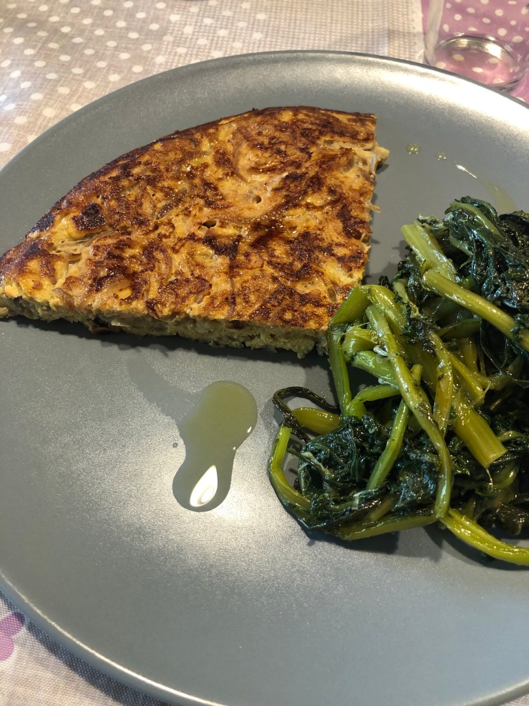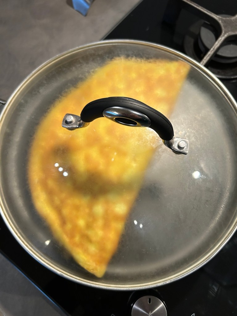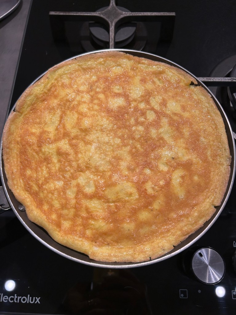 Lascio cuocere bene da un lato poi con un coperchio facendo molta attenzione giro la frittata
