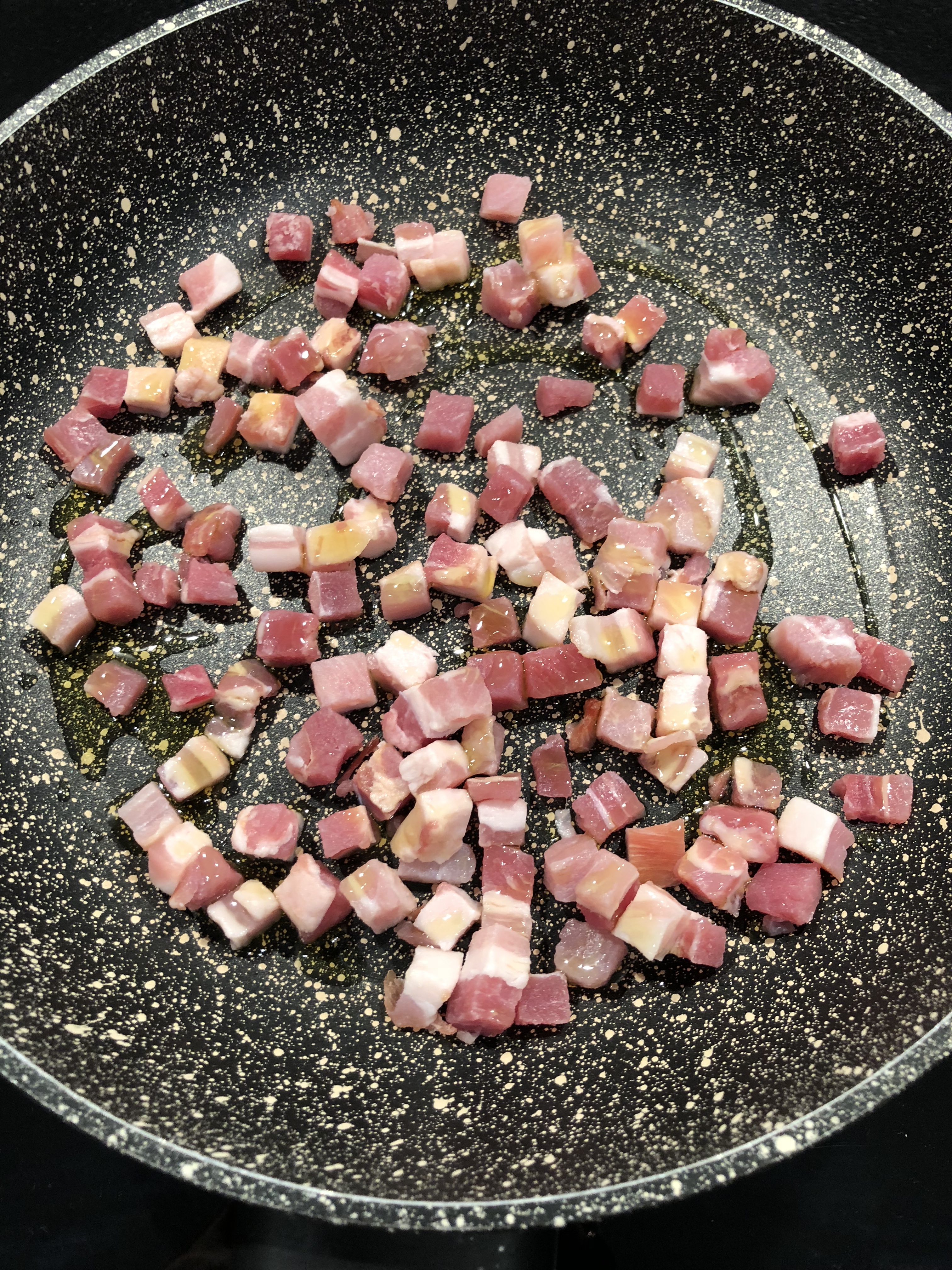 Lo aggiungo alla pancetta e unisco sale e pepe