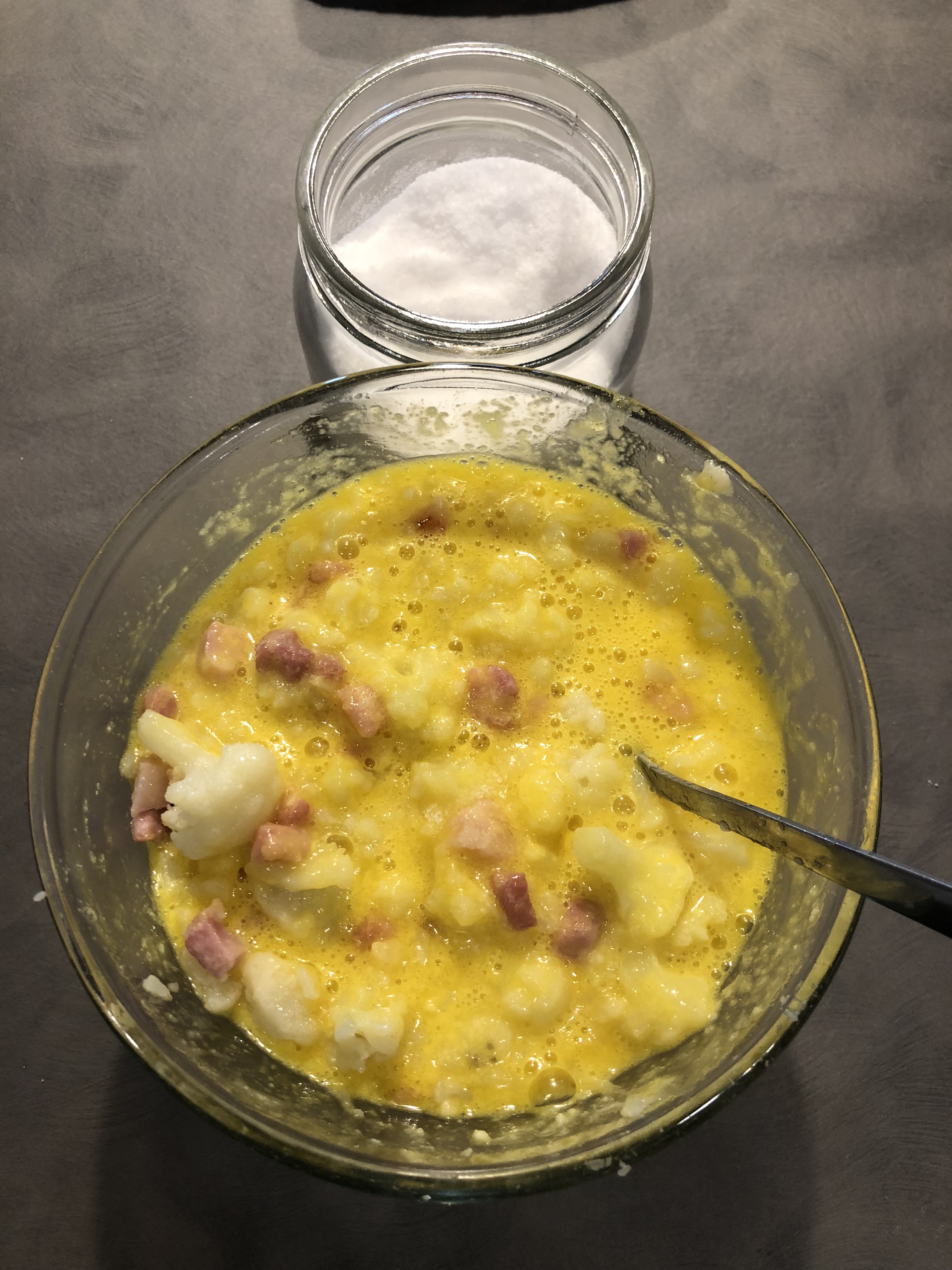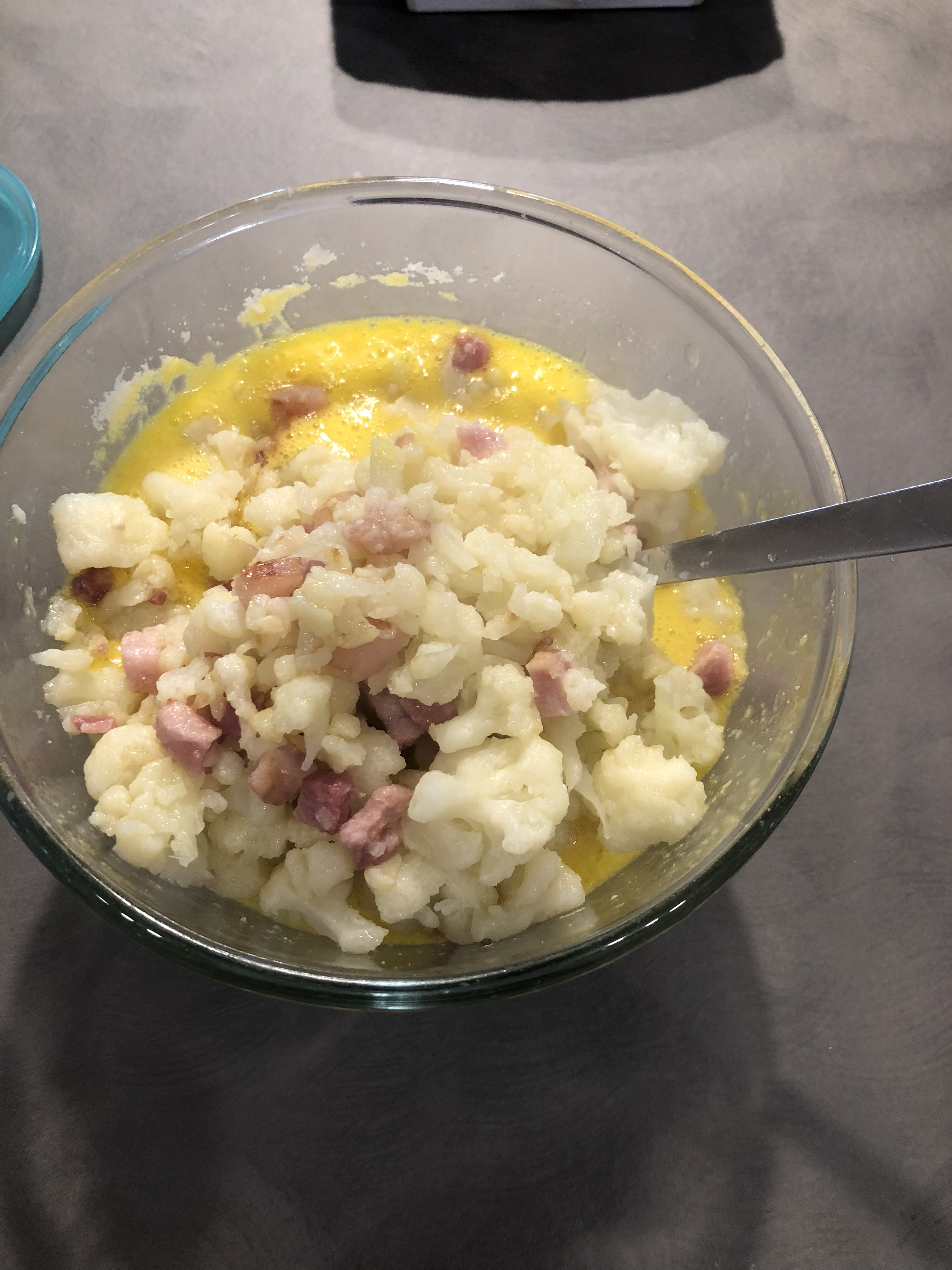 Ho cotto un cavolfiore piuttosto grande quindi una parte é avanzato e ho deciso di preparare una frittata vi assicuro buonissima, queste sono ricette di riciclo quindi si va un po’ ad occhio senza preoccuparsi troppo di pesare gli ingredienti