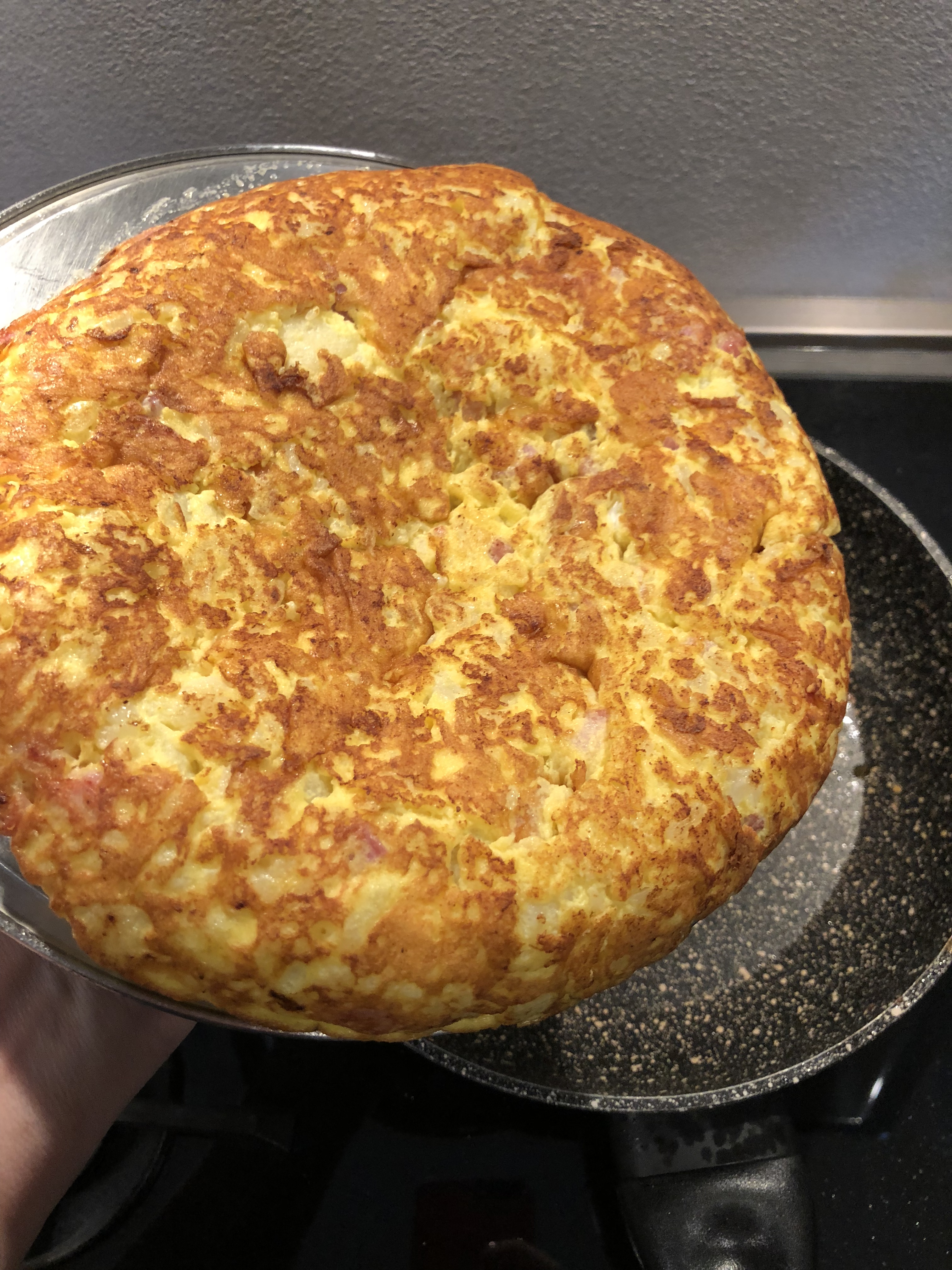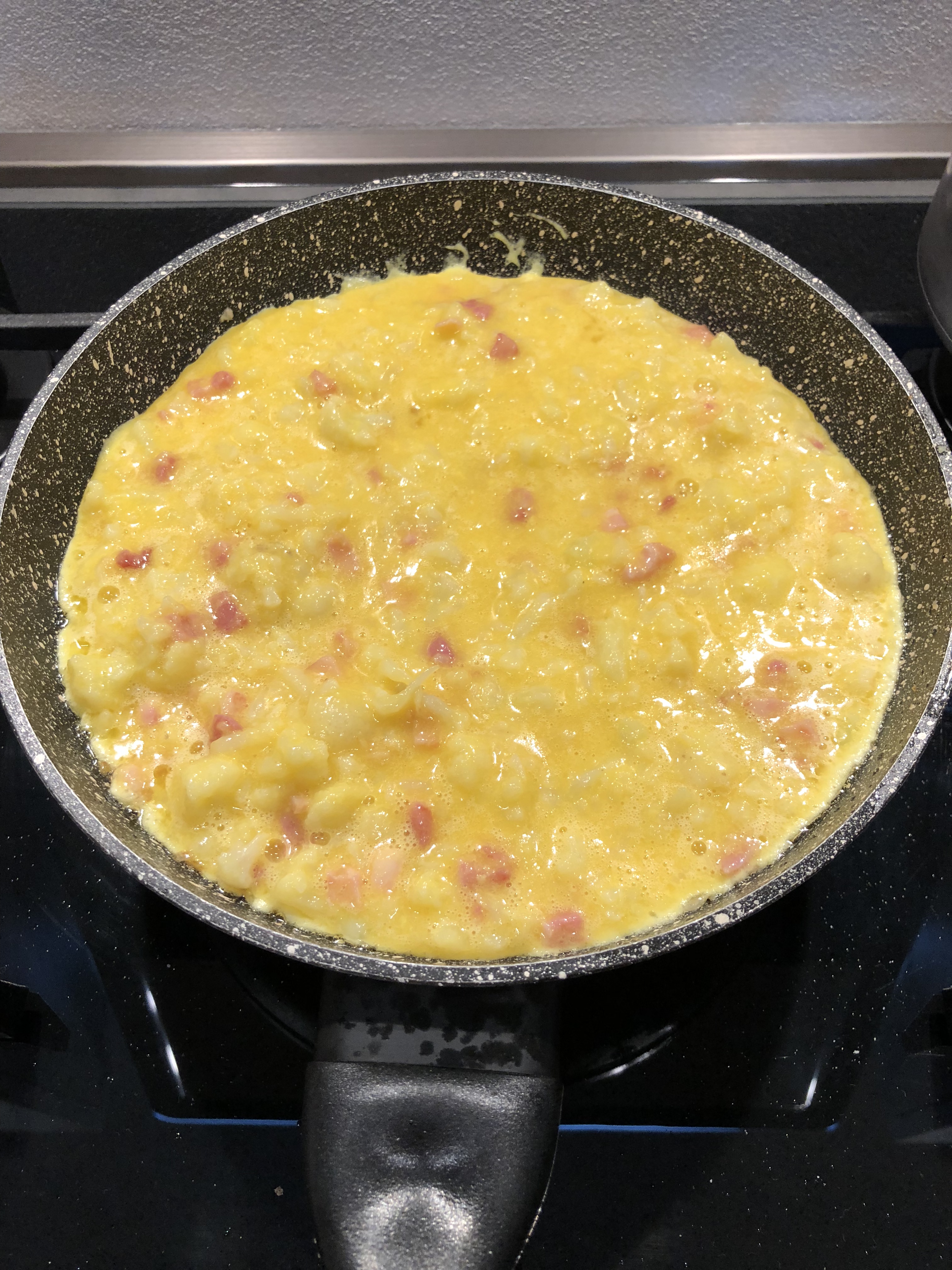 Lascio cuocere bene da un lato poi con un coperchio facendo molta attenzione giro la frittata