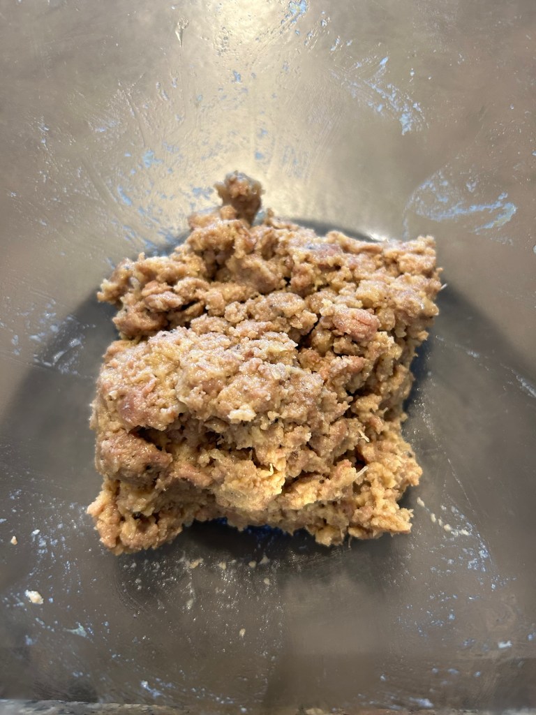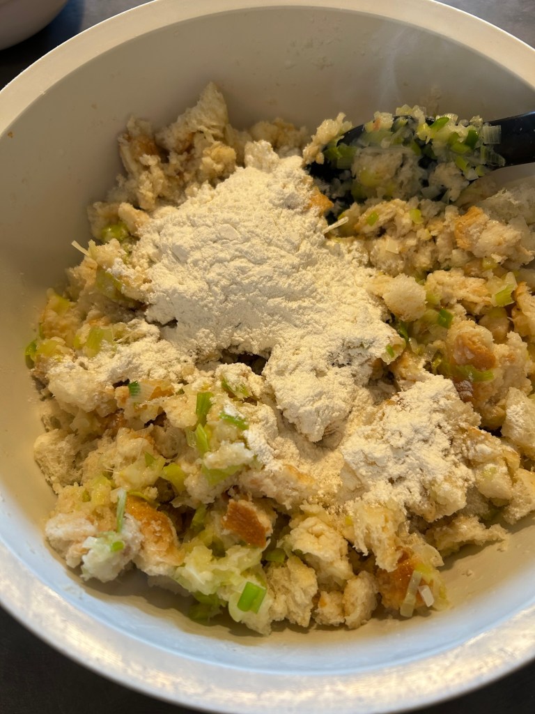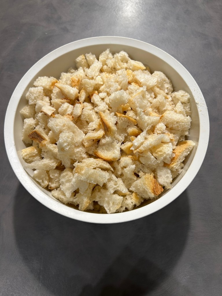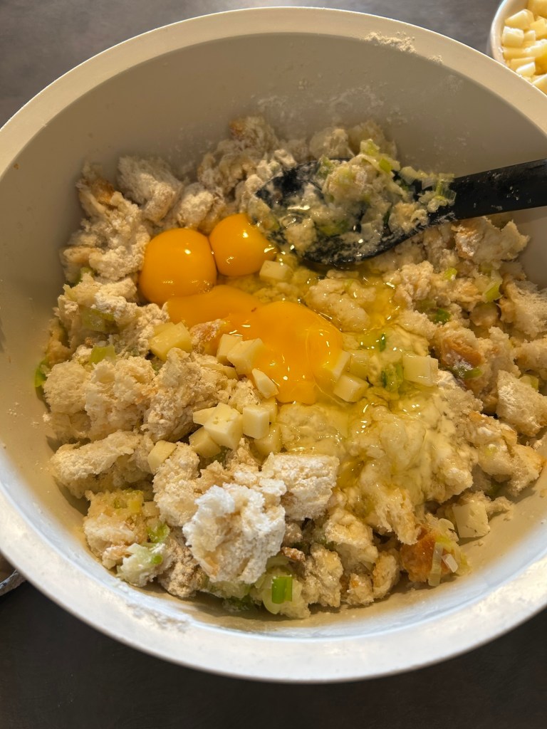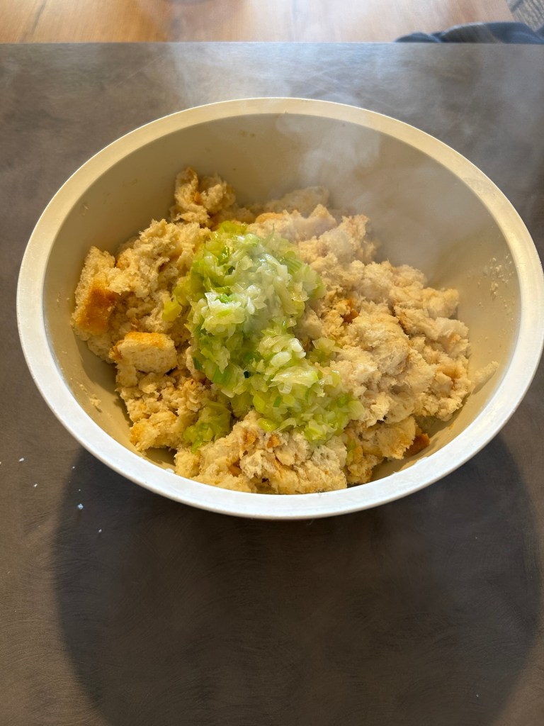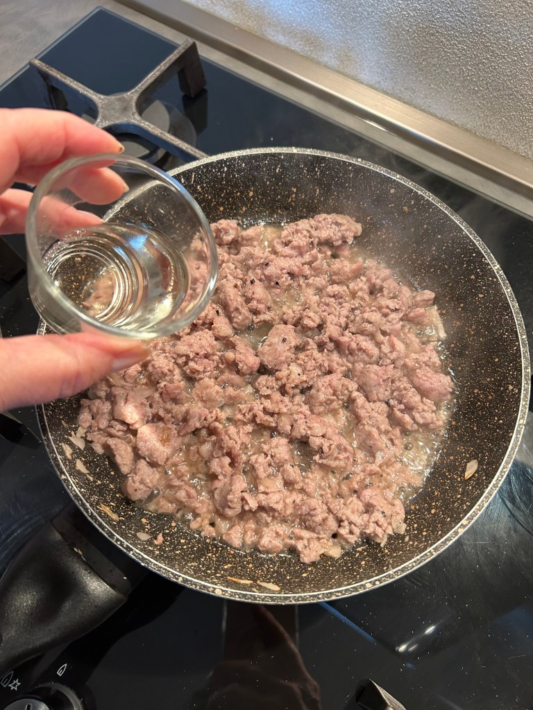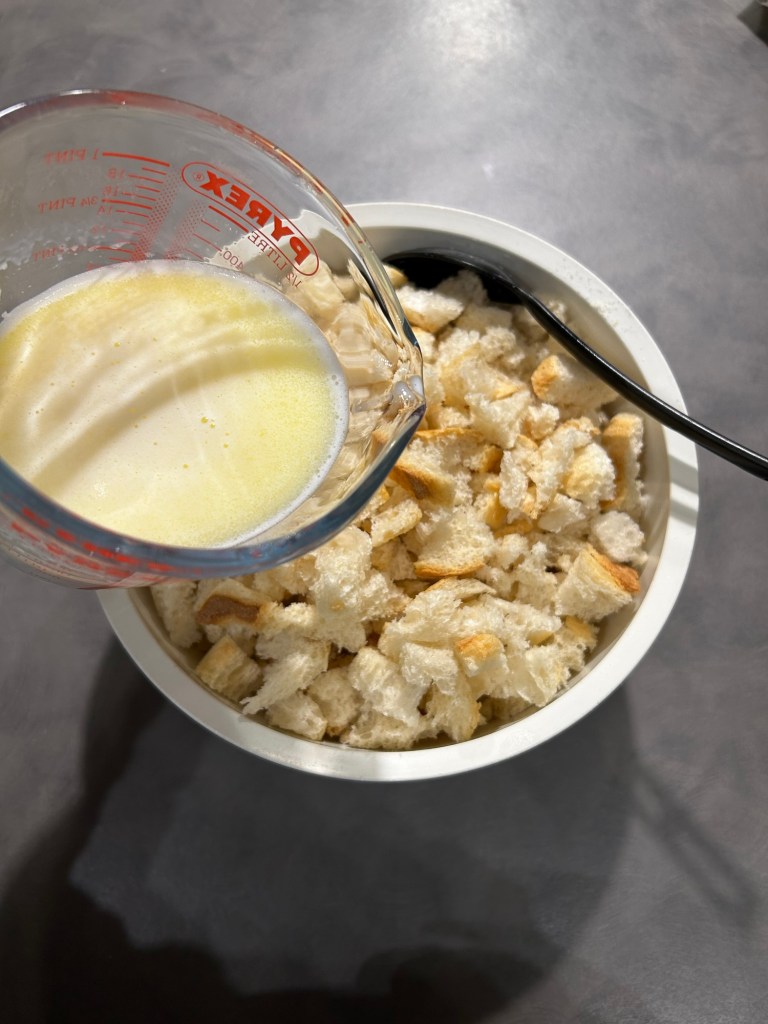 Lo verso sul pane, mescolo e lo lasci ammorbidire mescolando di tanto in tanto, se ho tempo lo faccio anche la sera prima ma non é necessario, l’importante che si ammorbidisca