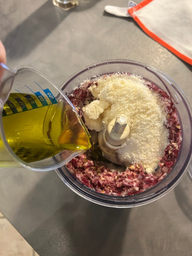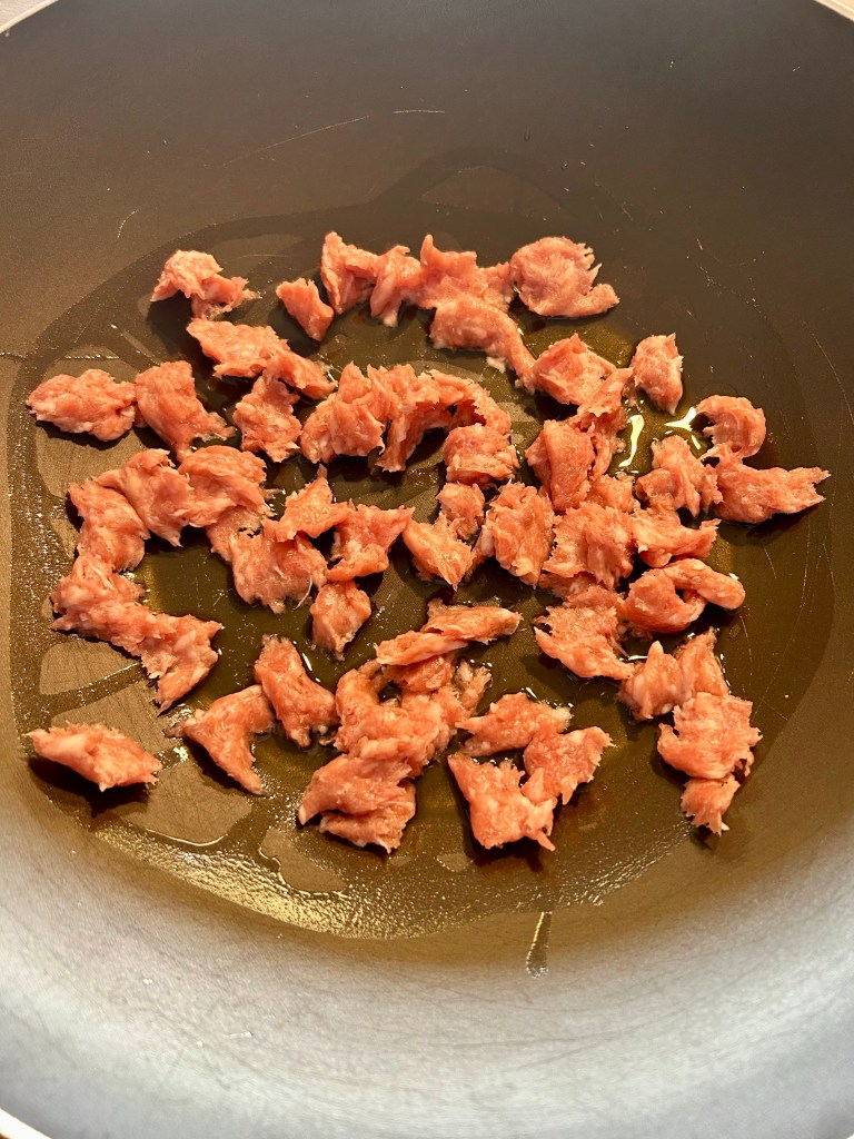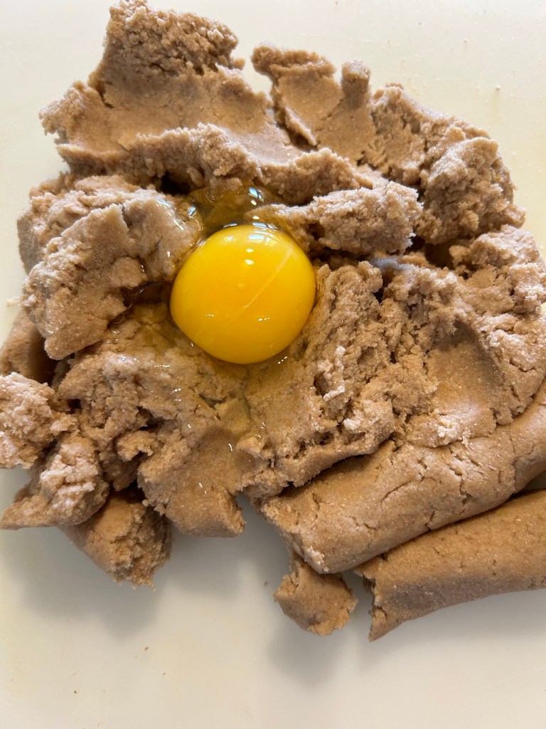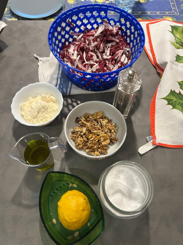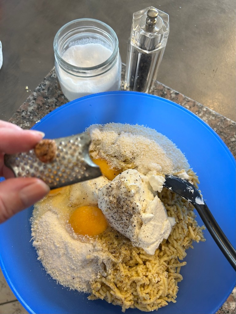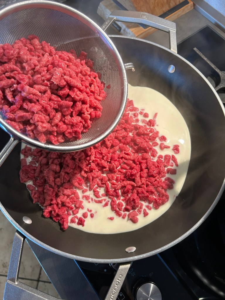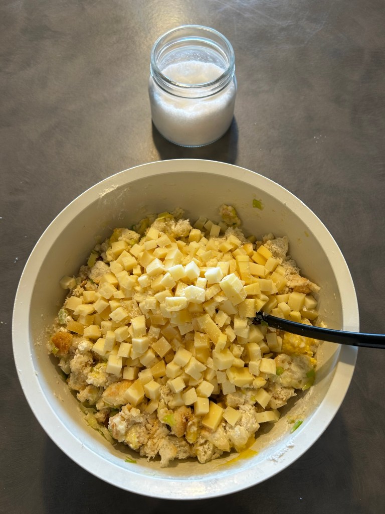 Lo verso sul pane, mescolo e lo lasci ammorbidire mescolando di tanto in tanto, se ho tempo lo faccio anche la sera prima ma non é necessario, l’importante che si ammorbidisca
