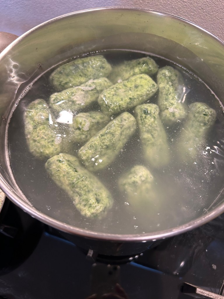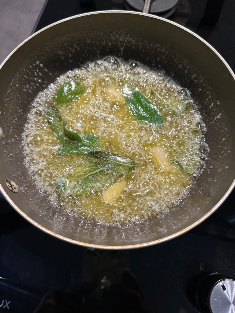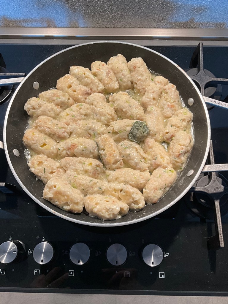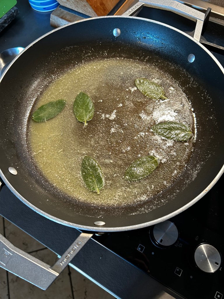 Fateli bollire piano e teneteli controllati, se cuociono troppo c’è il rischio le il formaggio si fonda troppo e gli gnocchi si disfano, in un largo tegame sciolgo il burro con la salvia