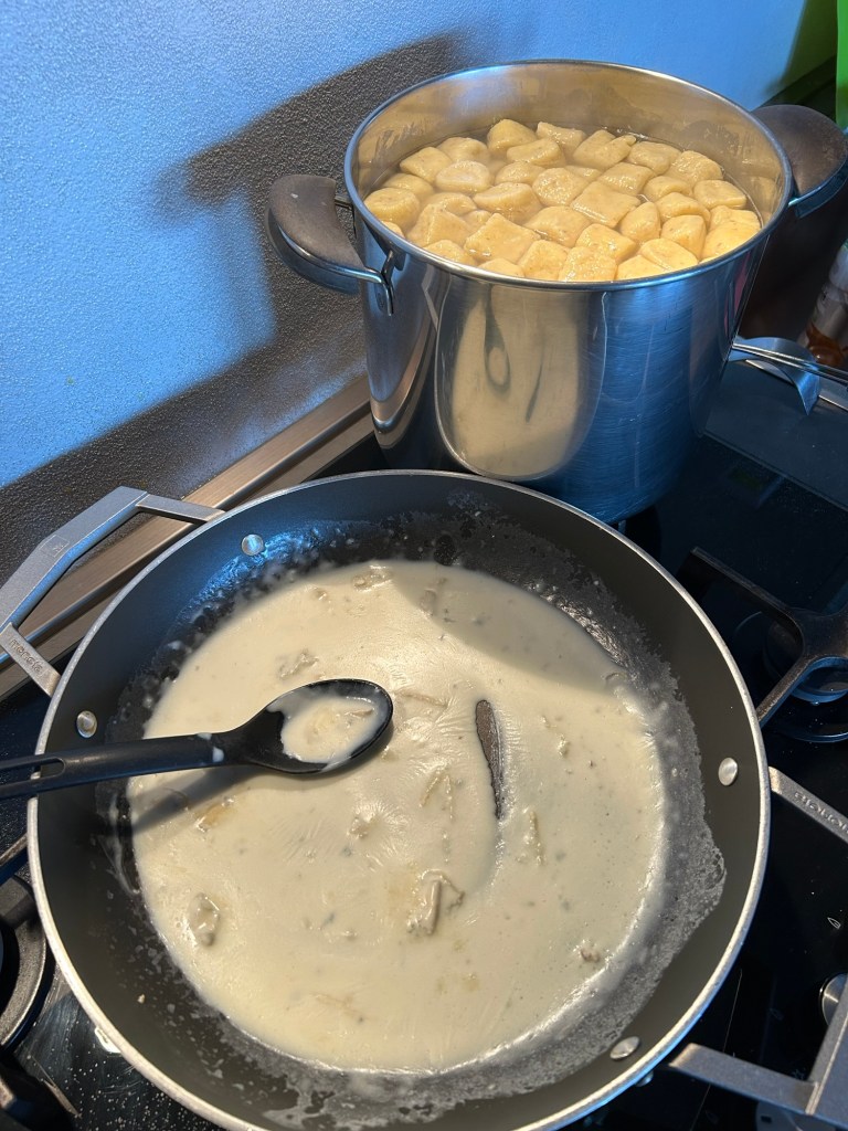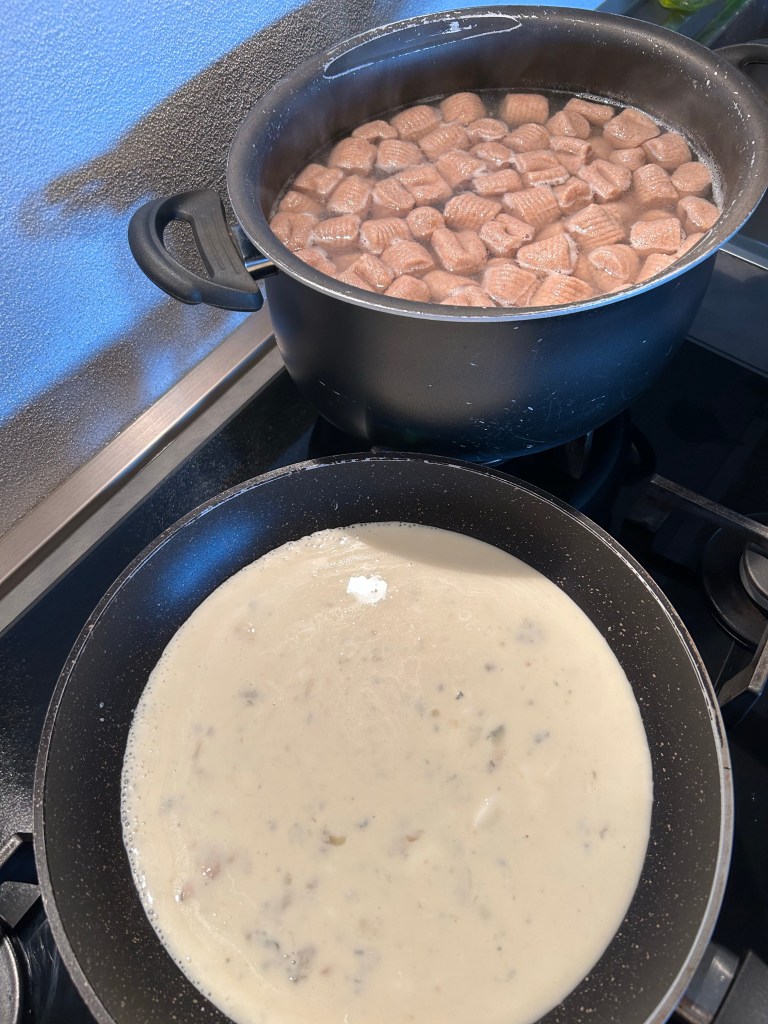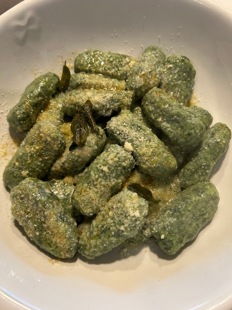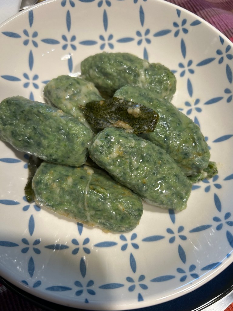 Fateli bollire piano e teneteli controllati, se cuociono troppo c’è il rischio le il formaggio si fonda troppo e gli gnocchi si disfano, in un largo tegame sciolgo il burro con la salvia