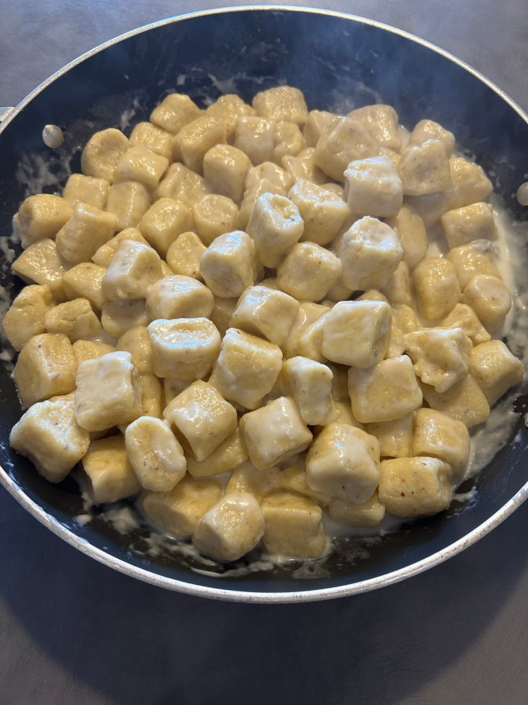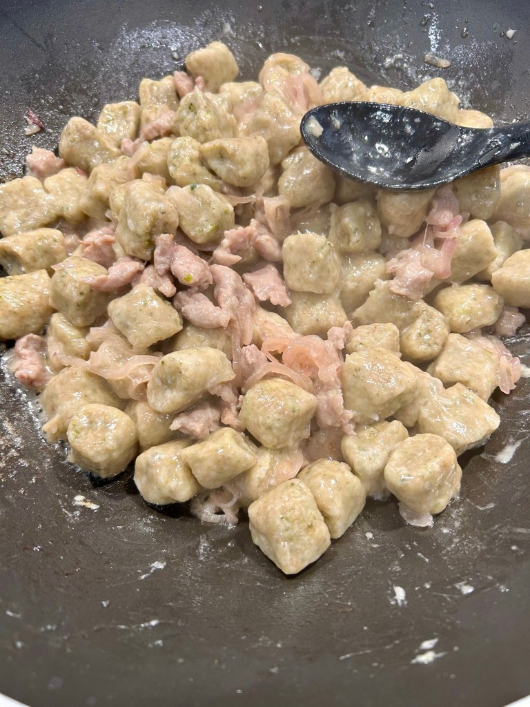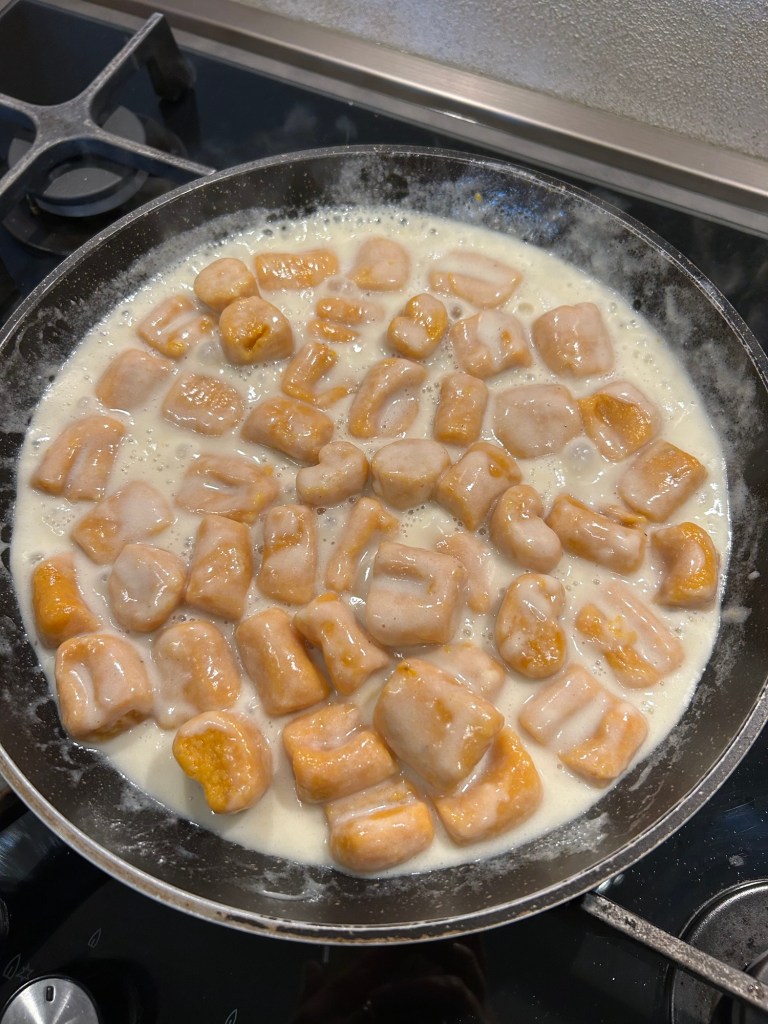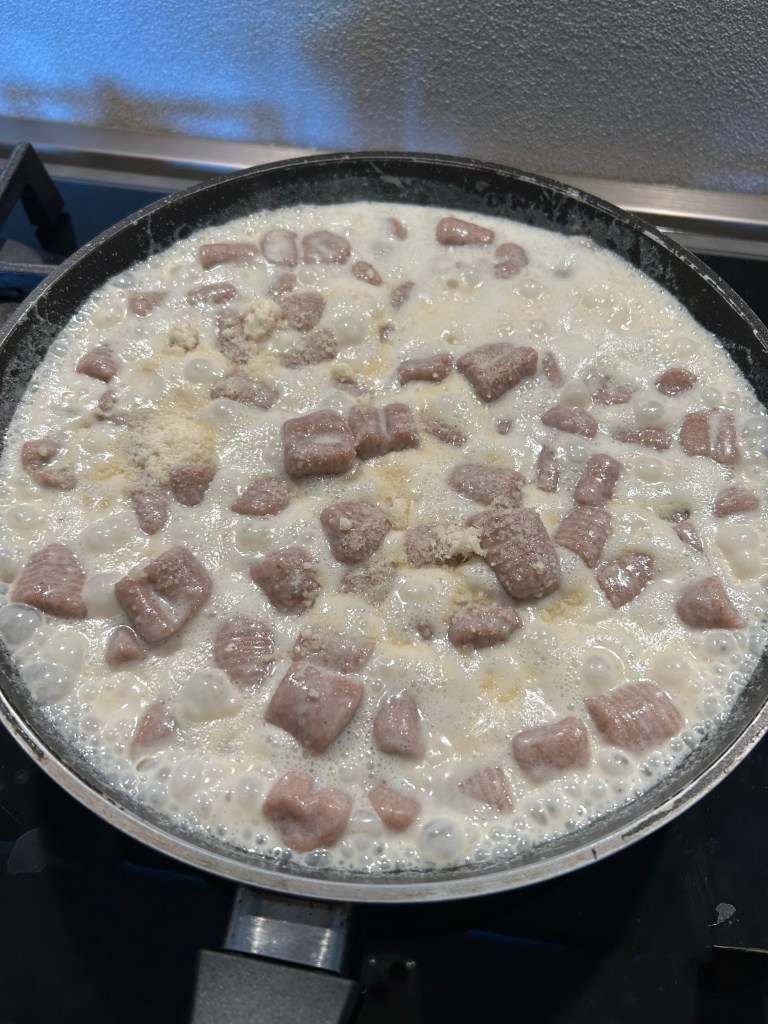 Scolo delicatamente gli gnocchi e li aggiungo al condimento, li lascio qualche istante, aggiungo del parmigiano grattugiato
