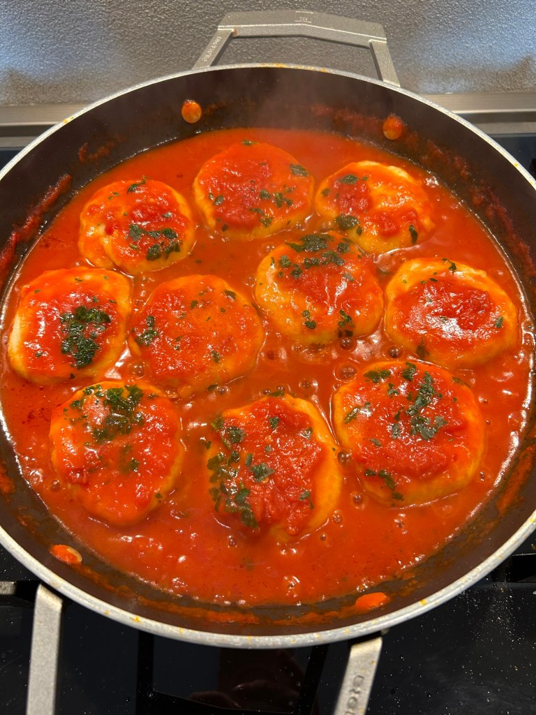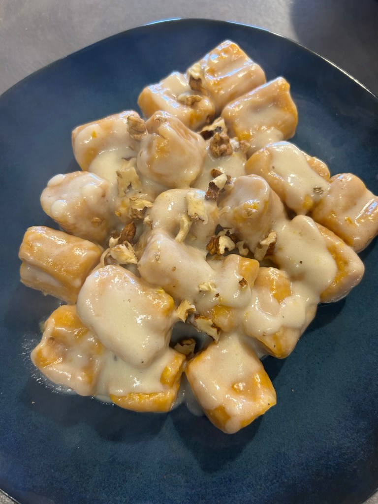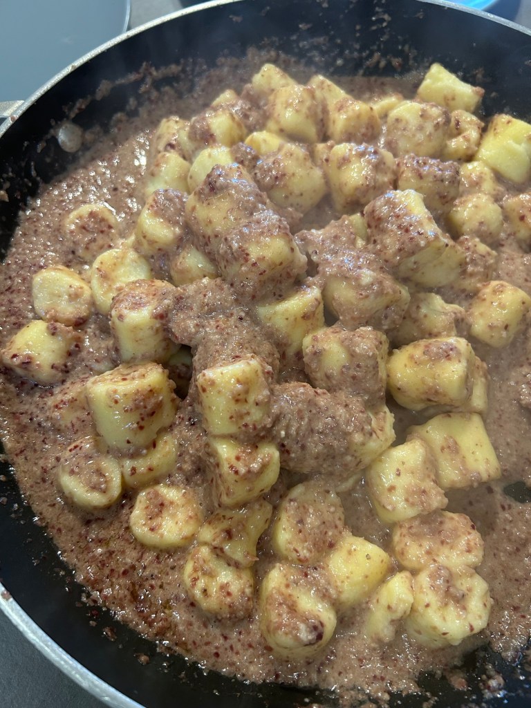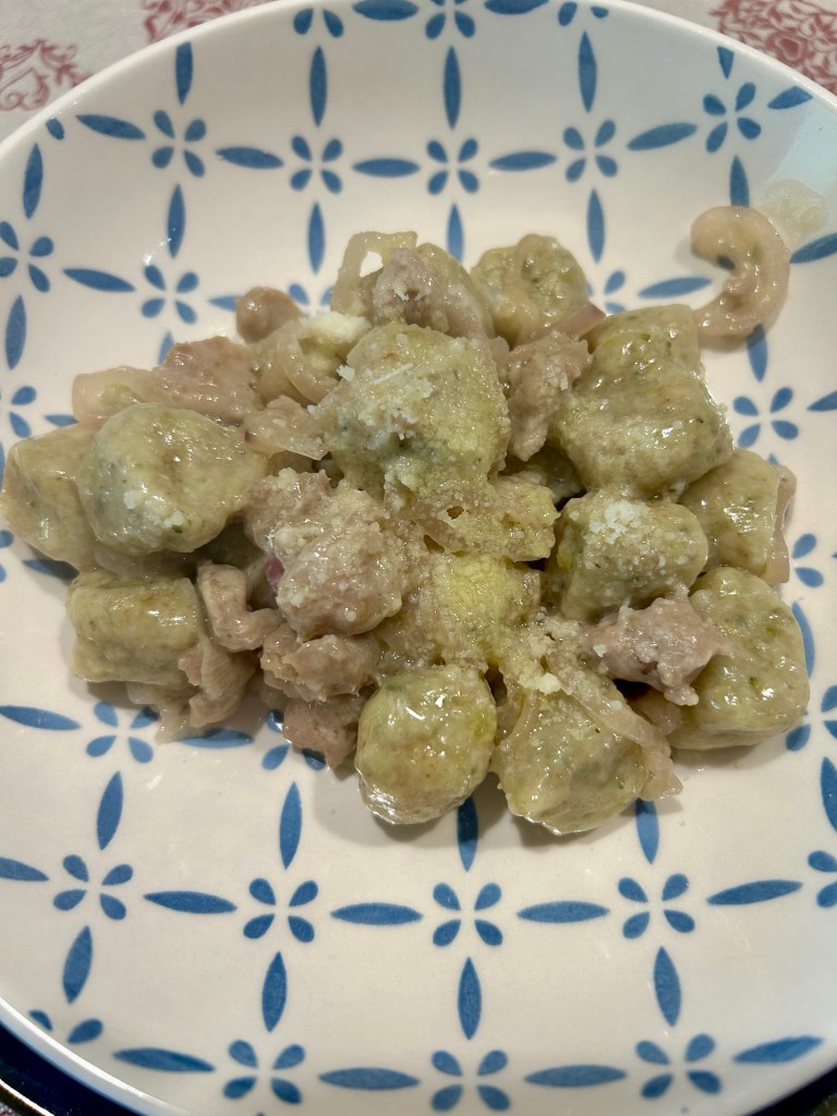 Scolo delicatamente gli gnocchi e li aggiungo al condimento, li lascio qualche istante, aggiungo del parmigiano grattugiato
