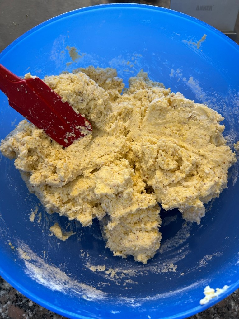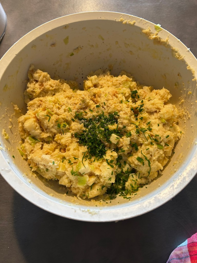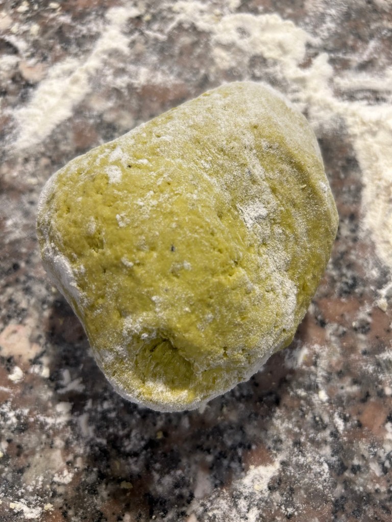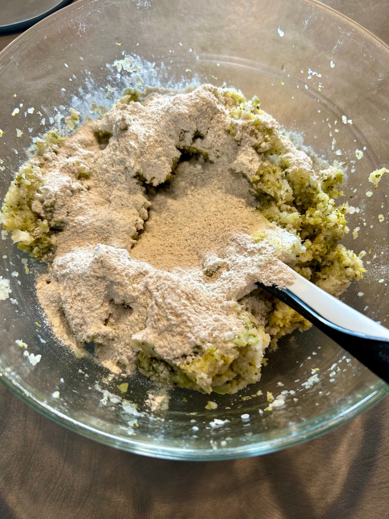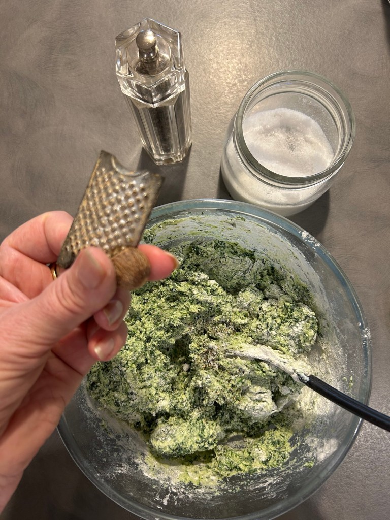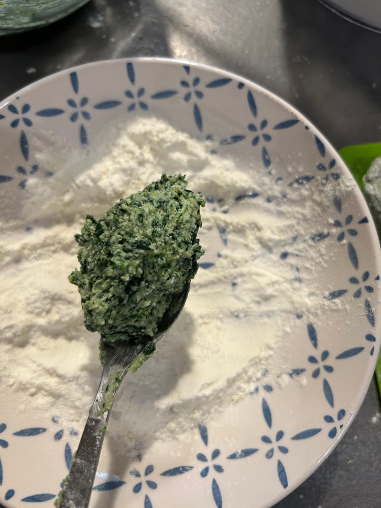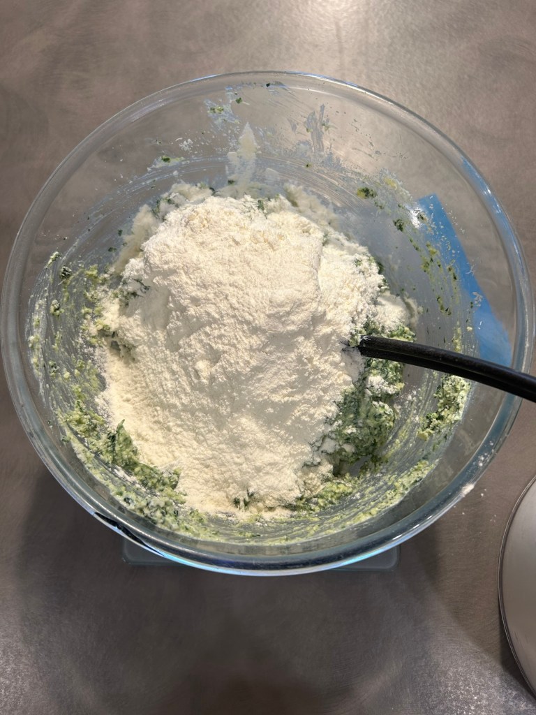 Trito un mazzetto di erba cipollina e impasto, utilizzo le mani per valutare la consistenza, se il composto fosse troppo appiccicoso unire ancora un cucchiaio di farina