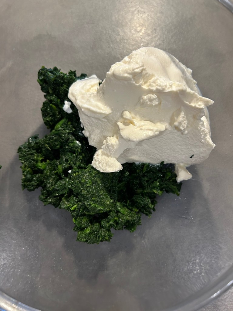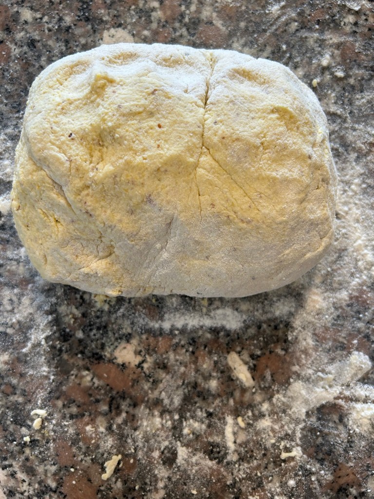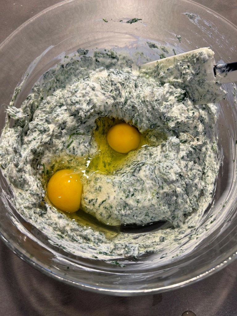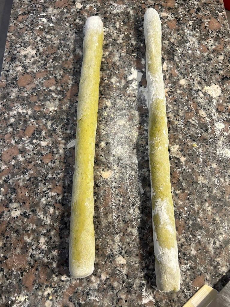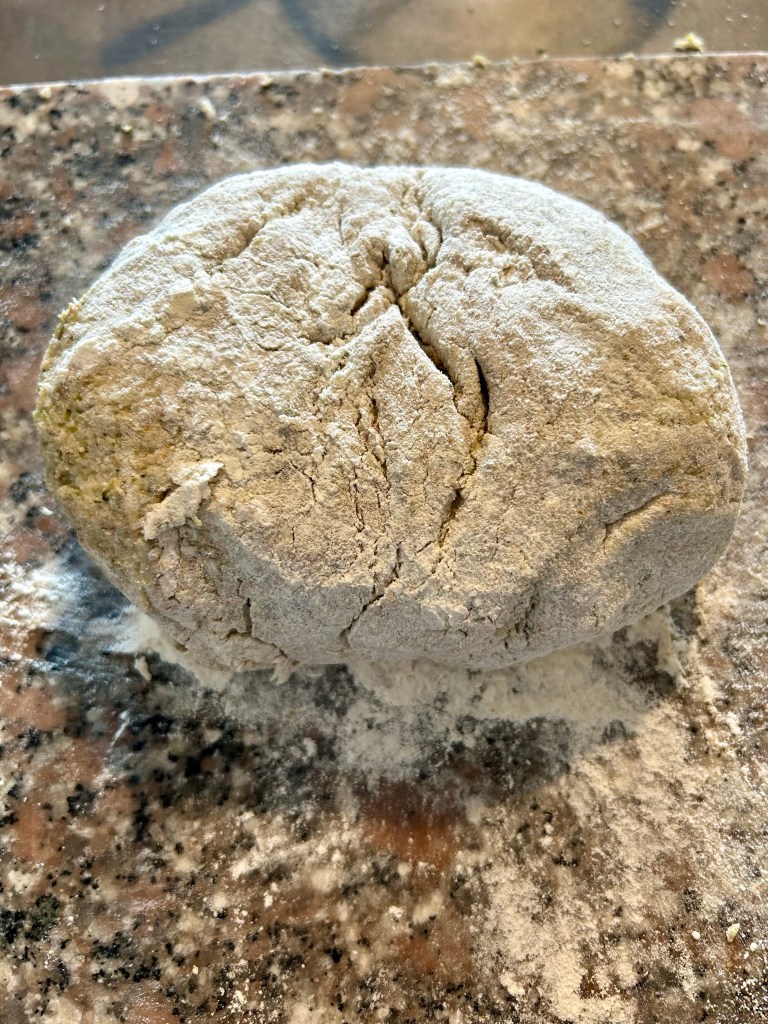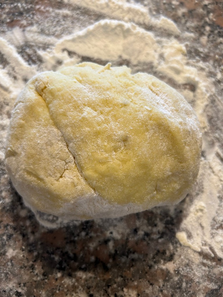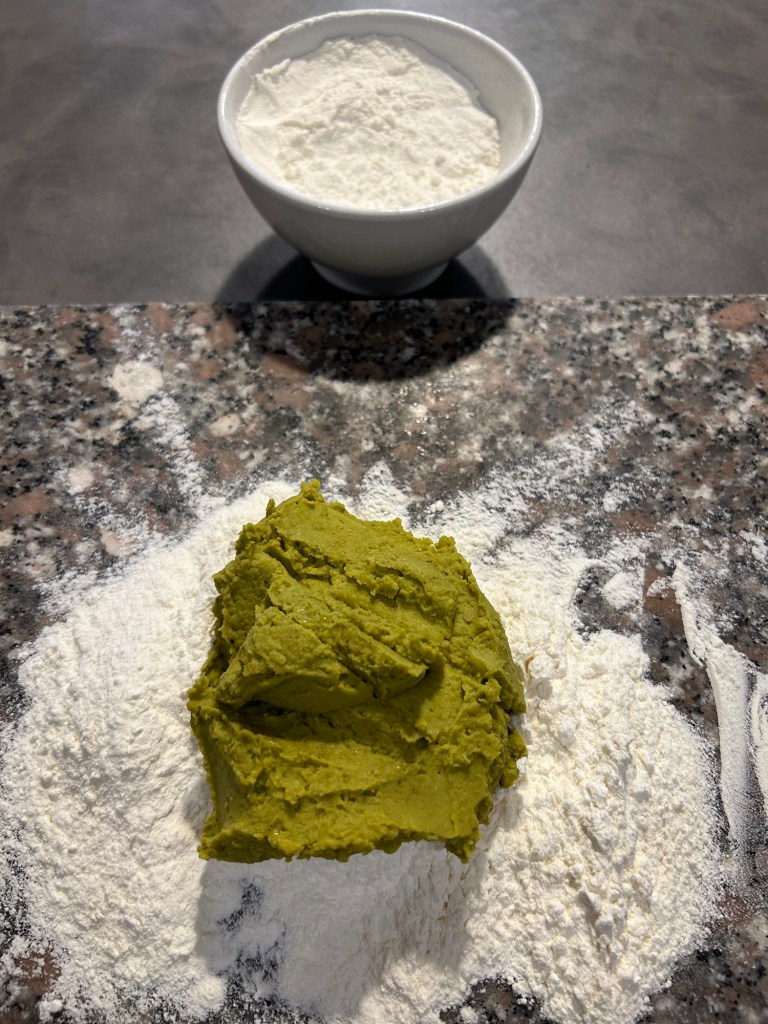 Trito un mazzetto di erba cipollina e impasto, utilizzo le mani per valutare la consistenza, se il composto fosse troppo appiccicoso unire ancora un cucchiaio di farina