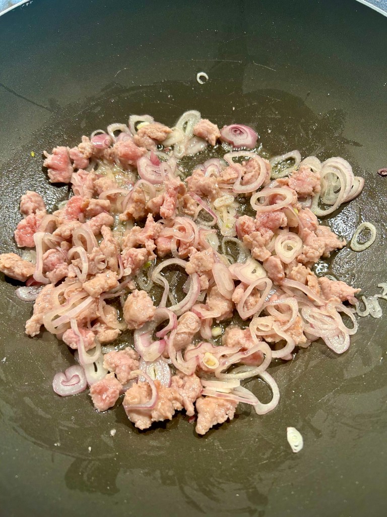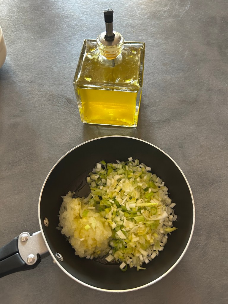 Taglio a cubetti piccoli il formaggio e tengo da parte, taglio finemente i cipollotti o il porro con la cipolla, lo metto in una padella e aggiungo qualche cucchiaio di olio