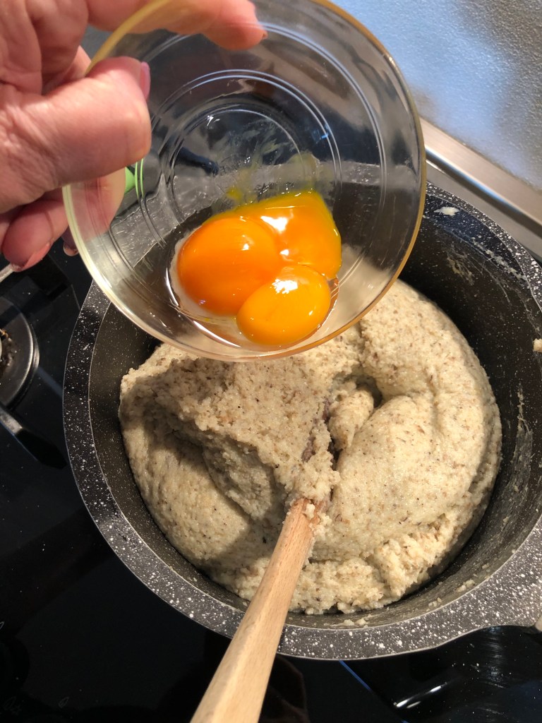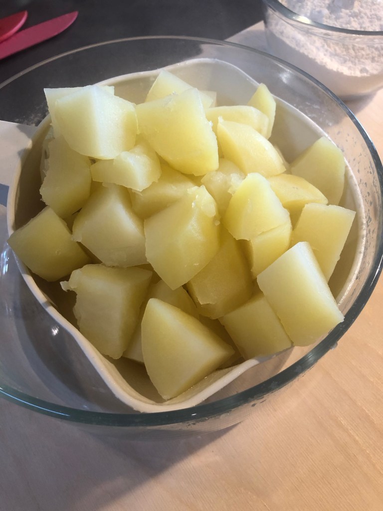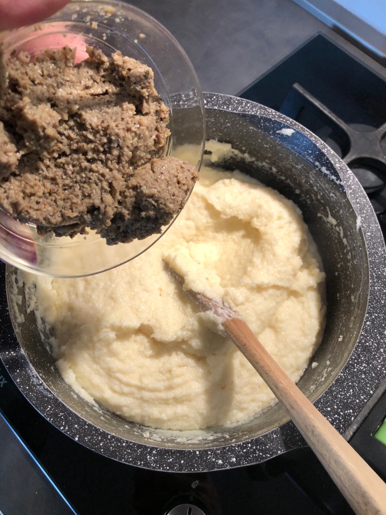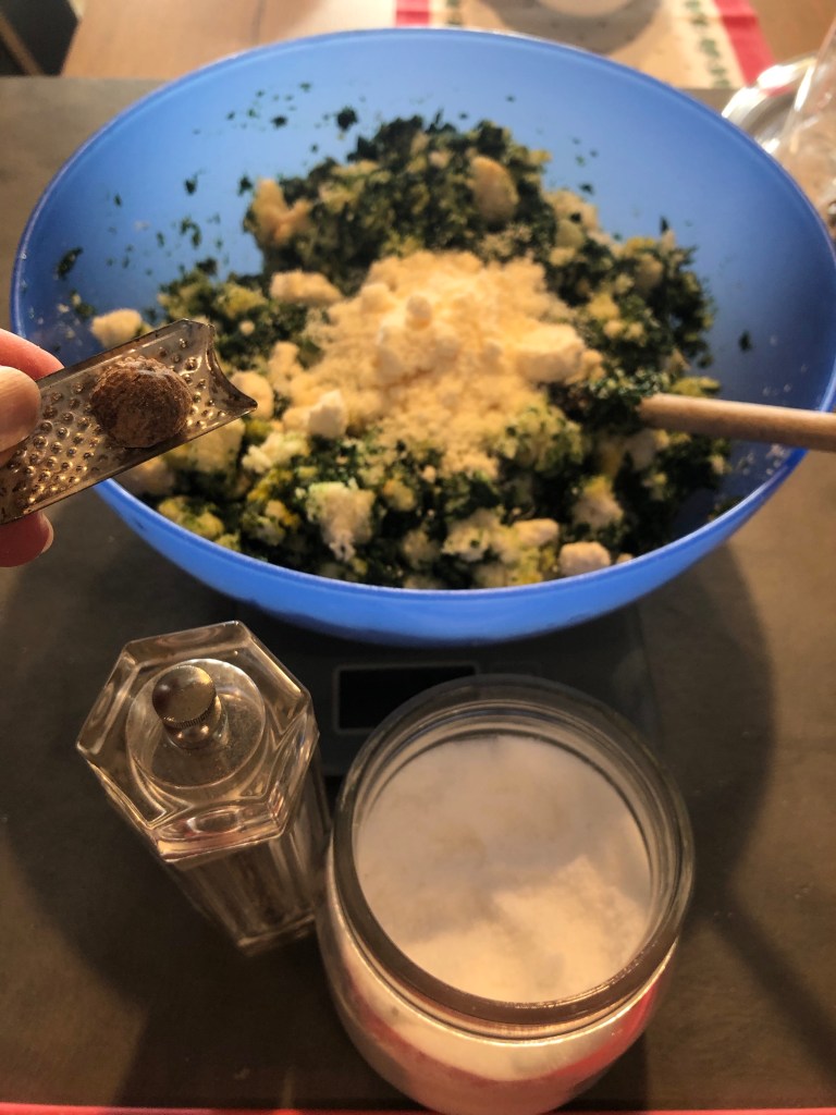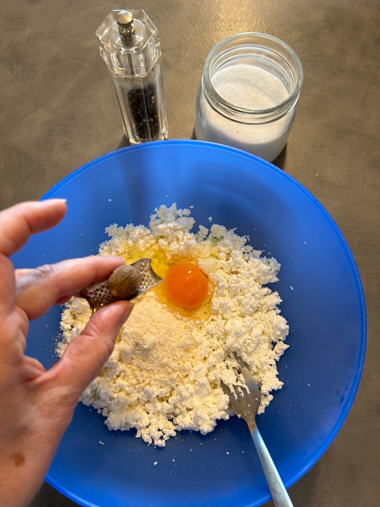 Preparo gli gnocchi, metto la ricotta in una ciotola, la schiaccio con una forchetta, aggiungo il parmigiano, l’uovo, il pepe, il sale e la noce moscata