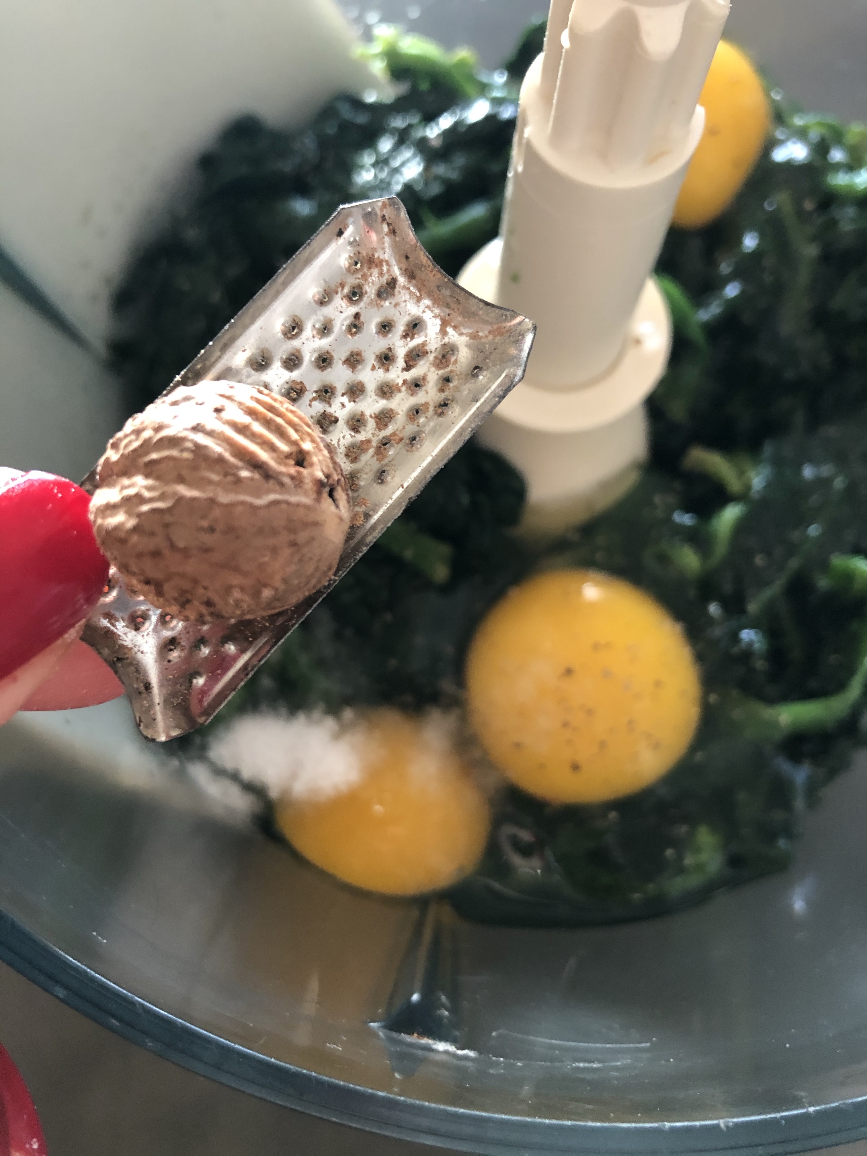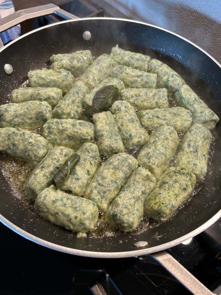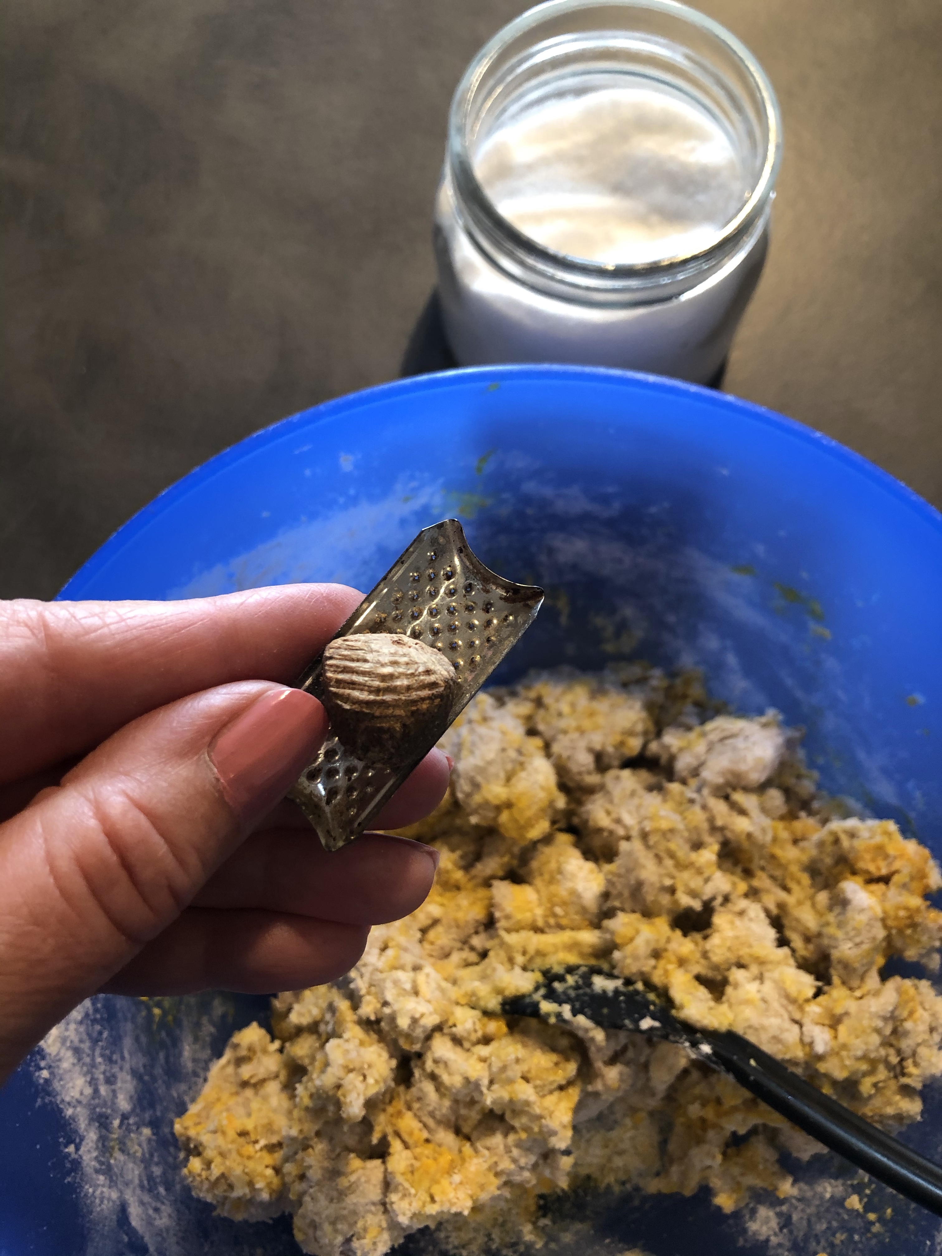 Preparo gli gnocchi, metto la ricotta in una ciotola, la schiaccio con una forchetta, aggiungo il parmigiano, l’uovo, il pepe, il sale e la noce moscata