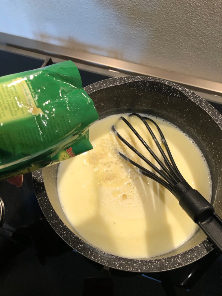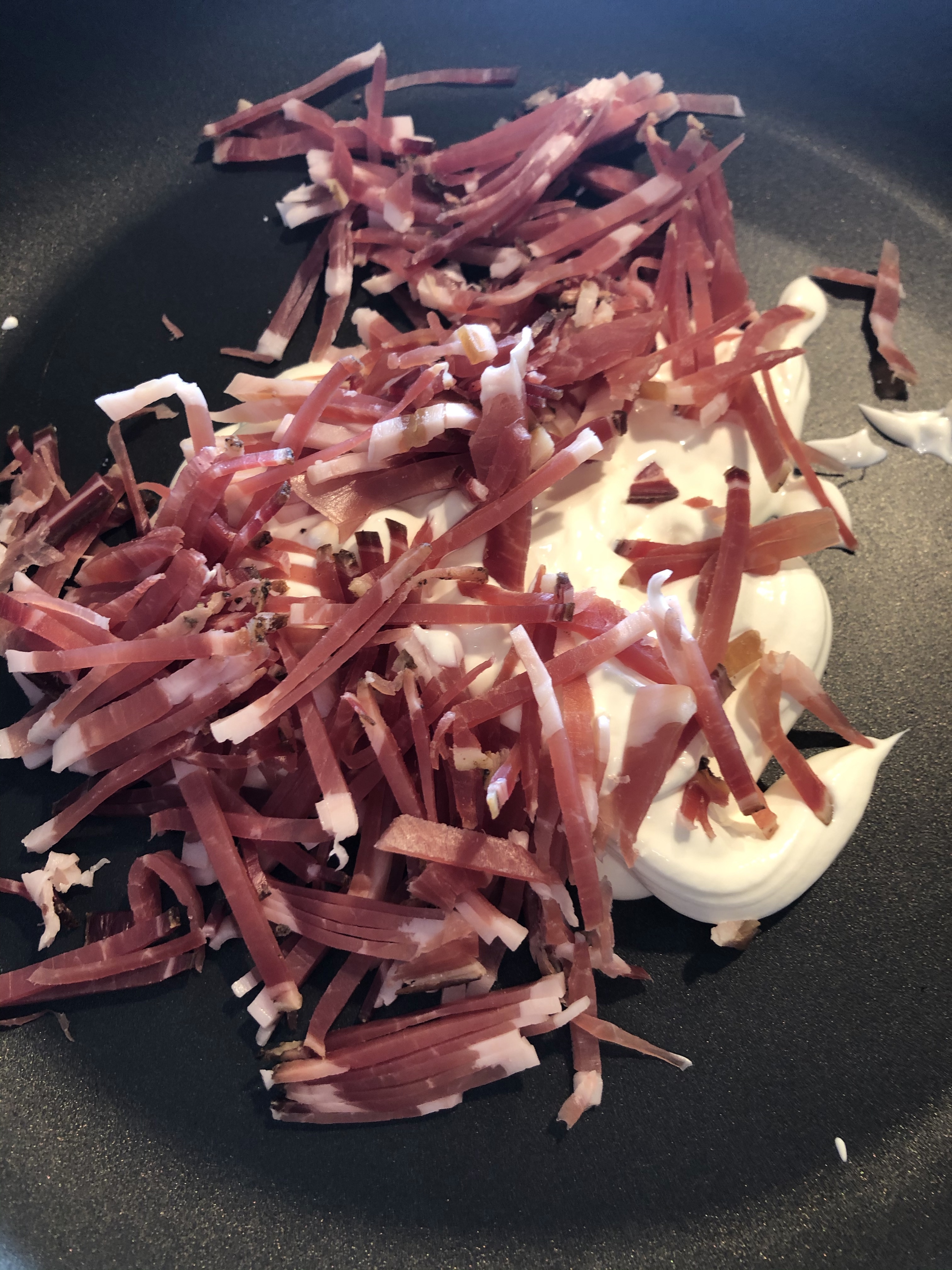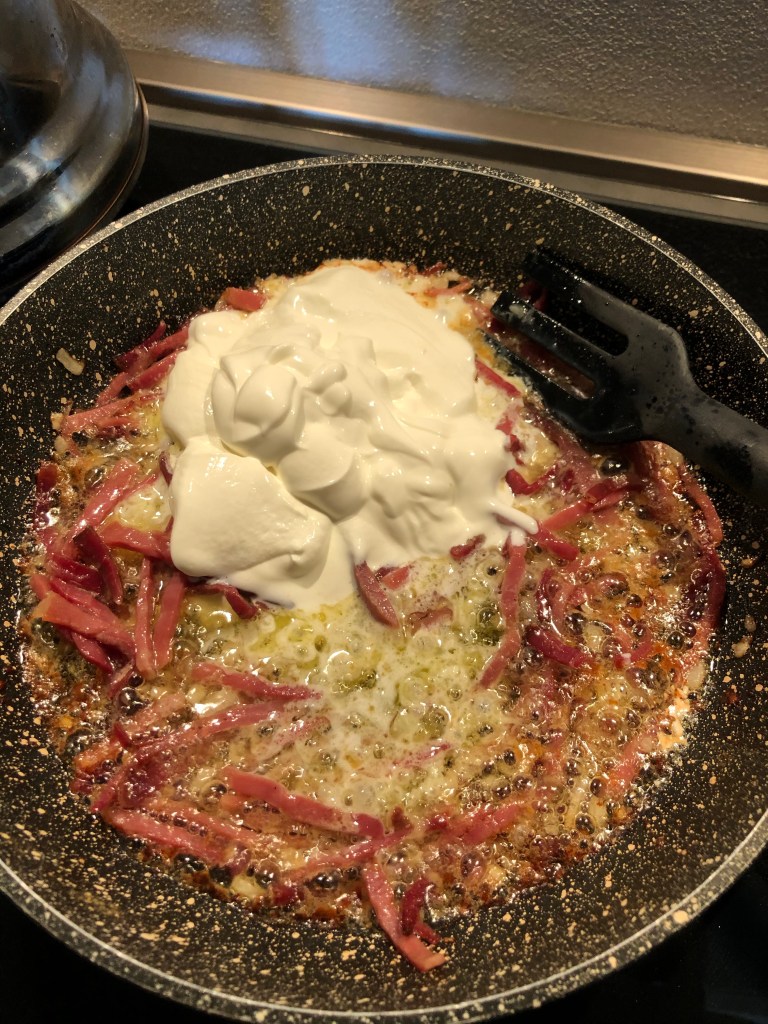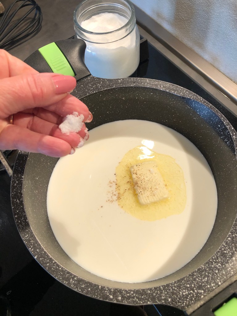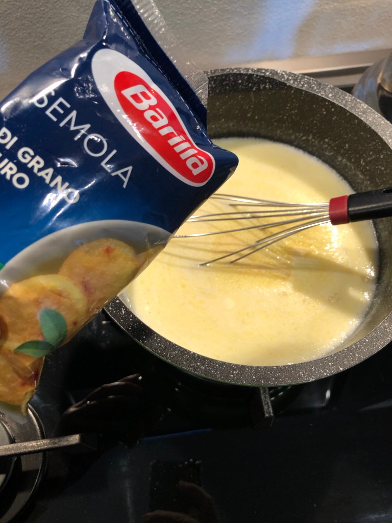 In una larga padella metto la salsa di pomodoro, un goccio di olio, una noce di burro, sale e pepe e lascio sobbollire se serve aggiungo un goccio di acqua, deve essere piuttosto liquida