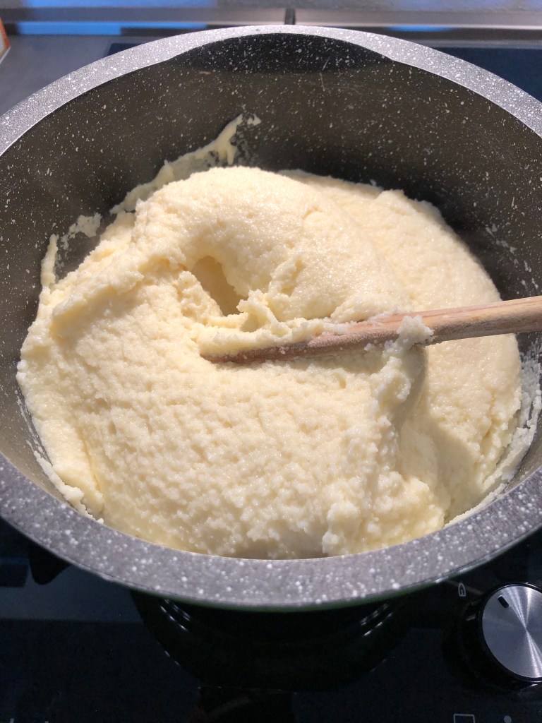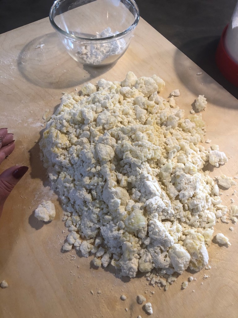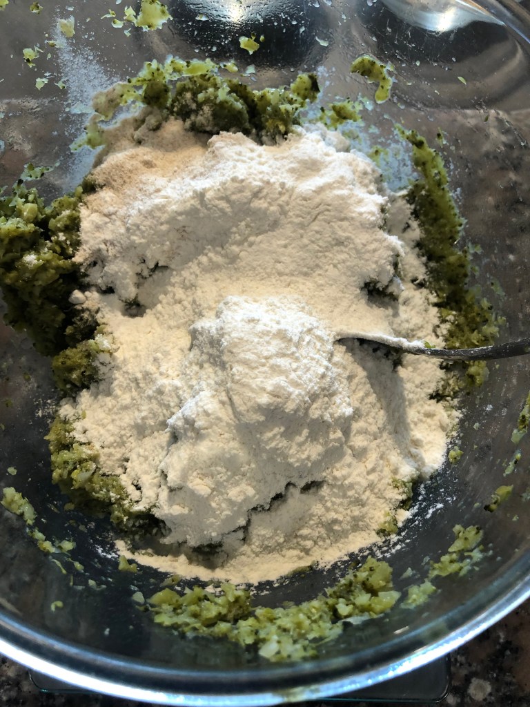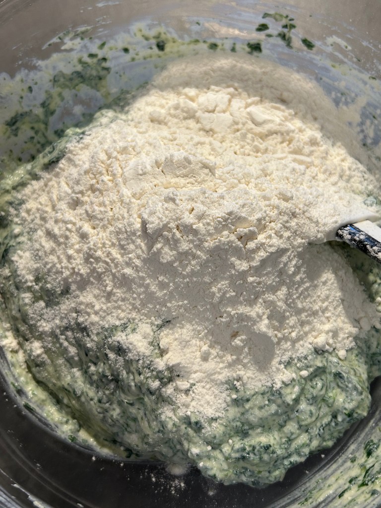 Mescolo e aggiungo la farina poca per volta, dipenderà da quanto assorbe la ricotta, tenetene un po’ da parte