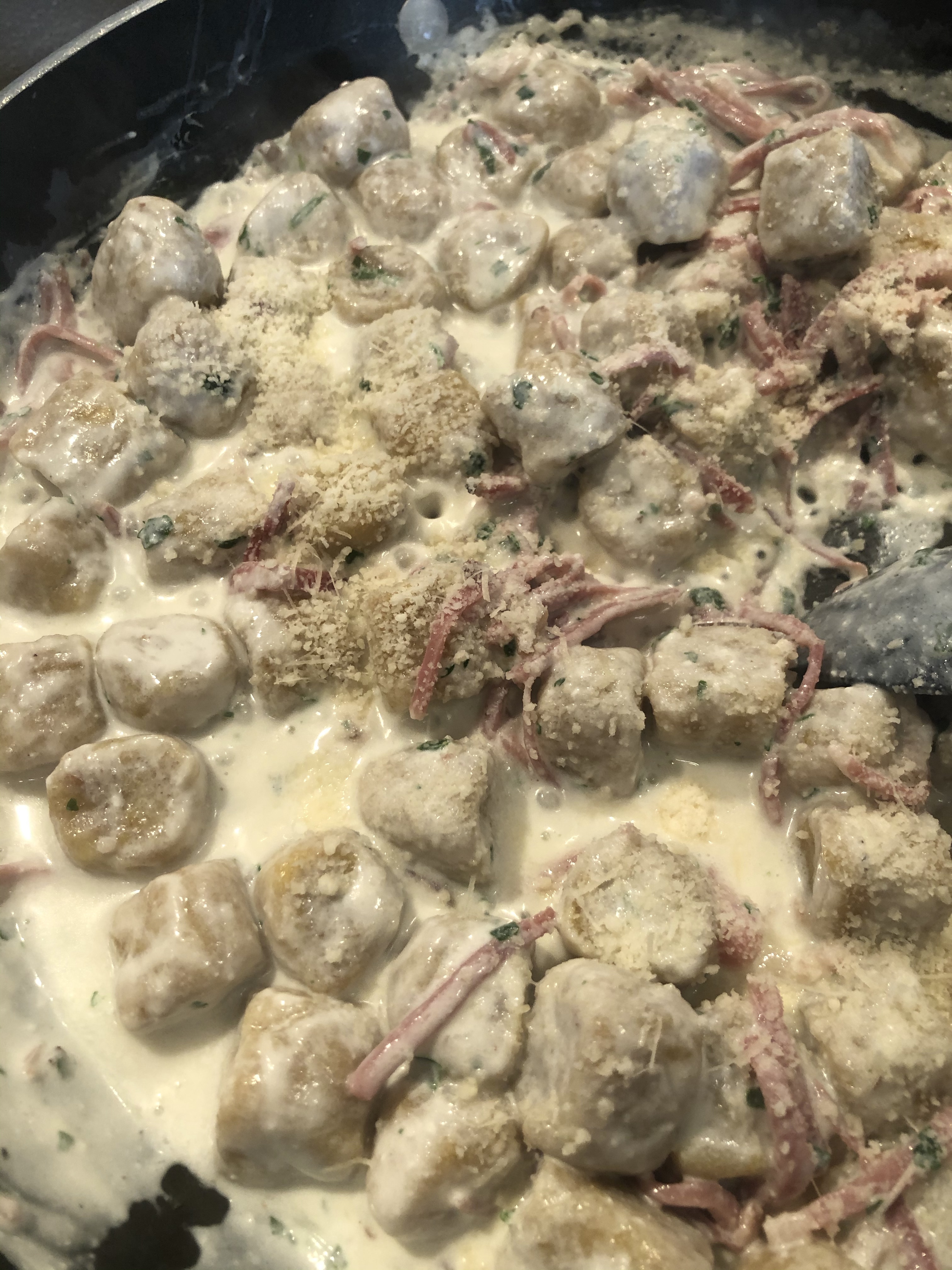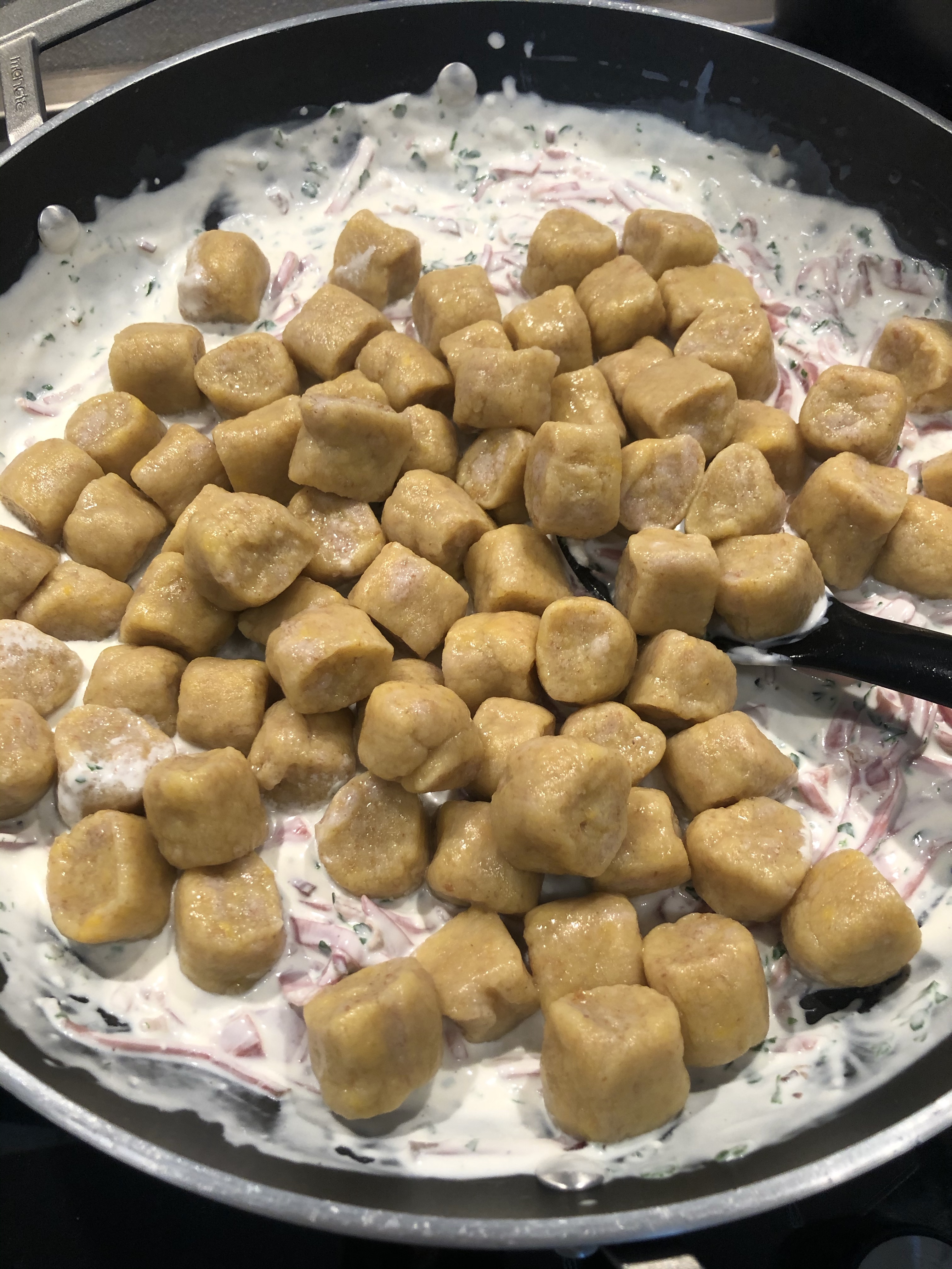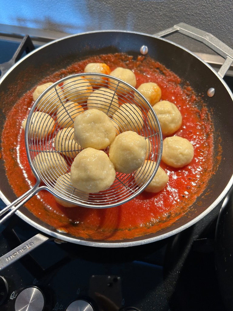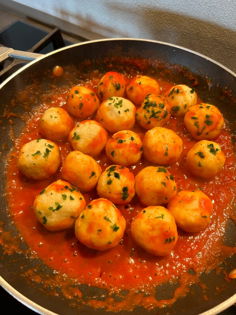 Porto a bollore una pentola con abbondante acqua salata, butto gli gnocchi e attendo finché vengono a galla, li lascio qualche minuto poi li scolo e li trasferisco nel sugo