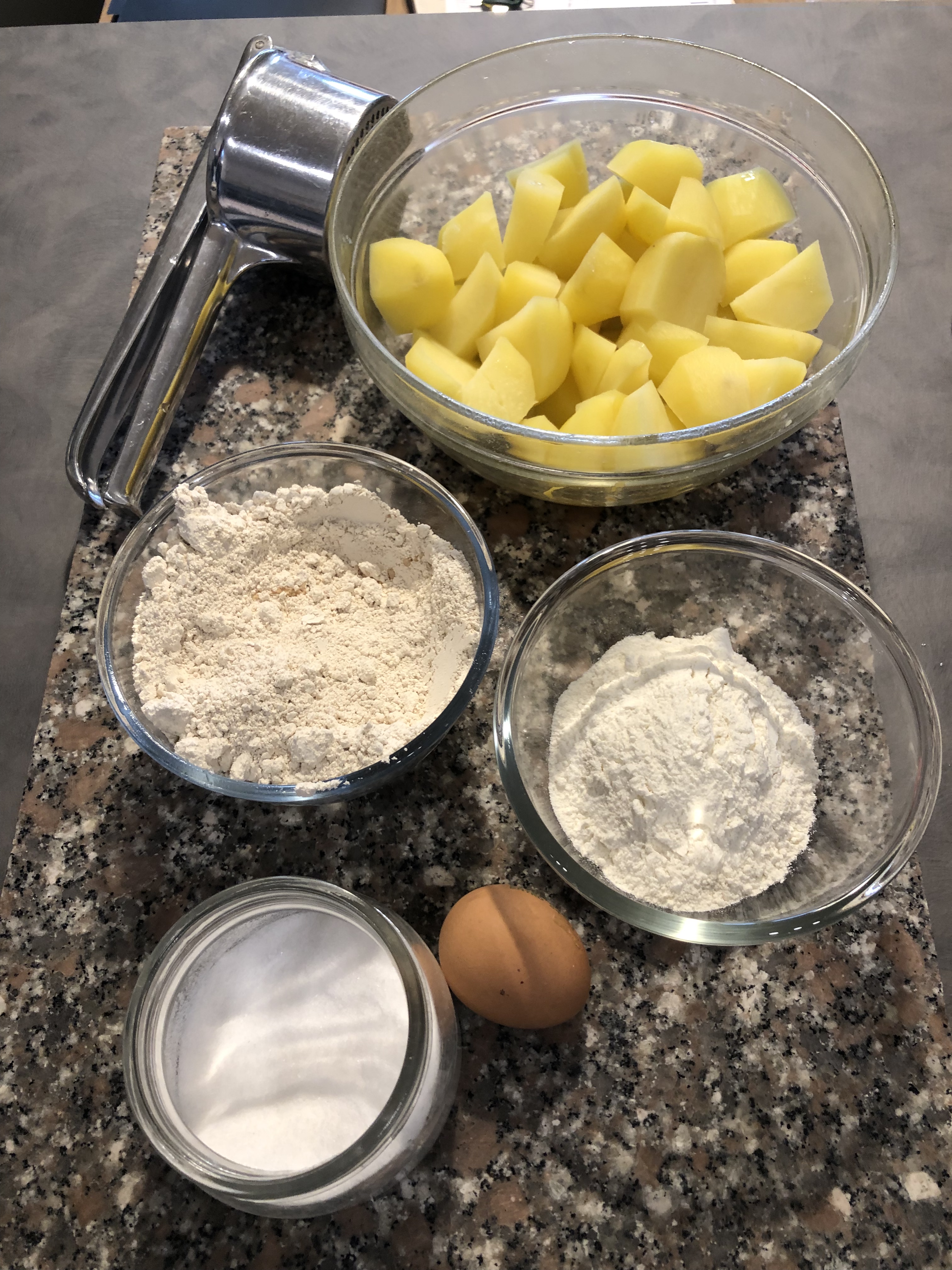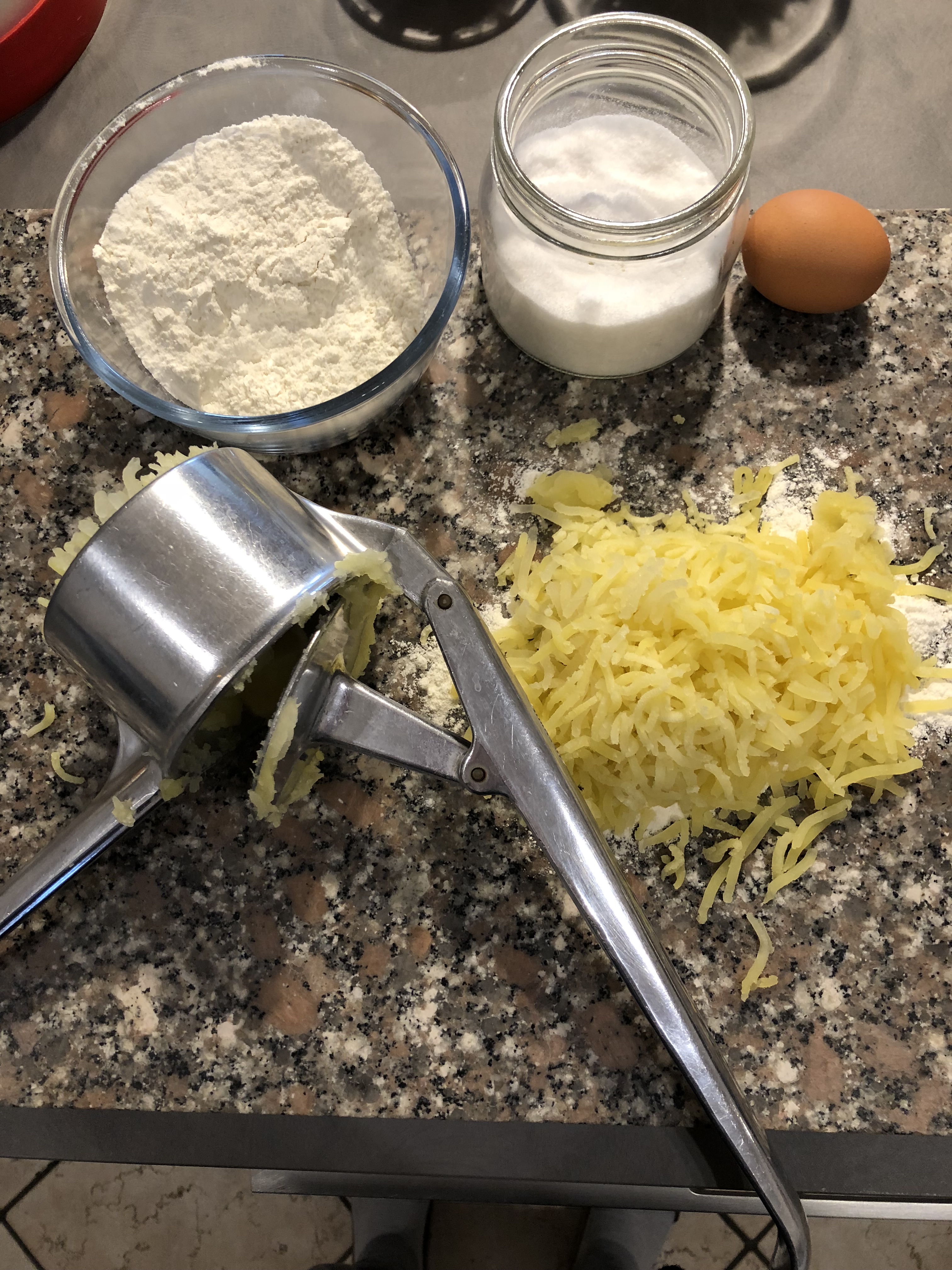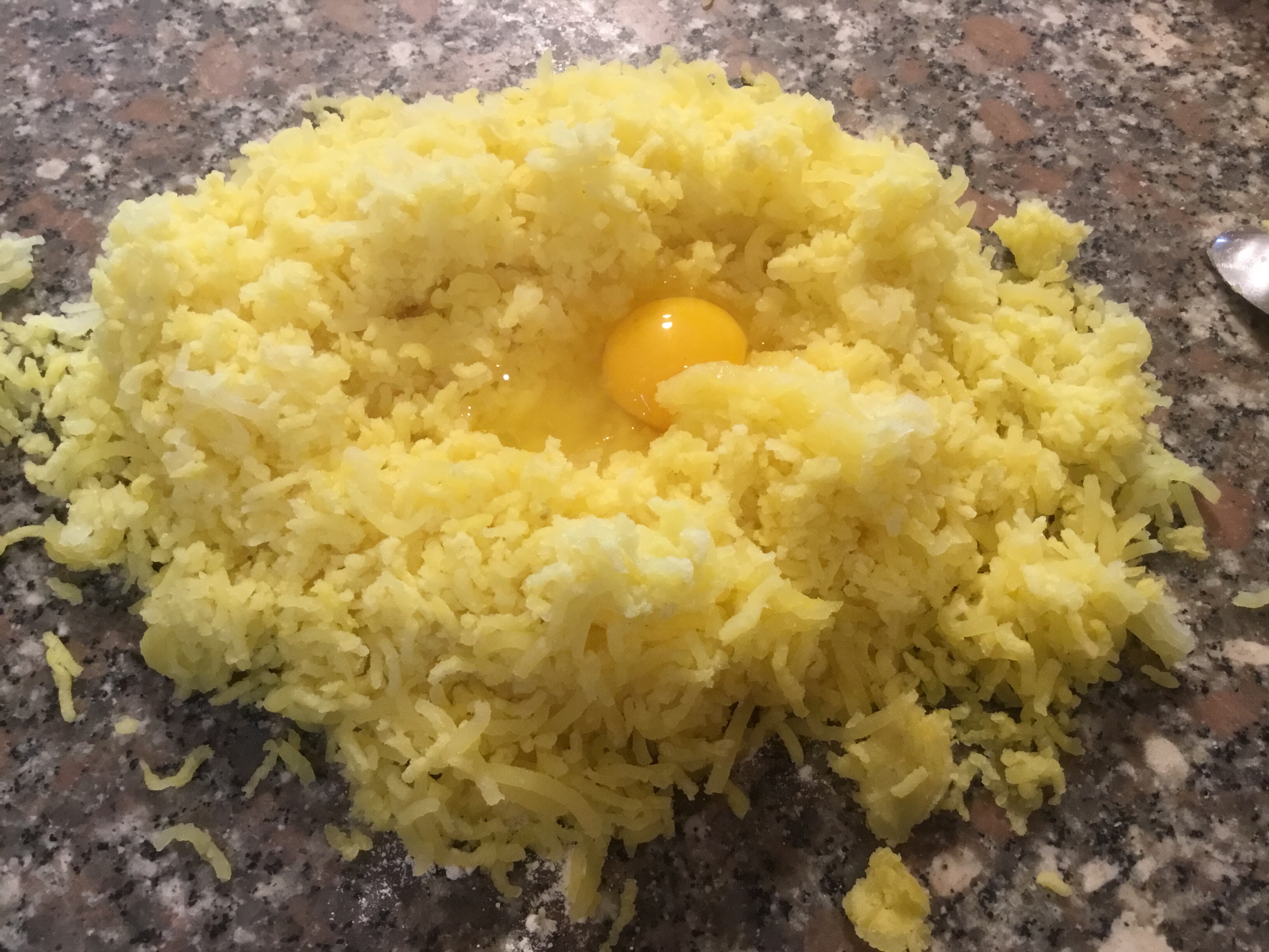 Dopo aver lessato le patate le schiaccio ancora calde con lo schiacciapatate, le lascio raffreddare leggermente, rompo al centro l’uovo, aggiungo la farina e impasto velocemente, la farina potrebbe variare, dipenderà dalla qualità delle patate, ma non lavorate troppo , non deve essere comunque un impasto appiccicoso