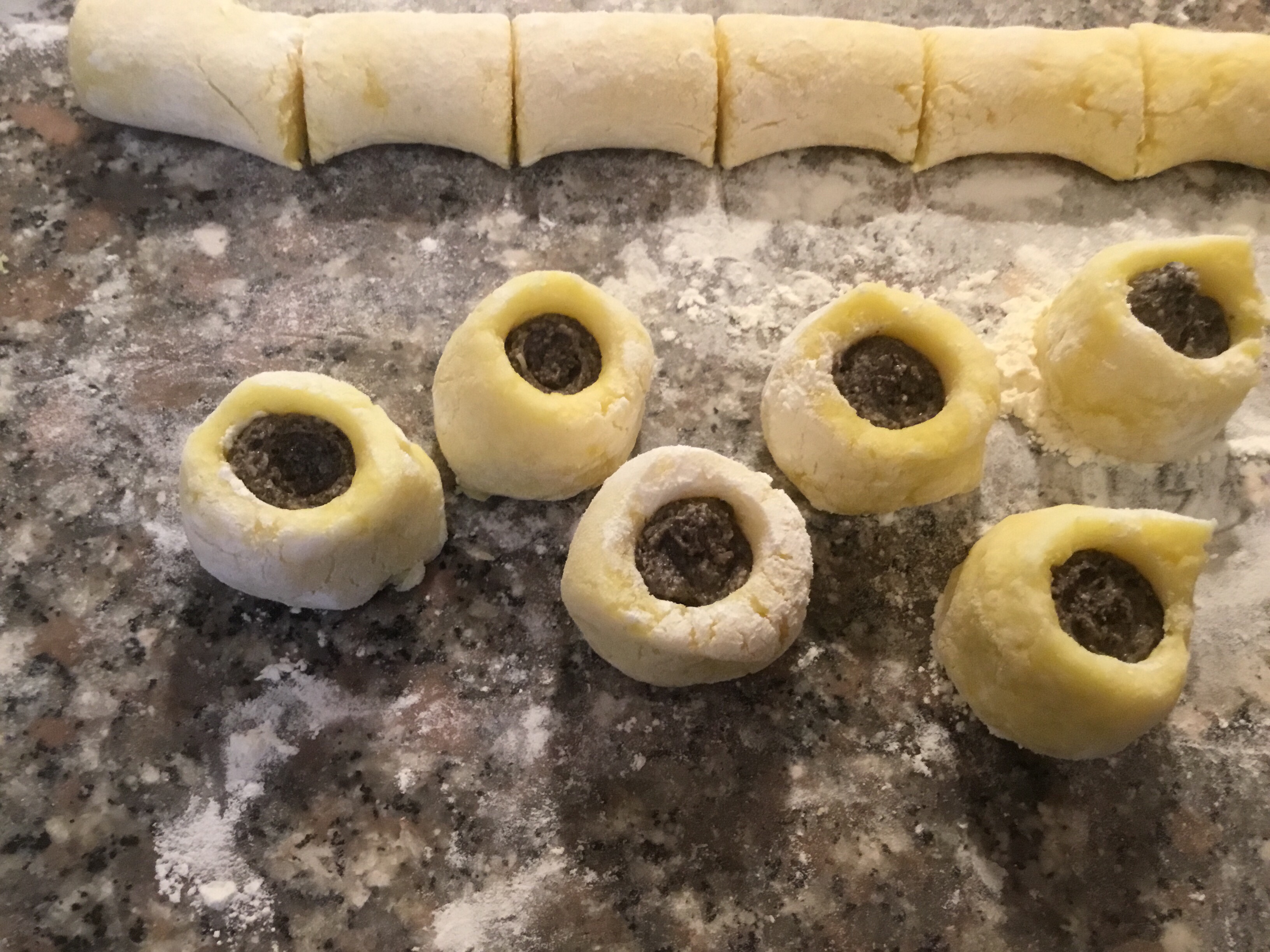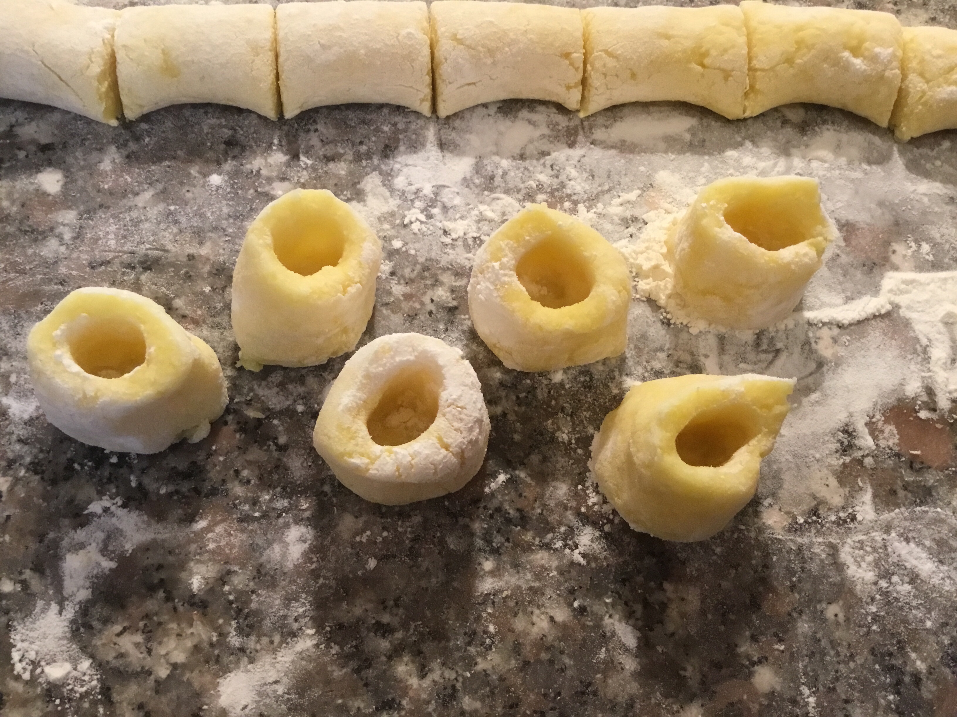 Li metto in piedi sul piano di lavoro infarinato e con il fondo di un cucchiaio di legno infarinato formo un foro al centro