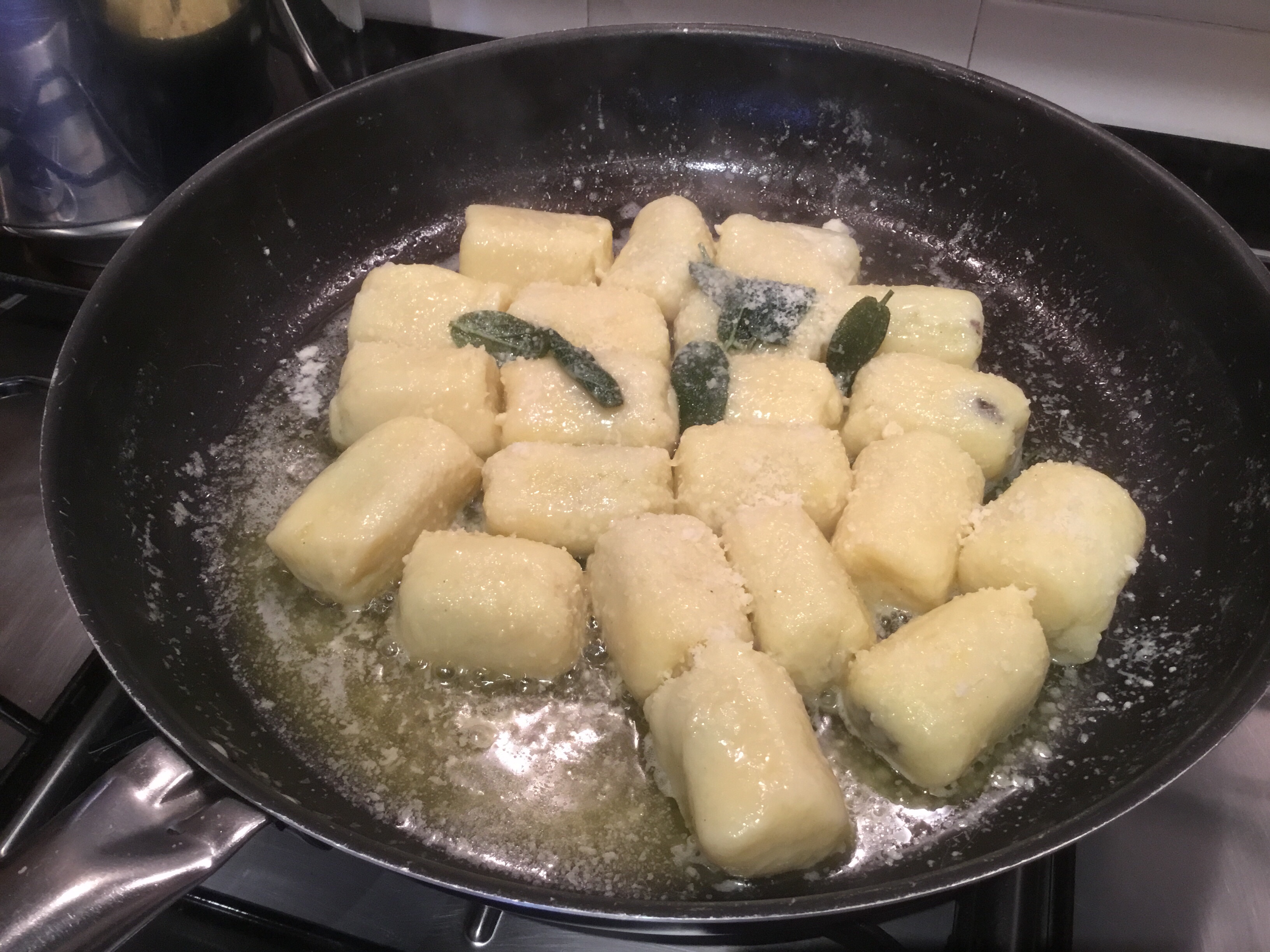 In una larga padella metto il burro e la salvia lascio sciogliere poi unisco qualche cucchiaio di acqua di cottura e aggiungo gli gnocchi, manteco velocemente dopo aver aggiunto una generosa dose di parmigiano