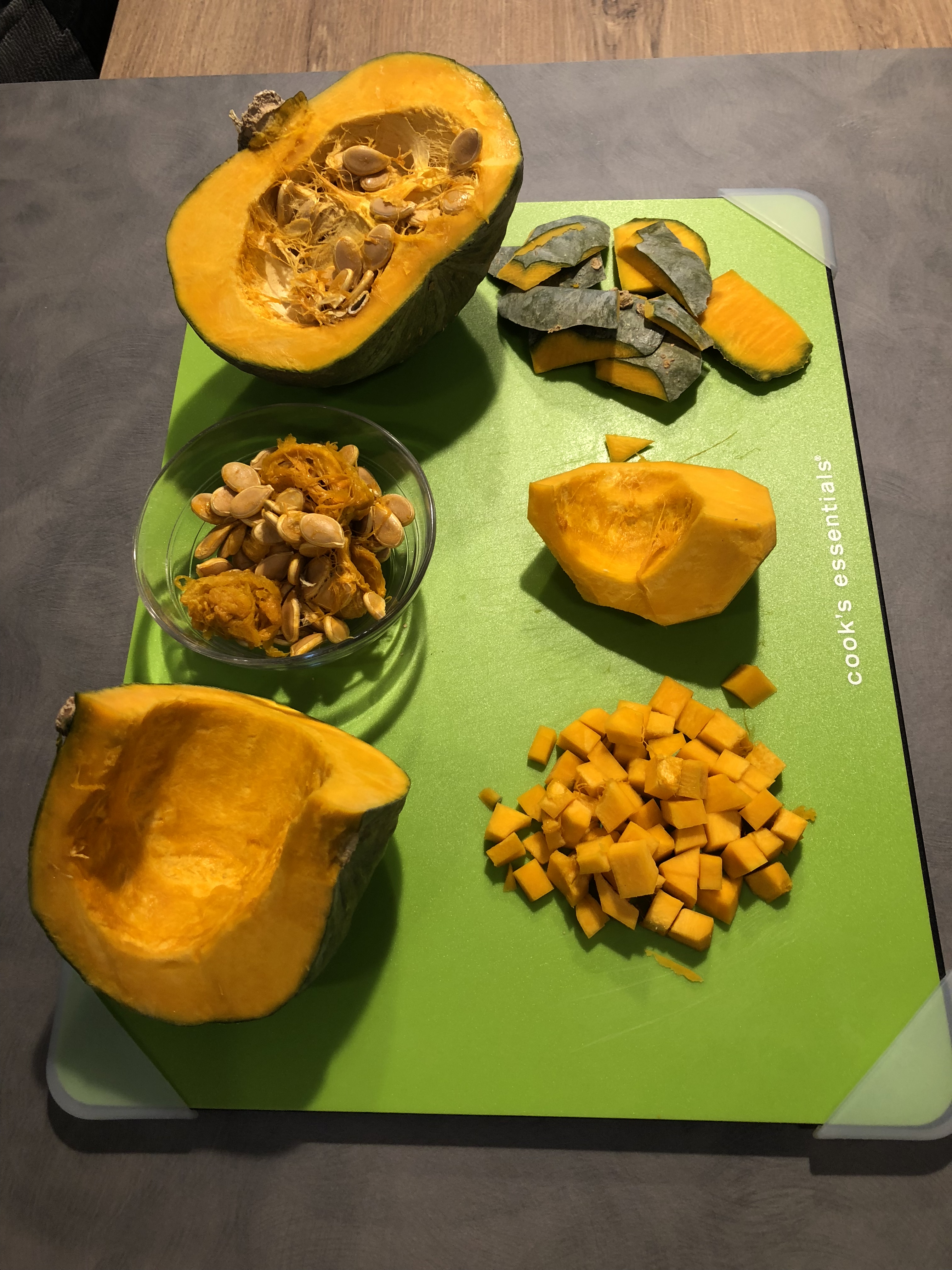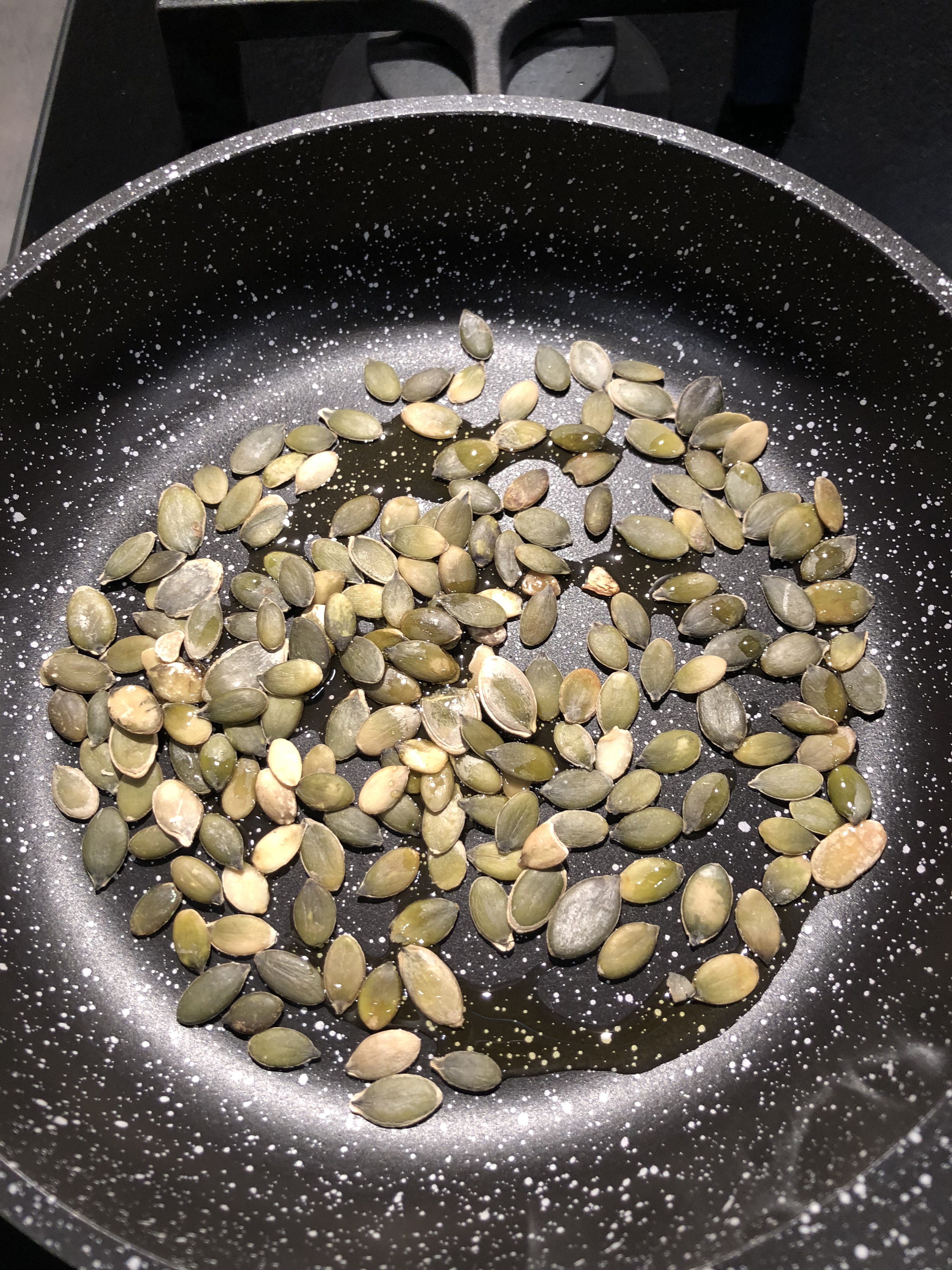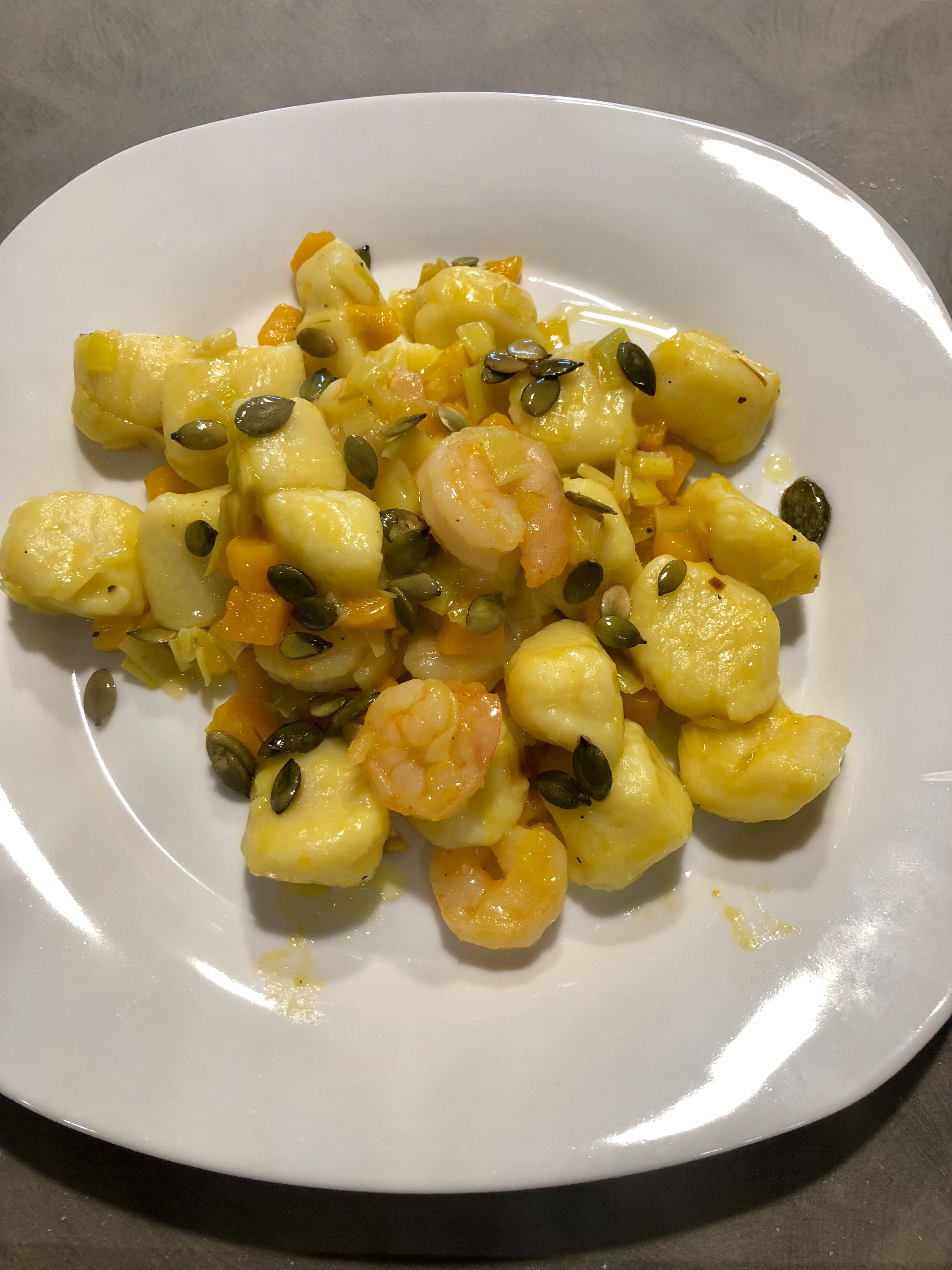 In un padellino appena unto di olio faccio tostare i semi di zucca e li cospergo sopra i gnocchi aggiungo un filo di olio, daranno la parte croccante al piatto