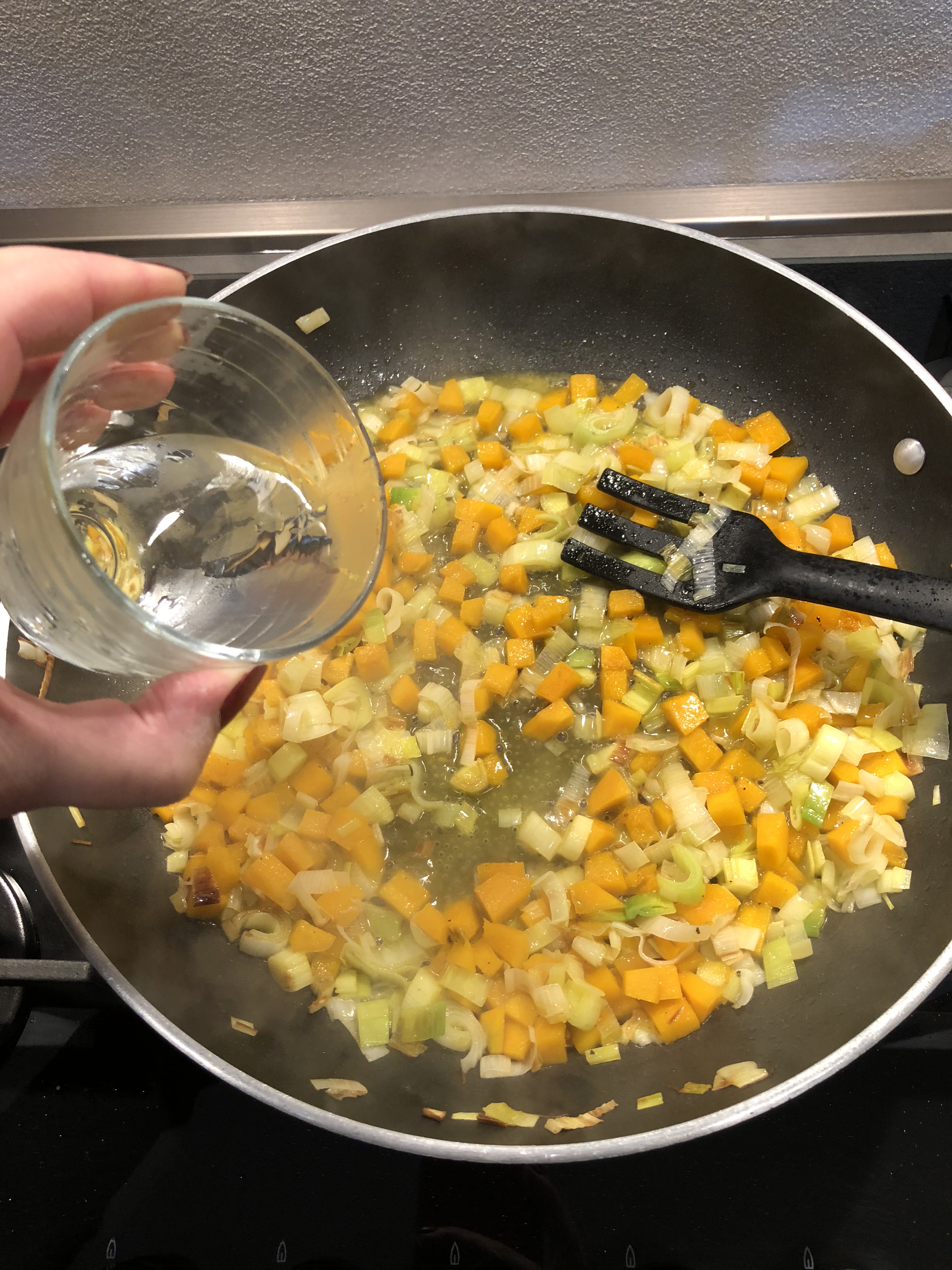 In una larga padella verso abbondante olio extravergine, scaldo e aggiungo i porri e la zucca, sale e pepe e porto a cottura senza stracuocere la zucca aggiungendo poca acqua