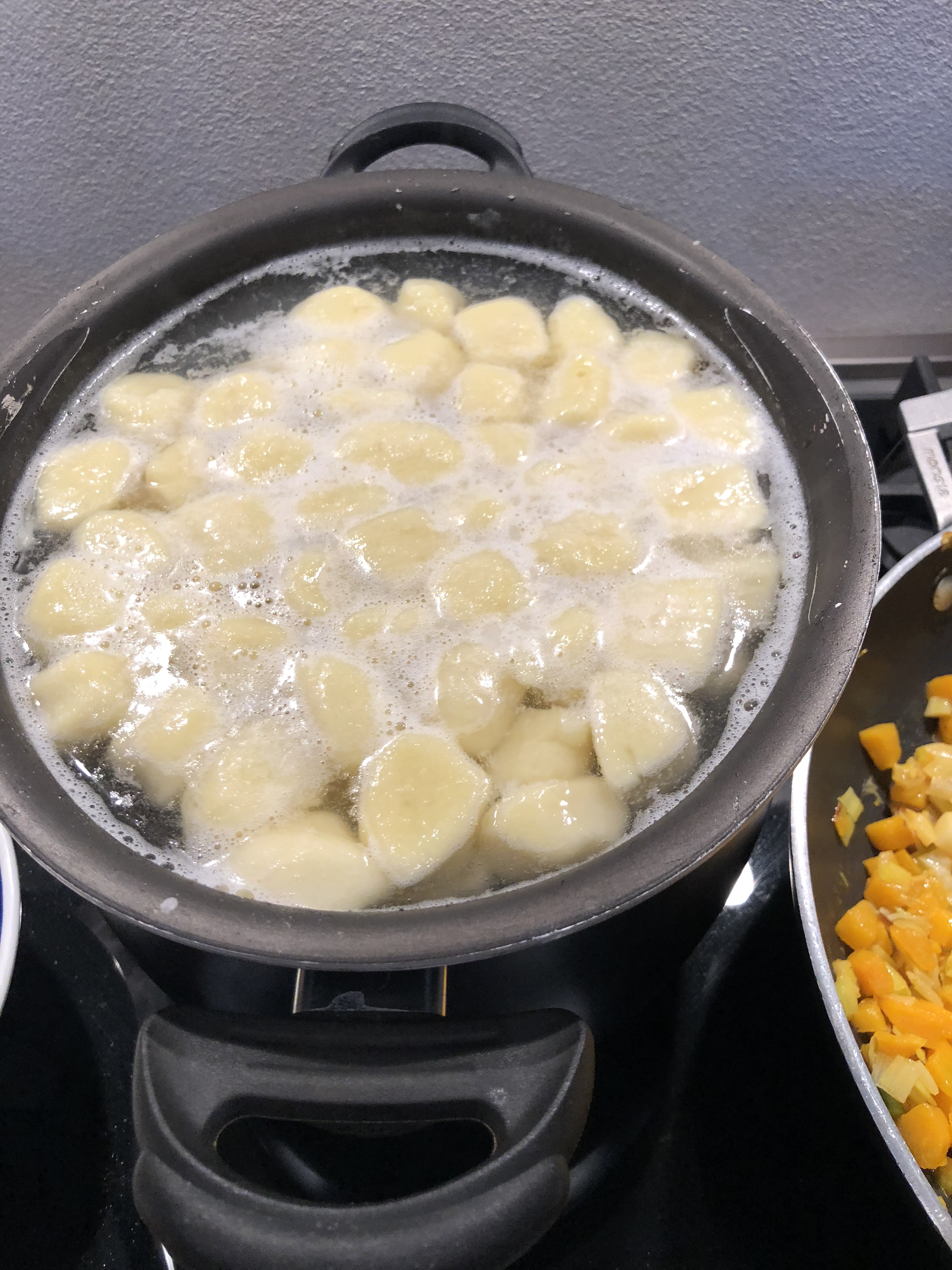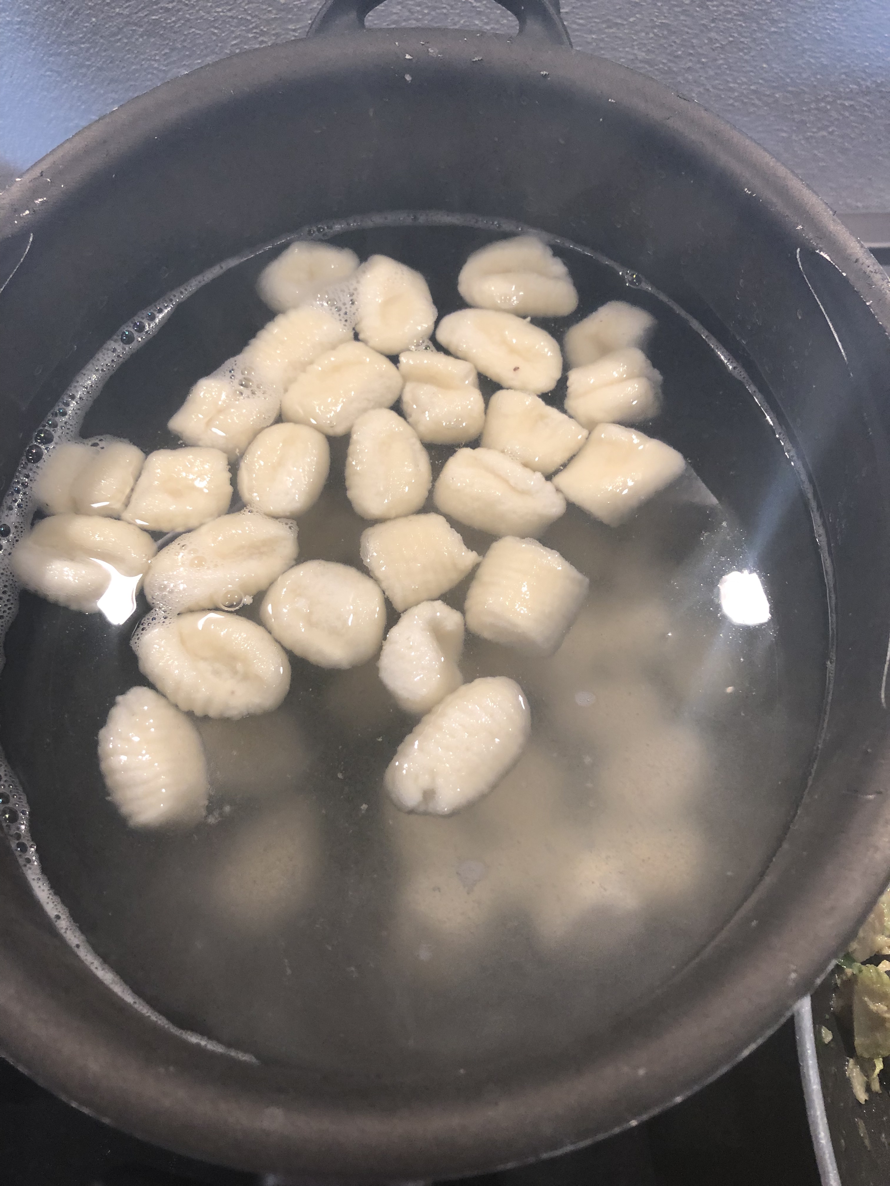 Porto a bollore una pentola con acqua salata e lesso gli gnocchi, sono pronti appena vengono a galla