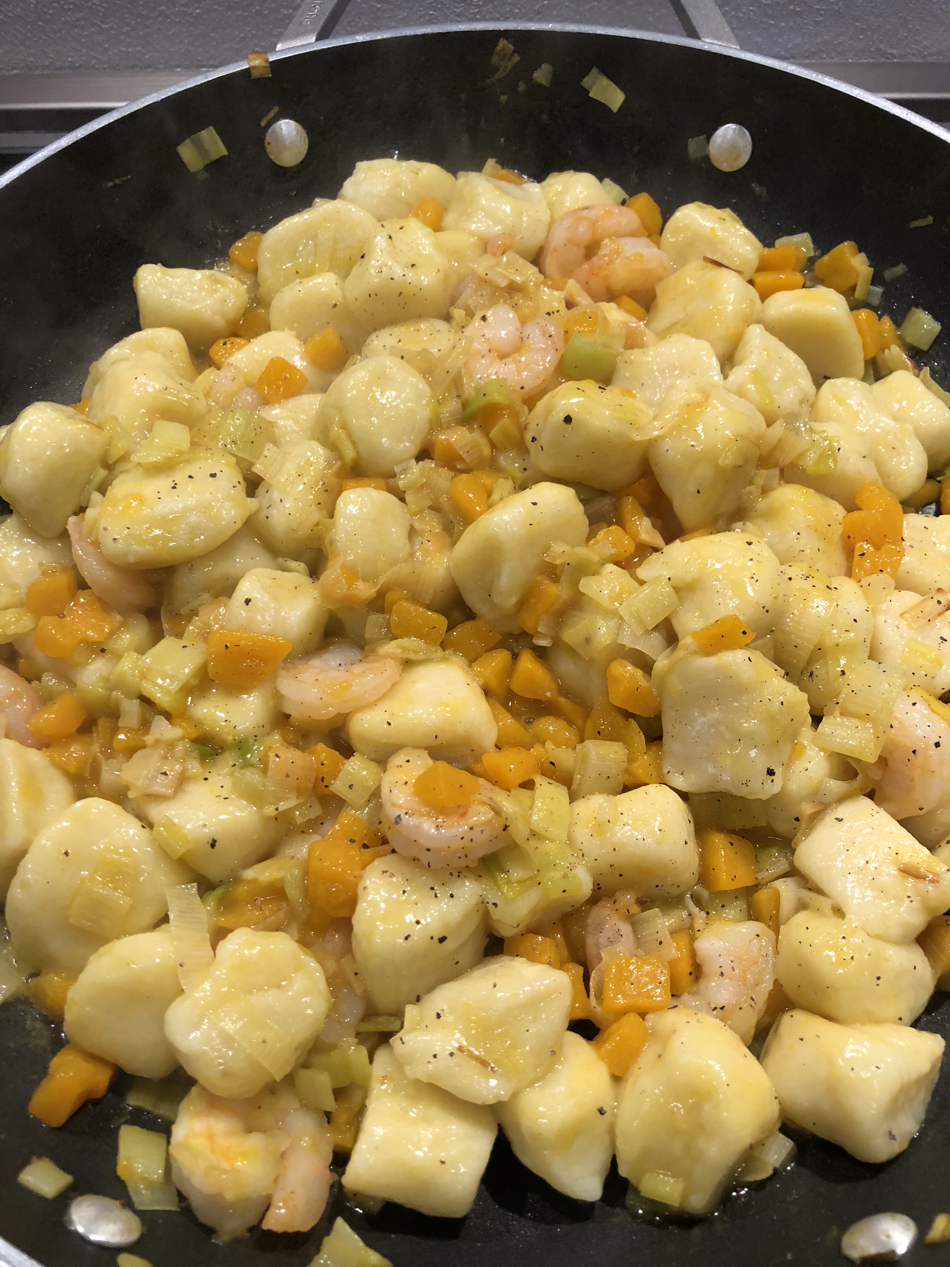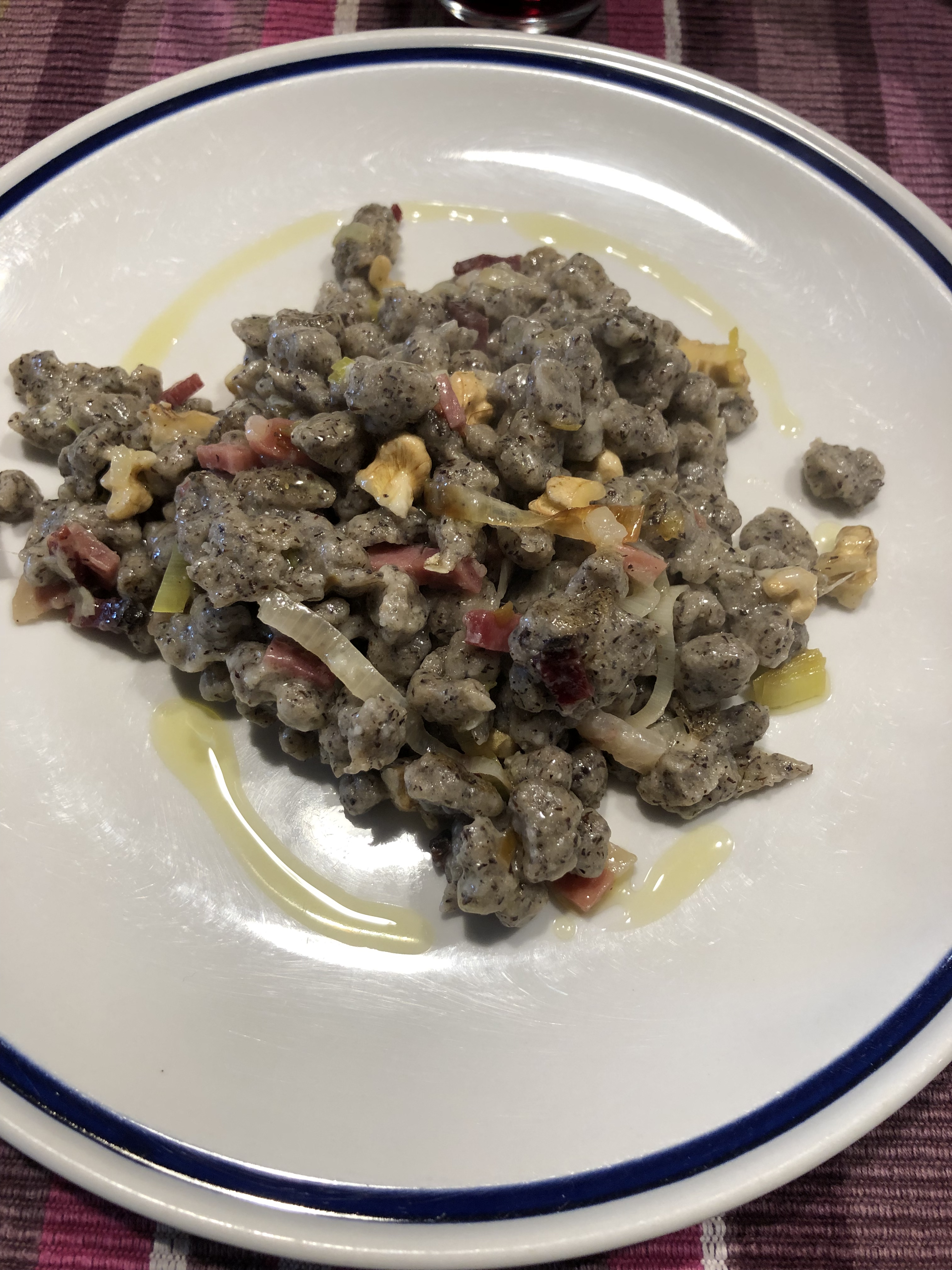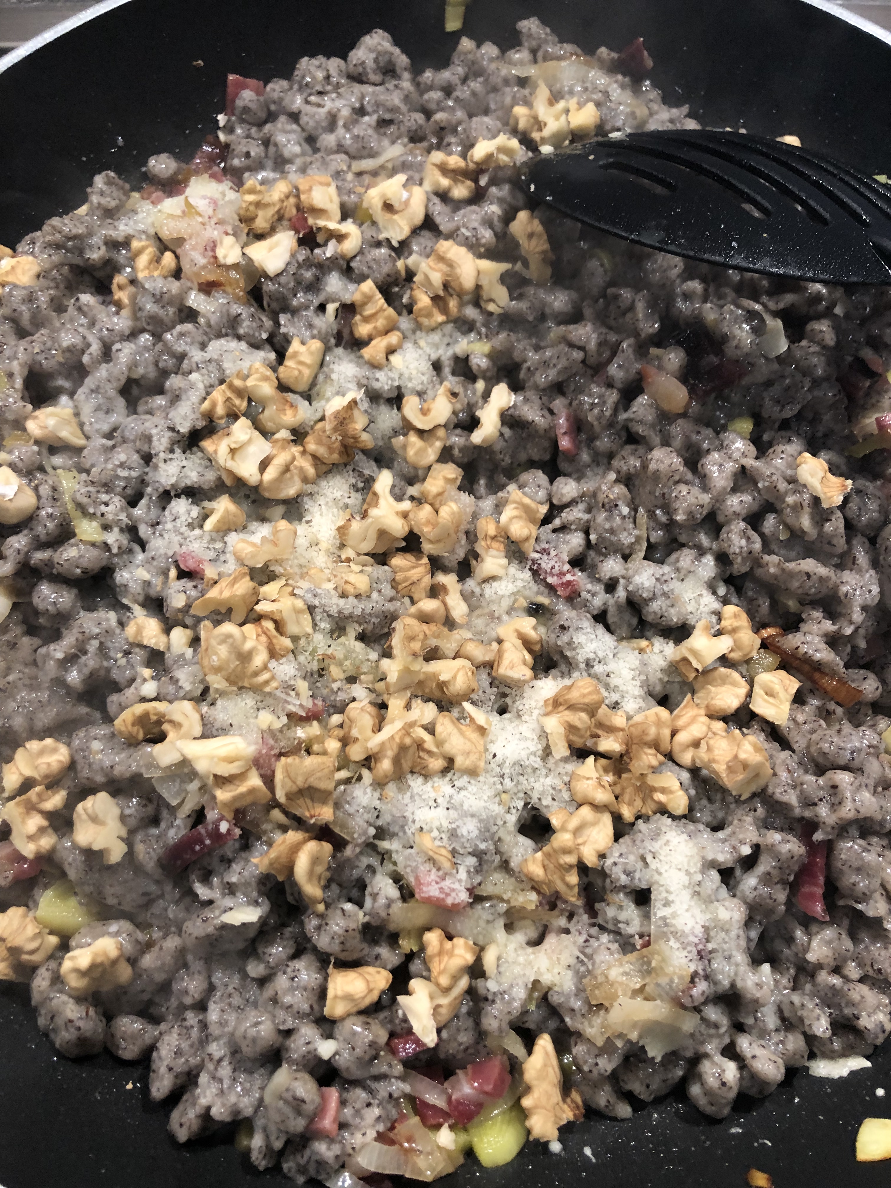 Appena vengono a galla li scolo con un mestolo forato e li metto nella padella con il condimento, aggiungo le noci tritate , una macinata di pepe e il parmigiano grattugiato, un filo di olio e mescolo delicatamente