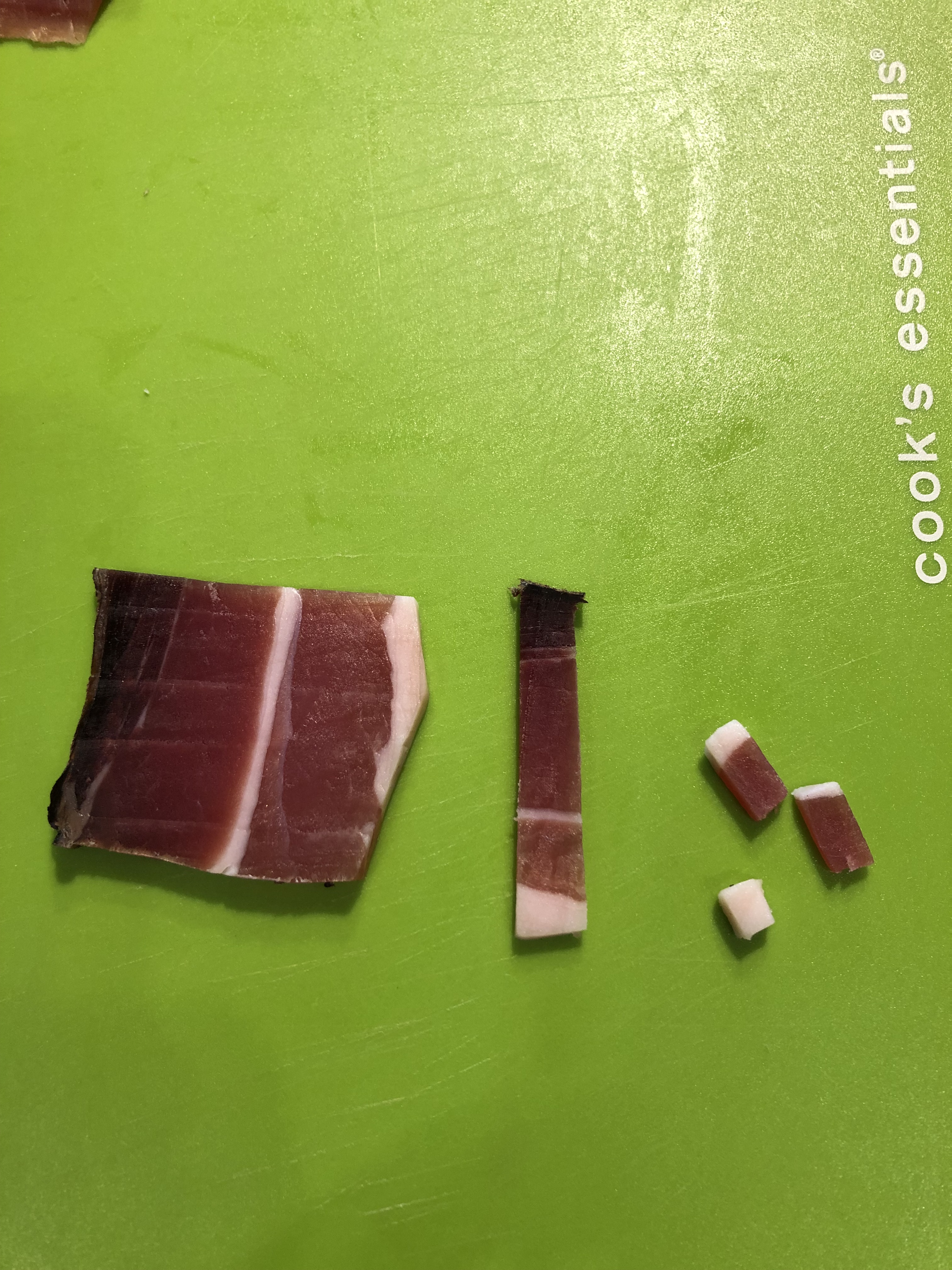 Taglio lo speck a fette sottili poi a striscioline