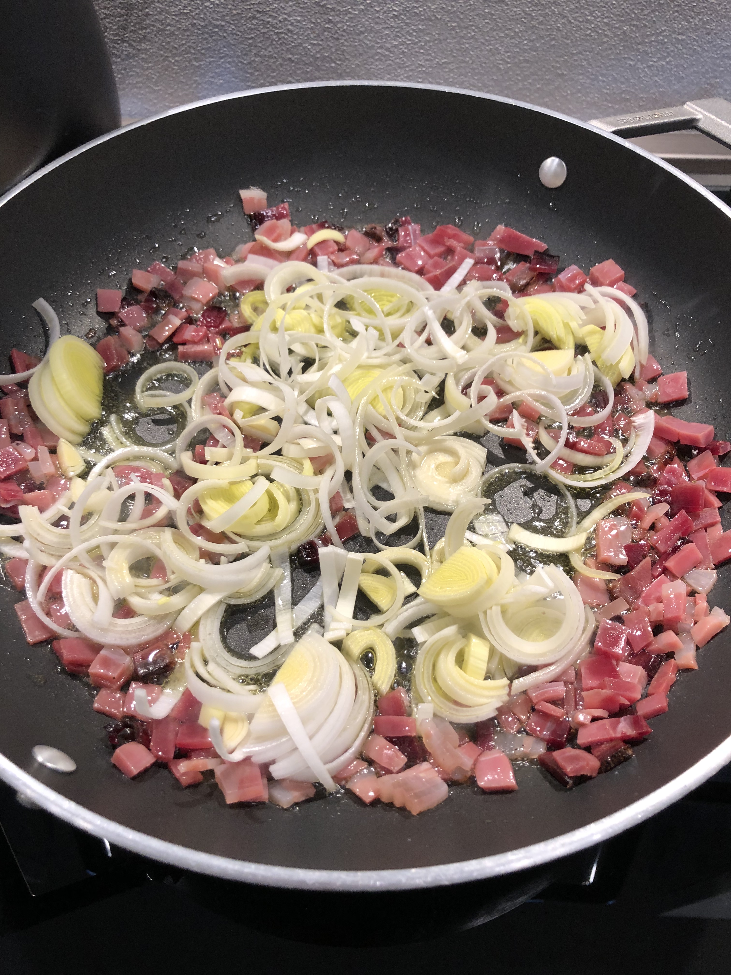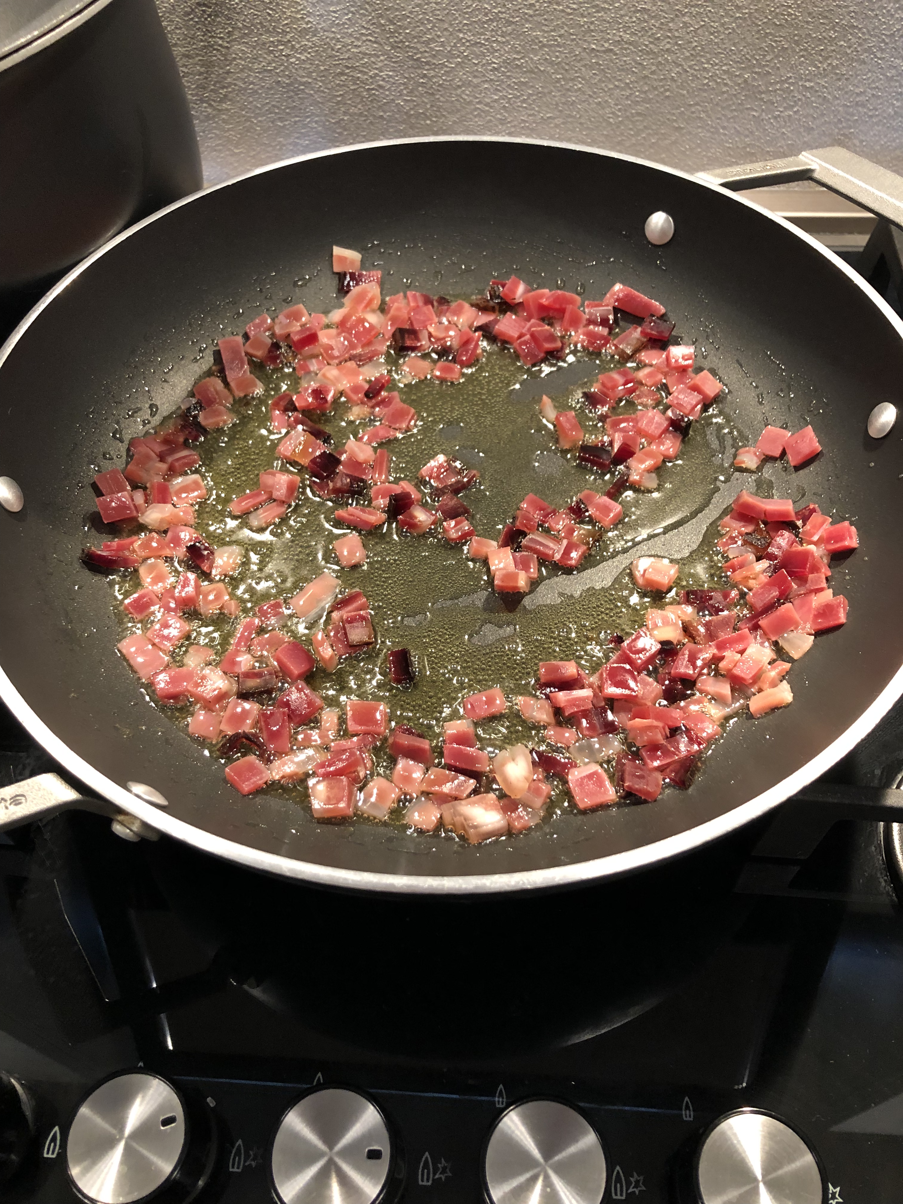In una larga padella metto qualche cucchiaio di olio, lo scaldo e aggiungo lo speck