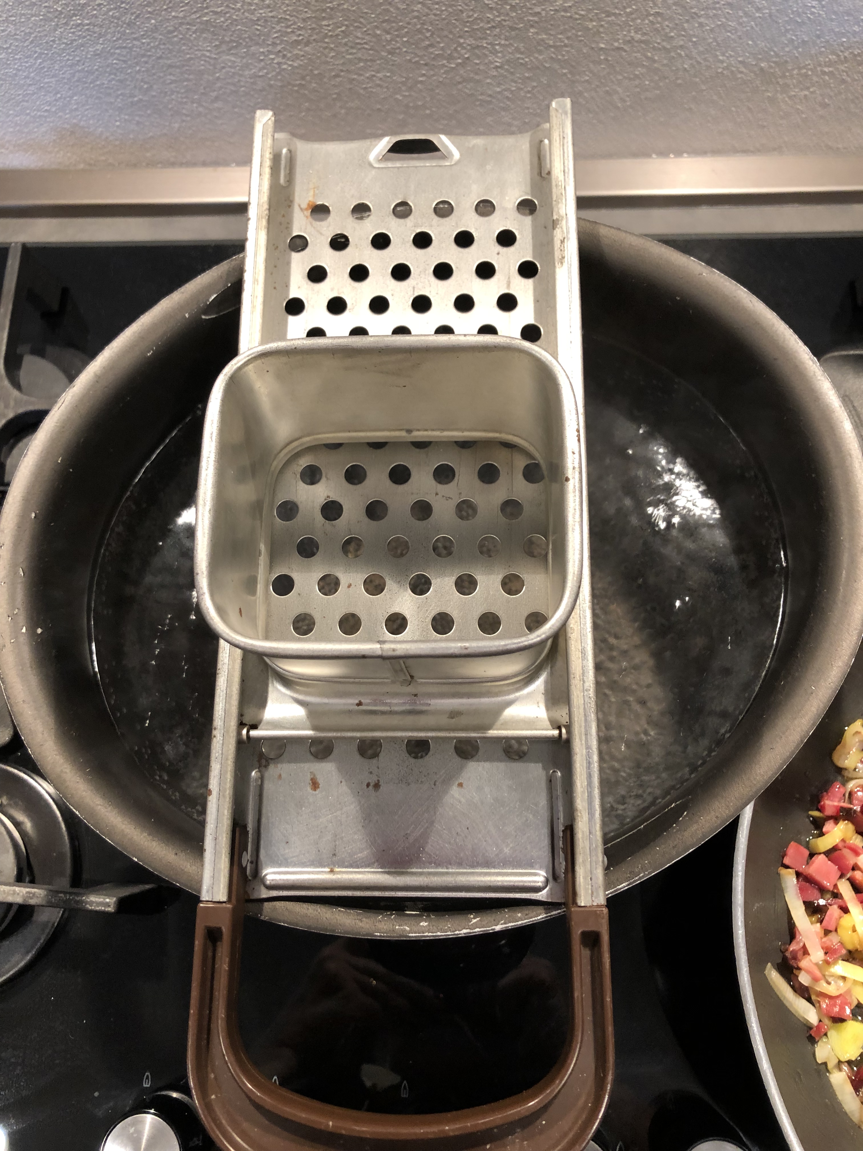 Porto a bollore una grande pentola con acqua e sale e quando bolle appoggio l”attrezzo degli spazle e verso l”impasto nell”apposito spazio