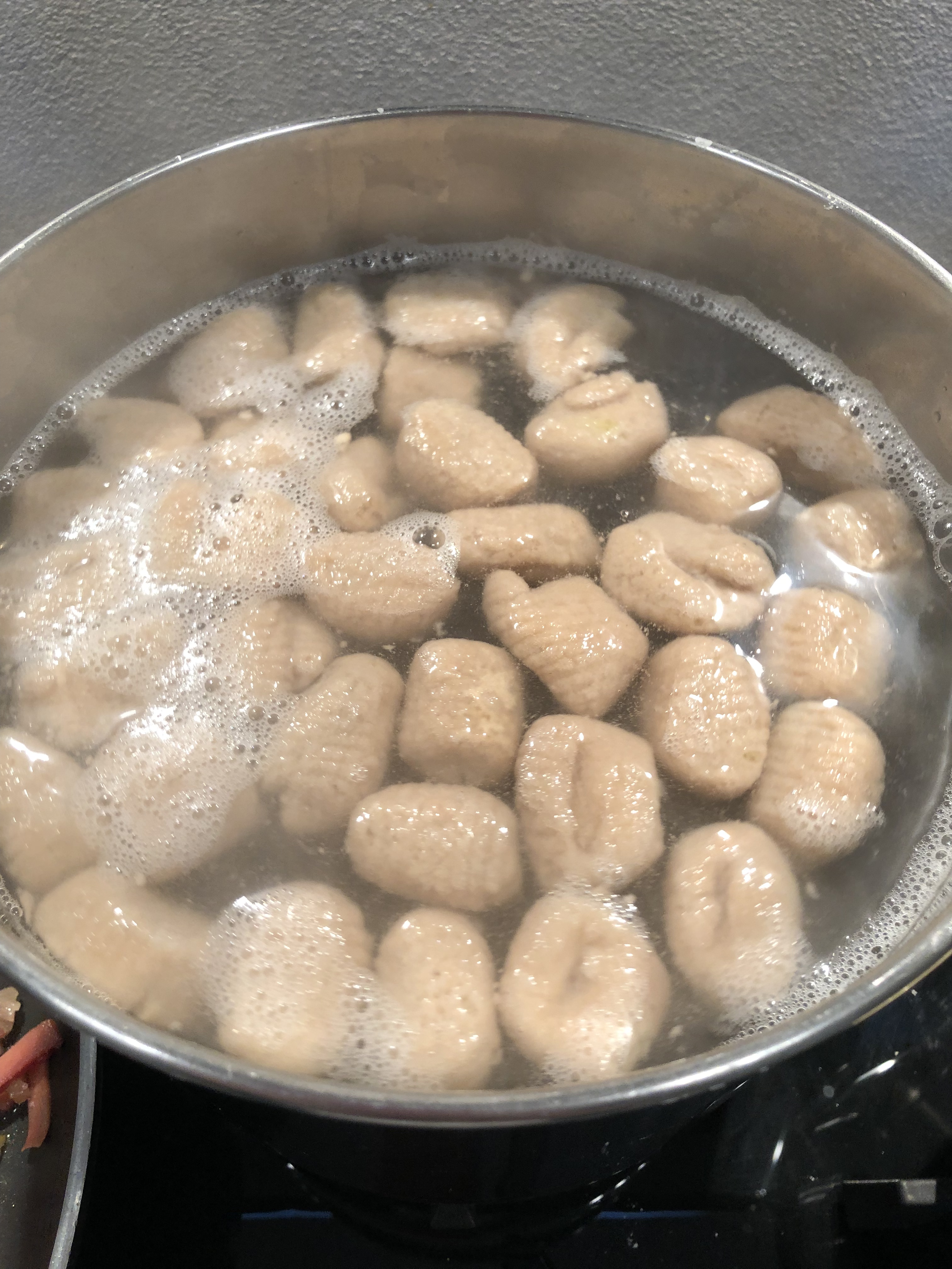 Intanto porto a bollore una pentola con abbondante acqua salata e quando bolle butto gli gnocchi che saranno pronti quando vengono a galla